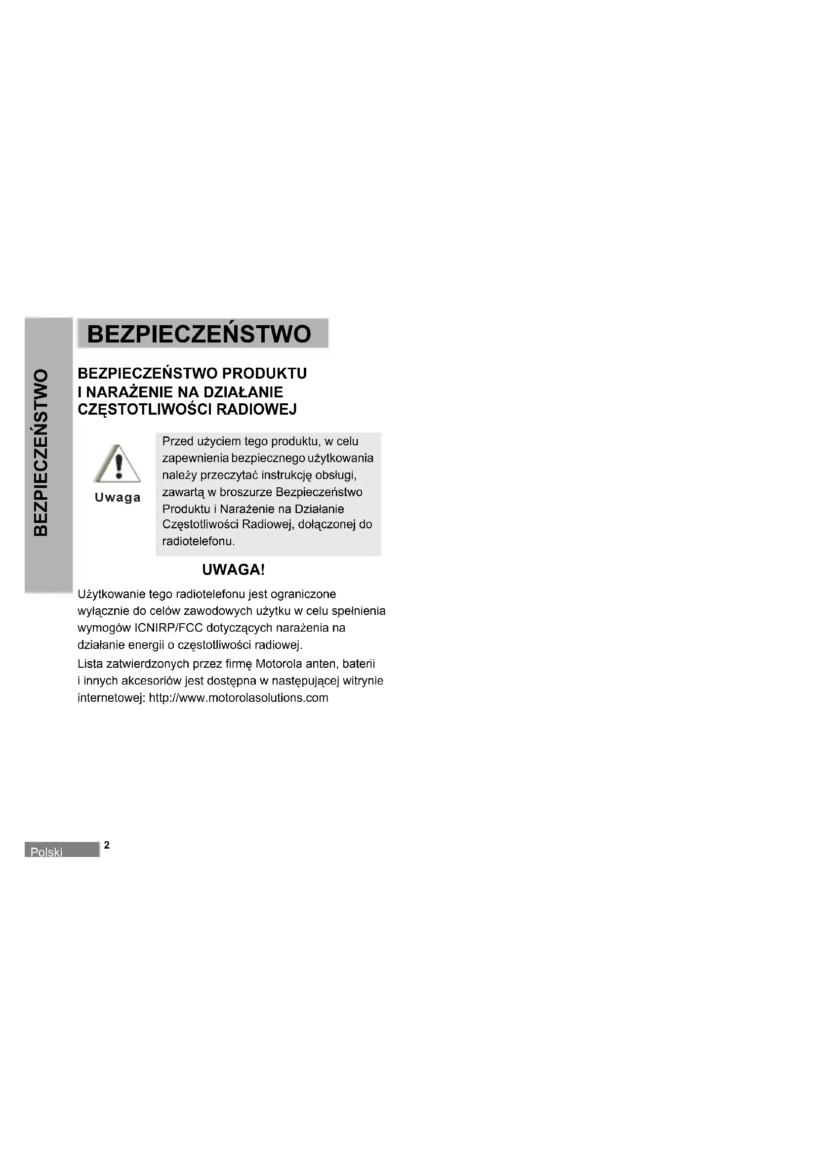 BEZPIECZEēSTWO BEZPIECZEēSTWO BEZPIECZEēSTWO PRODUKTU I NARAĩENIE NA DZIAàANIE CZĉSTOTLIWOĝCI RADIOWEJ UWAGA! UĪytkowanie tego radiotelefonu jest ograniczone wyáącznie do celów zawodowych uĪytku w celu speánienia wymogów ICNIRP/FCC dotyczących naraĪenia na dziaáanie energii o czĊstotliwoĞci radiowej. Lista zatwierdzonych przez firmĊ Motorola anten, baterii i innych akcesoriów jest dostĊpna w nastĊpującej witrynie internetowej: http://www.motorolasolutions.com Przed uĪyciem tego produktu, w celu zapewnienia bezpiecznego uĪytkowania naleĪy przeczytaü instrukcjĊ obsáugi, zawartą w broszurze BezpieczeĔstwo Produktu i NaraĪenie na Dziaáanie CzĊstotliwoĞci Radiowej, doáączonej do radiotelefonu. UwagaPolski