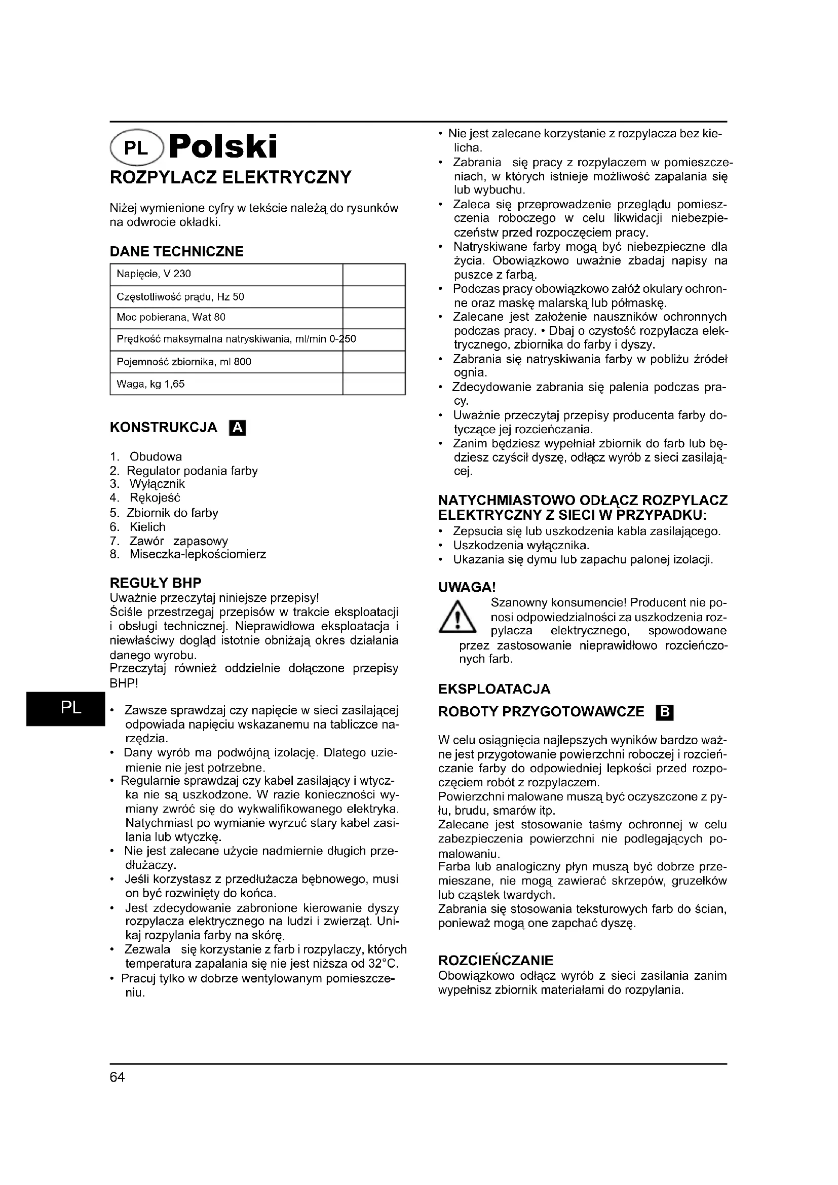 - Ukazania się dymu lub zapachu palonej izolacji. UWAGA! Szanowny konsumencie! Producent nie po- nosi odpowiedzialności za uszkodzenia roz- pylacza elektrycznego, spowodowane przez zastosowanie nieprawidłowo rozcieńczo- nych farb. EKSPLOATACJA ROBOTY PRZYGOTOWAWCZE