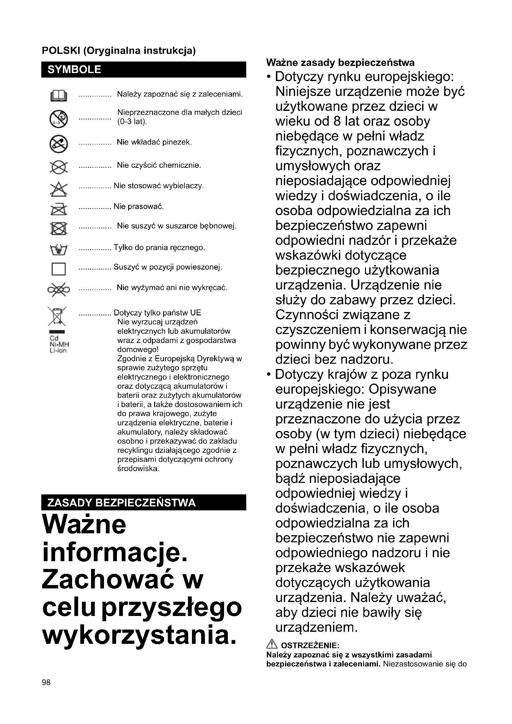 - Dotyczy krajów z poza rynku europejskiego: Opisywane urządzenie nie jest przeznaczone do użycia przez osoby (w tym dzieci) niebędące w pełni władz fizycznych, poznawczych lub umysłowych, bądź nieposiadające odpowiedniej wiedzy i doświadczenia, o ile osoba odpowiedzialna za ich bezpieczeństwo nie zapewni odpowiedniego nadzoru i nie przekaże wskazówek dotyczących użytkowania urządzenia. Należy uważać, aby dzieci nie bawiły się urządzeniem. OSTRZEŻENIE: Należy zapoznać się z wszystkimi zasadami bezpieczeństwa i zaleceniami. Niezastosowanie się do SYMBOLE ............... Należy zapoznać się z zaleceniami.
