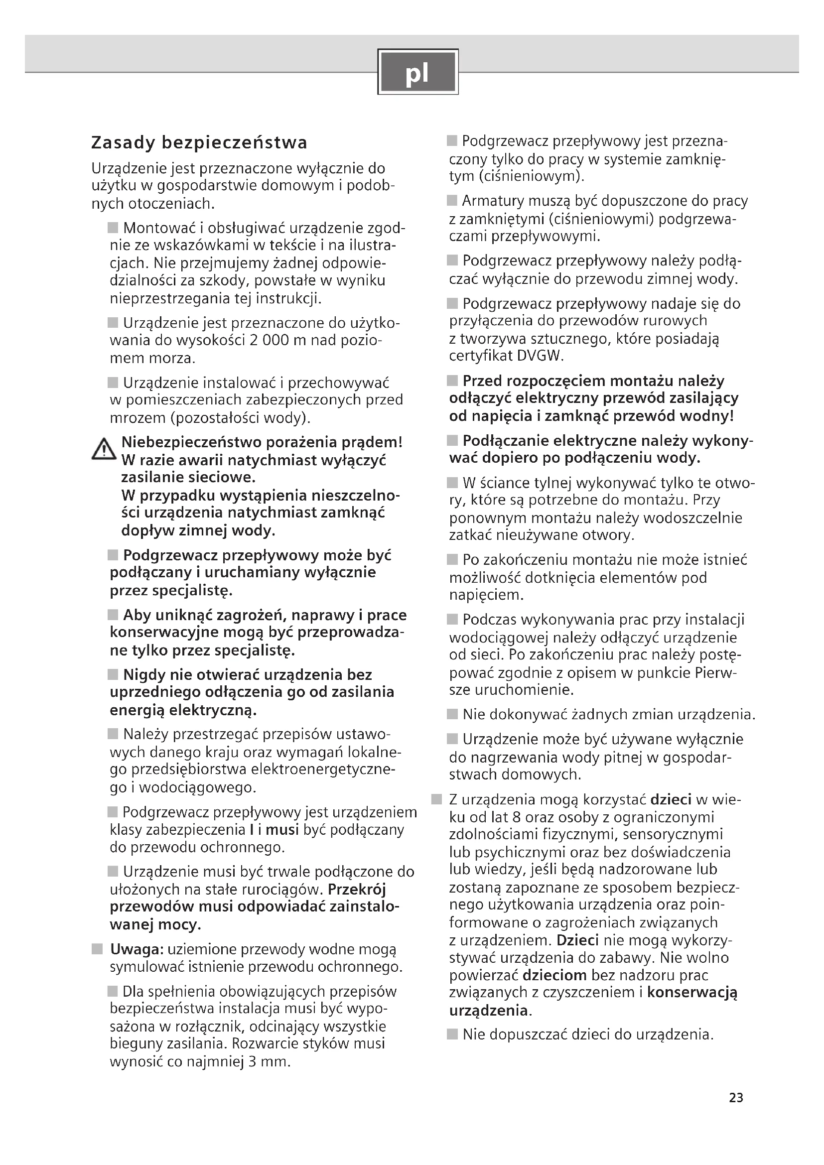 Zasady bezpieczeństwa Urządzenie jest przeznaczone wyłącznie do użytku w gospodarstwie domowym i podob- nych otoczeniach. ■ Montować i obsługiwać urządzenie zgod- nie ze wskazówkami w tekście i na ilustra- cjach. Nie przejmujemy żadnej odpowie- dzialności za szkody, powstałe w wyniku nieprzestrzegania tej instrukcji. ■ Urządzenie jest przeznaczone do użytko- wania do wysokości 2 000 m nad pozio- mem morza. ■ Urządzenie instalować i przechowywać w pomieszczeniach zabezpieczonych przed mrozem (pozostałości wody). Niebezpieczeństwo porażenia prądem! W razie awarii natychmiast wyłączyć zasilanie sieciowe. W przypadku wystąpienia nieszczelno- ści urządzenia natychmiast zamknąć dopływ zimnej wody. ■ Podgrzewacz przepływowy może być podłączany i uruchamiany wyłącznie przez specjalistę. ■ Aby uniknąć zagrożeń, naprawy i prace konserwacyjne mogą być przeprowadza- ne tylko przez specjalistę. ■ Nigdy nie otwierać urządzenia bez uprzedniego odłączenia go od zasilania energią elektryczną. ■ Należy przestrzegać przepisów ustawo- wych danego kraju oraz wymagań lokalne- go przedsiębiorstwa elektroenergetyczne- go i wodociągowego. ■ Podgrzewacz przepływowy jest urządzeniem klasy zabezpieczenia I i musi być podłączany do przewodu ochronnego. ■ Urządzenie musi być trwale podłączone do ułożonych na stałe rurociągów. Przekrój przewodów musi odpowiadać zainstalo- wanej mocy. ■ Uwaga: uziemione przewody wodne mogą symulować istnienie przewodu ochronnego. ■ Dla spełnienia obowiązujących przepisów bezpieczeństwa instalacja musi być wypo- sażona w rozłącznik, odcinający wszystkie bieguny zasilania. Rozwarcie styków musi wynosić co najmniej 3 mm. ■ Podgrzewacz przepływowy jest przezna- czony tylko do pracy w systemie zamknię- tym (ciśnieniowym). ■ Armatury muszą być dopuszczone do pracy z zamkniętymi (ciśnieniowymi) podgrzewa- czami przepływowymi. ■ Podgrzewacz przepływowy należy podłą- czać wyłącznie do przewodu zimnej wody. ■ Podgrzewacz przepływowy nadaje się do przyłączenia do przewodów rurowych z tworzywa sztucznego, które posiadają certyfikat DVGW. ■ Przed rozpoczęciem montażu należy odłączyć elektryczny przewód zasilający od napięcia i zamknąć przewód wodny! ■ Podłączanie elektryczne należy wykony- wać dopiero po podłączeniu wody. ■ W ściance tylnej wykonywać tylko te otwo- ry, które są potrzebne do montażu. Przy ponownym montażu należy wodoszczelnie zatkać nieużywane otwory. ■ Po zakończeniu montażu nie może istnieć możliwość dotknięcia elementów pod napięciem. ■ Podczas wykonywania prac przy instalacji wodociągowej należy odłączyć urządzenie od sieci. Po zakończeniu prac należy postę- pować zgodnie z opisem w punkcie Pierw- sze uruchomienie. ■ Nie dokonywać żadnych zmian urządzenia. ■ Urządzenie może być używane wyłącznie do nagrzewania wody pitnej w gospodar- stwach domowych. ■ Z urządzenia mogą korzystać dzieci w wie- ku od lat 8 oraz osoby z ograniczonymi zdolnościami fizycznymi, sensorycznymi lub psychicznymi oraz bez doświadczenia lub wiedzy, jeśli będą nadzorowane lub zostaną zapoznane ze sposobem bezpiecz- nego użytkowania urządzenia oraz poin- formowane o zagrożeniach związanych z urządzeniem. Dzieci nie mogą wykorzy- stywać urządzenia do zabawy. Nie wolno powierzać dzieciom bez nadzoru prac związanych z czyszczeniem i konserwacją urządzenia. ■ Nie dopuszczać dzieci do urządzenia.24