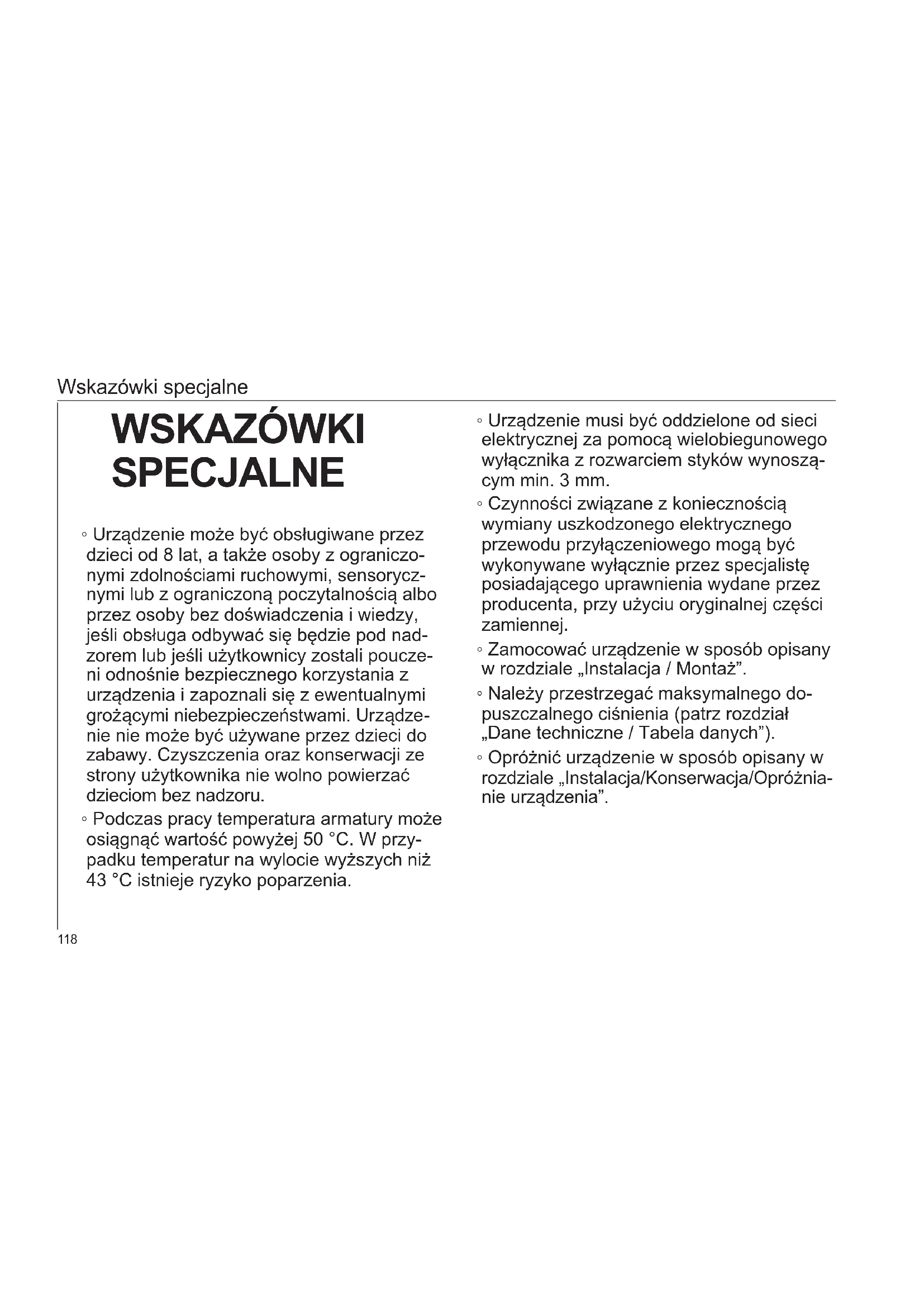 - Podczas pracy temperatura armatury może osiągnąć wartość powyżej 50 °C. W przy- padku temperatur na wylocie wyższych niż 43 °C istnieje ryzyko poparzenia.