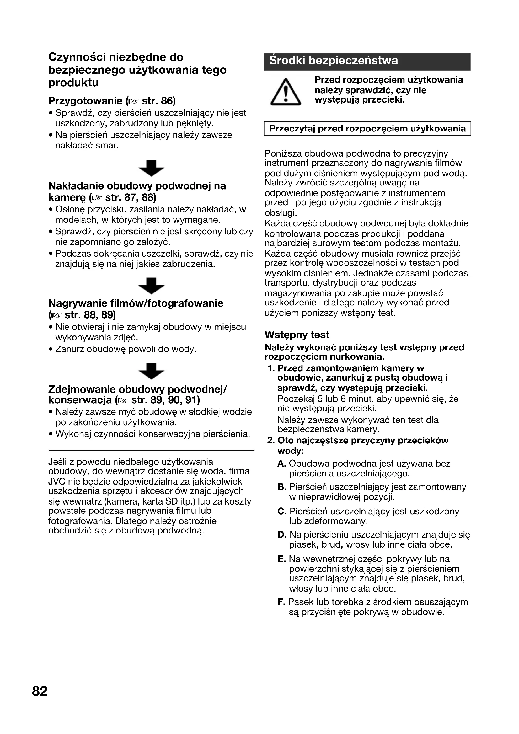 na obudowie nie ma zarysowań lub pęknięć. Obudowa podwodna musi osłaniać kamerę przed ciśnieniem wodnym. Wielokrotne poddawanie działaniu ciśnienia prowadzi do zmęczenia materiału, którego wynikiem może być uszkodzenie obudowy. Przed każdym użyciem kamery, należy sprawdzić, czy nie ma na niej zadrapań ani pęknięć. W przypadku częstego używania obudowy należy przeprowadzić konserwację najlepiej w miejscu zakupu. (Konserwacja jest płatna.) Należy pamiętać o powyższych przyczynach przecieków, aby chronić kamerę i zapewnić jej wydajną pracę. Firma JVC nie będzie odpowiedzialna za przecieki lub uszkodzenie przedmiotów znajdujących się wewnątrz obudowy (kamera, karta SD itp.) z powodu niedbałego użytkowania tego produktu. Należy przestrzegać odpowiednich instrukcji podczas użytkowania obudowy podwodnej.
