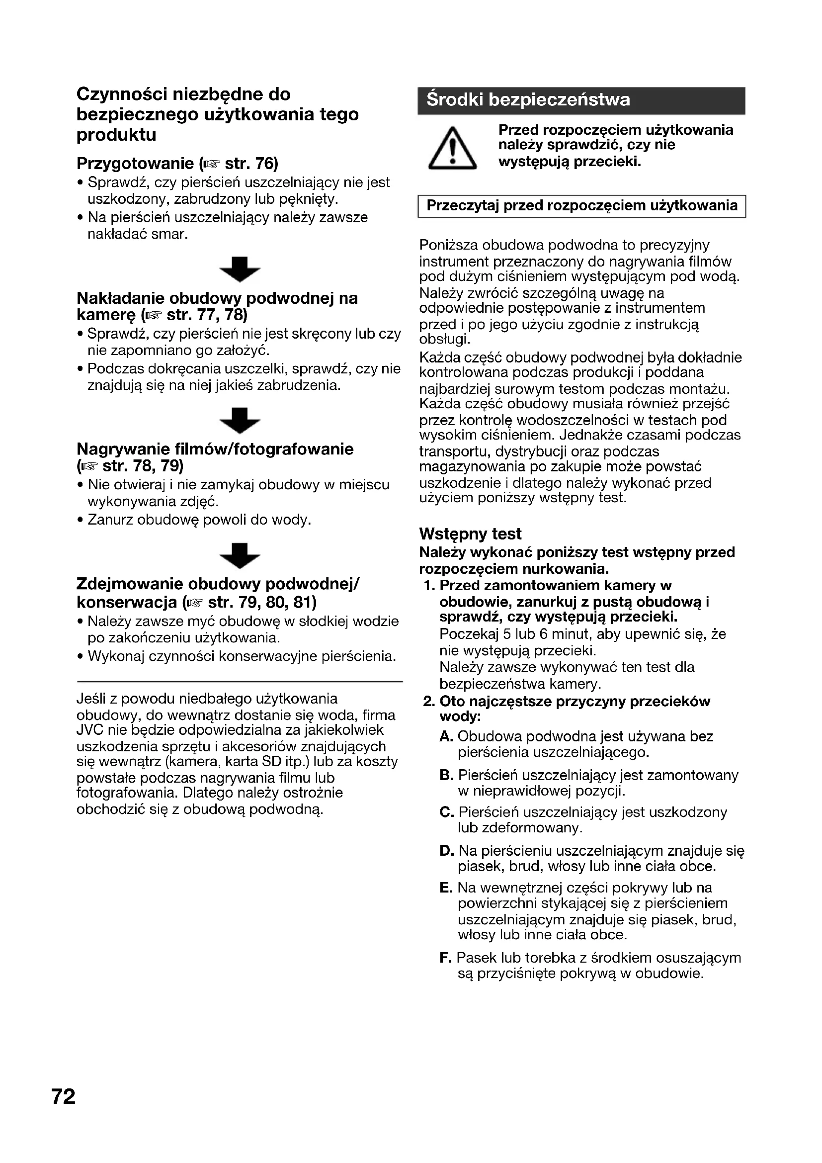 na obudowie nie ma zarysowań lub pęknięć. Obudowa podwodna musi osłaniać kamerę przed ciśnieniem wodnym. Wielokrotne poddawanie działaniu ciśnienia prowadzi do zmęczenia materiału, którego wynikiem może być uszkodzenie obudowy. Przed każdym użyciem kamery, należy sprawdzić, czy nie ma na niej zadrapań ani pęknięć. W przypadku częstego używania obudowy należy przeprowadzić konserwację najlepiej w miejscu zakupu. (Konserwacja jest płatna.) Należy pamiętać o powyższych przyczynach przecieków, aby chronić kamerę i zapewnić jej wydajną pracę. Firma JVC nie będzie odpowiedzialna za przecieki lub uszkodzenie przedmiotów znajdujących się wewnątrz obudowy (kamera, karta SD itp.) z powodu niedbałego użytkowania tego produktu. Należy przestrzegać odpowiednich instrukcji podczas użytkowania obudowy podwodnej.