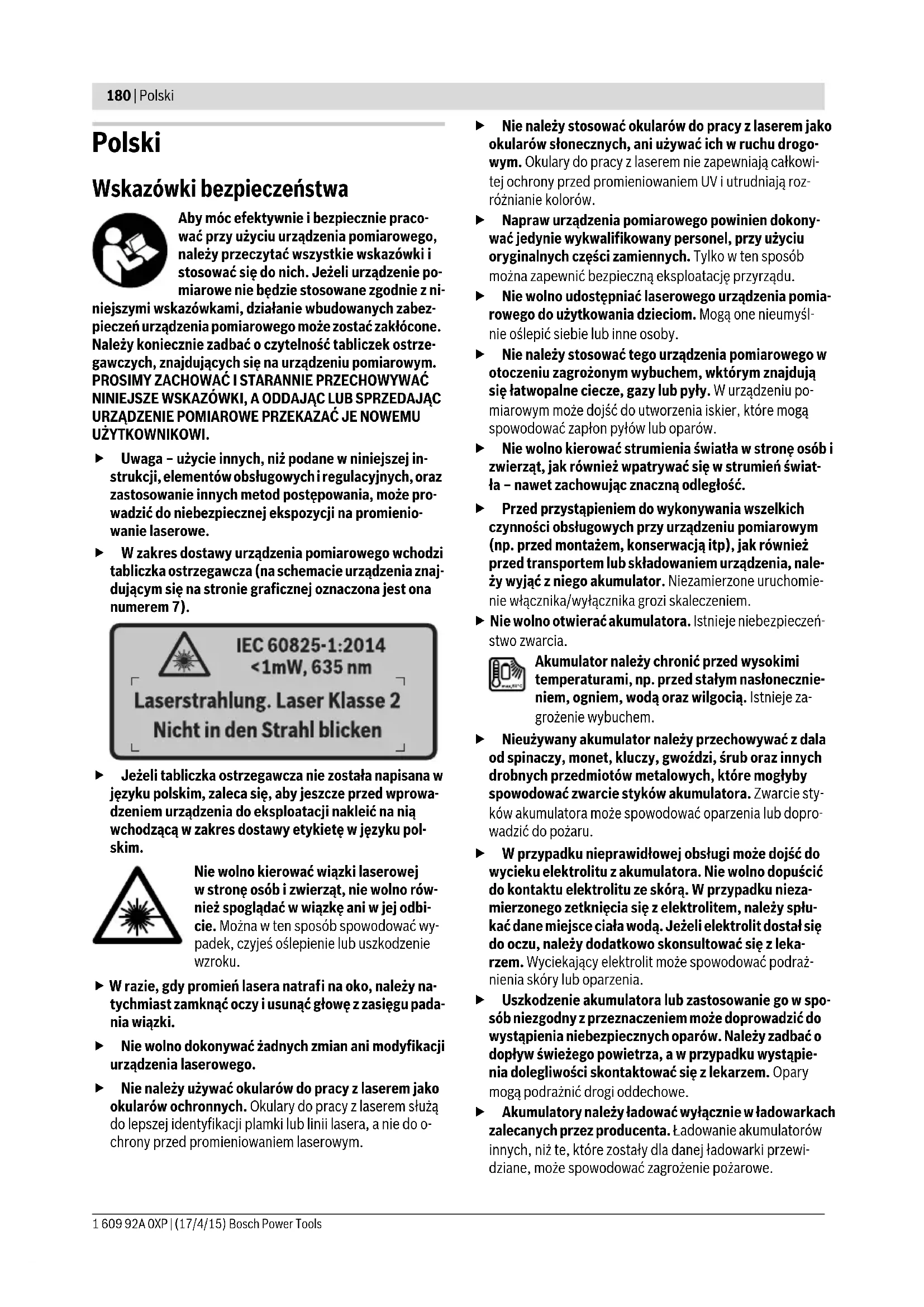 UŻYTKOWNIKOWI. Uwaga – użycie innych, niż podane w niniejszej in- strukcji, elementów obsługowych i regulacyjnych, oraz zastosowanie innych metod postępowania, może pro- wadzić do niebezpiecznej ekspozycji na promienio- wanie laserowe. W zakres dostawy urządzenia pomiarowego wchodzi tabliczka ostrzegawcza (na schemacie urządzenia znaj- dującym się na stronie graficznej oznaczona jest ona numerem 7). Jeżeli tabliczka ostrzegawcza nie została napisana w języku polskim, zaleca się, aby jeszcze przed wprowa- dzeniem urządzenia do eksploatacji nakleić na nią wchodzącą w zakres dostawy etykietę w języku pol- skim. Nie wolno kierować wiązki laserowej w stronę osób i zwierząt, nie wolno rów- nież spoglądać w wiązkę ani w jej odbi- cie. Można w ten sposób spowodować wy- padek, czyjeś oślepienie lub uszkodzenie wzroku. W razie, gdy promień lasera natrafi na oko, należy na- tychmiast zamknąć oczy i usunąć głowę z zasięgu pada- nia wiązki. Nie wolno dokonywać żadnych zmian ani modyfikacji urządzenia laserowego. Nie należy używać okularów do pracy z laserem jako okularów ochronnych. Okulary do pracy z laserem służą do lepszej identyfikacji plamki lub linii lasera, a nie do o- chrony przed promieniowaniem laserowym. Nie należy stosować okularów do pracy z laserem jako okularów słonecznych, ani używać ich w ruchu drogo- wym. Okulary do pracy z laserem nie zapewniają całkowi- tej ochrony przed promieniowaniem UV i utrudniają roz- różnianie kolorów. Napraw urządzenia pomiarowego powinien dokony- wać jedynie wykwalifikowany personel, przy użyciu oryginalnych części zamiennych. Tylko w ten sposób można zapewnić bezpieczną eksploatację przyrządu. Nie wolno udostępniać laserowego urządzenia pomia- rowego do użytkowania dzieciom. Mogą one nieumyśl- nie oślepić siebie lub inne osoby. Nie należy stosować tego urządzenia pomiarowego w otoczeniu zagrożonym wybuchem, wktórym znajdują się łatwopalne ciecze, gazy lub pyły. W urządzeniu po- miarowym może dojść do utworzenia iskier, które mogą spowodować zapłon pyłów lub oparów. Nie wolno kierować strumienia światła w stronę osób i zwierząt, jak również wpatrywać się w strumień świat- ła – nawet zachowując znaczną odległość. Przed przystąpieniem do wykonywania wszelkich czynności obsługowych przy urządzeniu pomiarowym (np. przed montażem, konserwacją itp), jak również przed transportem lub składowaniem urządzenia, nale- ży wyjąć z niego akumulator. Niezamierzone uruchomie- nie włącznika/wyłącznika grozi skaleczeniem. Nie wolno otwierać akumulatora. Istnieje niebezpieczeń- stwo zwarcia. Akumulator należy chronić przed wysokimi temperaturami, np. przed stałym nasłonecznie- niem, ogniem, wodą oraz wilgocią. Istnieje za- grożenie wybuchem. Nieużywany akumulator należy przechowywać z dala od spinaczy, monet, kluczy, gwoździ, śrub oraz innych drobnych przedmiotów metalowych, które mogłyby spowodować zwarcie styków akumulatora. Zwarcie sty- ków akumulatora może spowodować oparzenia lub dopro- wadzić do pożaru. W przypadku nieprawidłowej obsługi może dojść do wycieku elektrolitu z akumulatora. Nie wolno dopuścić do kontaktu elektrolitu ze skórą. W przypadku nieza- mierzonego zetknięcia się z elektrolitem, należy spłu- kać dane miejsce ciała wodą. Jeżeli elektrolit dostał się do oczu, należy dodatkowo skonsultować się z leka- rzem. Wyciekający elektrolit może spowodować podraż- nienia skóry lub oparzenia. Uszkodzenie akumulatora lub zastosowanie go w spo- sób niezgodny z przeznaczeniem może doprowadzić do wystąpienia niebezpiecznych oparów. Należy zadbać o dopływ świeżego powietrza, a w przypadku wystąpie- nia dolegliwości skontaktować się z lekarzem. Opary mogą podrażnić drogi oddechowe. Akumulatory należy ładować wyłącznie w ładowarkach zalecanych przez producenta. Ładowanie akumulatorów innych, niż te, które zostały dla danej ładowarki przewi- dziane, może spowodować zagrożenie pożarowe. OBJ_BUCH-2270-002.book Page 180 Friday, April 17, 2015 9:48 AMPolski | 181 Bosch Power Tools 1 609 92A 0XP | (17/4/15) Akumulator należy używać tylko w połączeniu z wyro- bem firmy Bosch, dla którego został on przewidziany. Tylko w ten sposób można ochronić akumulator przed nie- bezpiecznym dla niego przeciążeniem. Stosować należy wyłącznie oryginalne akumulatory fir- my Bosch, o napięciu podanym na tabliczce znamiono- wej nabytego urządzenia pomiarowego. Użycie innych akumulatorów, np. podróbek, przeróbek lub akumulato- rów innych producentów może stać się przyczyną skale- czeń lub wystąpienia szkód materialnych powstałych w wyniku eksplozji akumulatora. Ostre przedmioty, takie jak na przykład gwoździe lub śrubokręt, a także działanie sił zewnętrznych mogą spowodować uszkodzenie akumulatora. Może wówczas dojść do zwarcia wewnętrznego akumulatora i do jego przepalenia, eksplozji lub przegrzania. Uwaga! Podczas pracy z urządzeniami pomiarowymi z funkcją Bluetooth® może dojść do zakłócenia działania innych urządzeń i instalacji, samolotów i urządzeń me- dycznych (np. rozruszników serca, aparatów słucho- wych). Szkodliwy wpływ na ludzi i zwierzęta, przeby- wające w bezpośredniej bliskości też nie jest całkowi- cie wykluczony. Nie należy stosować urządzenia po- miarowego z funkcją Bluetooth® w pobliżu urządzeń medycznych, stacji benzynowych, zakładów chemicz- nych, ani w rejonach zagrożonych wybuchem. Nie wol- no użytkować urządzenia pomiarowego z funkcją Blue- tooth® w samolotach. Jeżeli urządzenie znajduje się w bezpośredniej bliskości ciała, nie należy pracować przez zbyt długi okres czasu. Towarowy znak słowny Bluetooth® oraz znaki graficzne (logotypy) stanowią własność firmy BluetoothSIG, Inc. Wszelkie wykorzystanie tych znaków przez firmę Robert Bosch GmbH