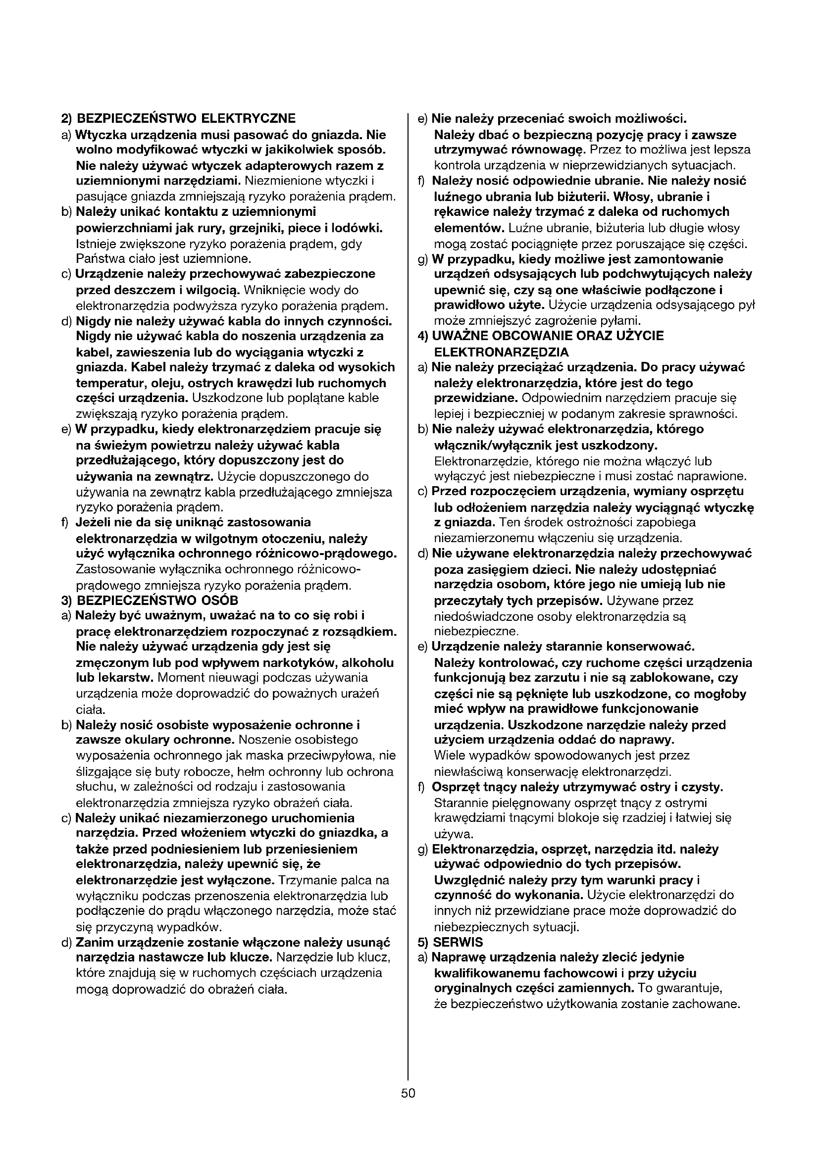 e) Urzadzenia nalezy starannie konserwowac. Nalezy kontrlowac,czy ruchome czosci urzadzenia funkcjonuja bez zarutu i nie są zablokowane,czy czeci nie są pękniète lub uszkodzone, co mogłowbymieć wplyw na prawidowej funkcjonowanie urzadzenia. Uszkodzone narȩdzie nalezy przy użyciem urzadzenia oddac do naprawy. Wiele wypadkowski spowodowyanch jest przyzniewość konserwacje elektronarźdi.