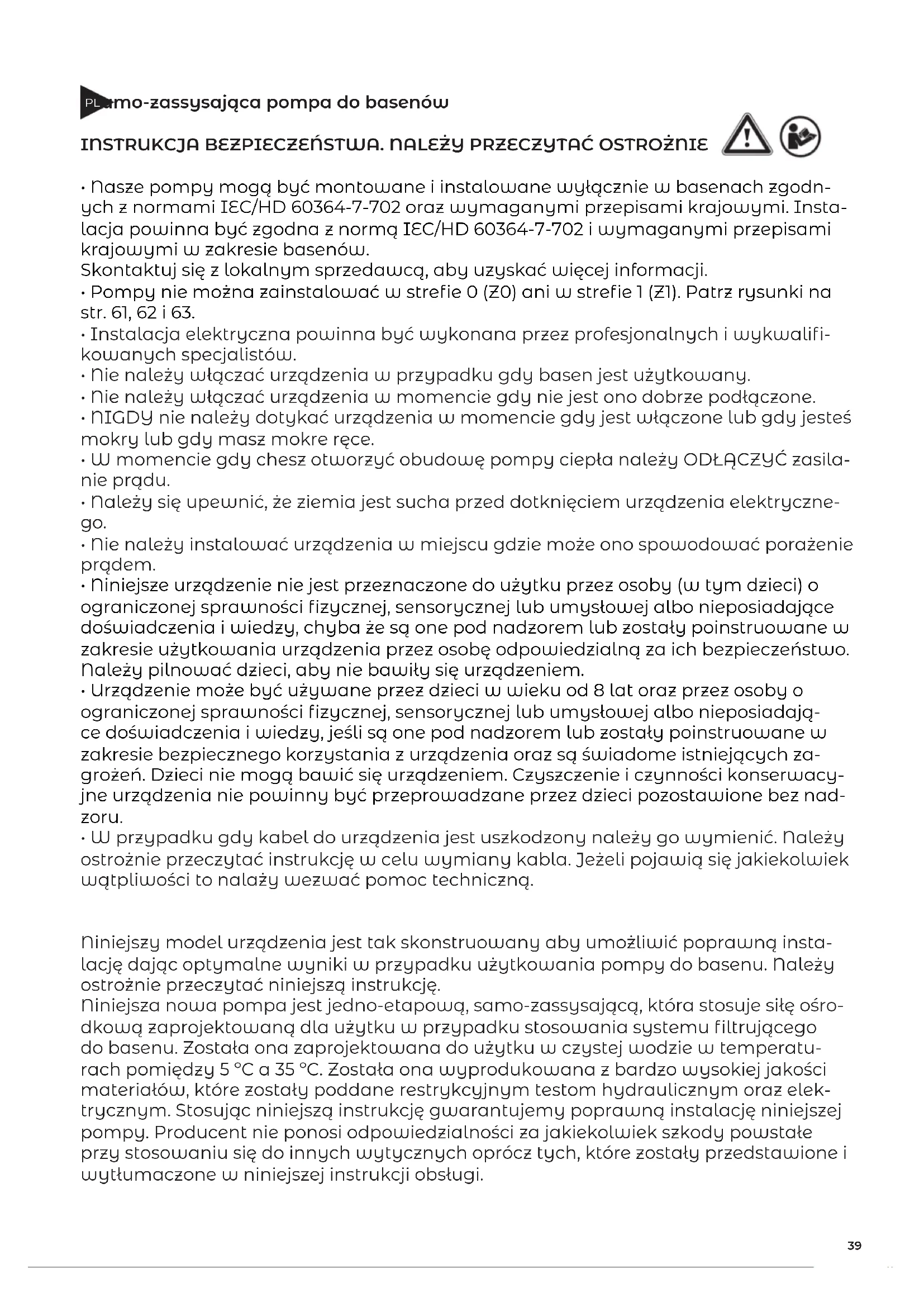 - W przypadku gdy kabel do urządzenia jest uszkodzony należy go wymienić. Należy ostrożnie przeczytać instrukcję w celu wymiany kabla. Jeżeli pojawią się jakiekolwiek wątpliwości to nalaży wezwać pomoc techniczną. Niniejszy model urządzenia jest tak skonstruowany aby umożliwić poprawną insta- lację dając optymalne wyniki w przypadku użytkowania pompy do basenu. Należy ostrożnie przeczytać niniejszą instrukcję. Niniejsza nowa pompa jest jedno-etapową, samo-zassysającą, która stosuje siłę ośro- dkową zaprojektowaną dla użytku w przypadku stosowania systemu filtrującego do basenu. Została ona zaprojektowana do użytku w czystej wodzie w temperatu- rach pomiędzy 5 ºC a 35 ºC. Została ona wyprodukowana z bardzo wysokiej jakości materiałów, które zostały poddane restrykcyjnym testom hydraulicznym oraz elek- trycznym. Stosując niniejszą instrukcję gwarantujemy poprawną instalację niniejszej pompy. Producent nie ponosi odpowiedzialności za jakiekolwiek szkody powstałe przy stosowaniu się do innych wytycznych oprócz tych, które zostały przedstawione i wytłumaczone w niniejszej instrukcji obsługi. PL40 WAŻNE Niniejsza instrukcja zawiera wszelkie niezbędne informacje jeżeli chodzi o środki be- zpieczeństwa, których należy przestrzegać w przypadku przeprowadzenia instalacji oraz uruchomienia urządzenia. Instalator oraz użytkownik urządzenia musi zatem zapoznać się z instrukcją przed przystąpieniem do instalacji oraz uruchomienia urzą- dzenia. OGÓLNE ZASADY DOTYCZĄCE BEZPIECZEŃSTWA