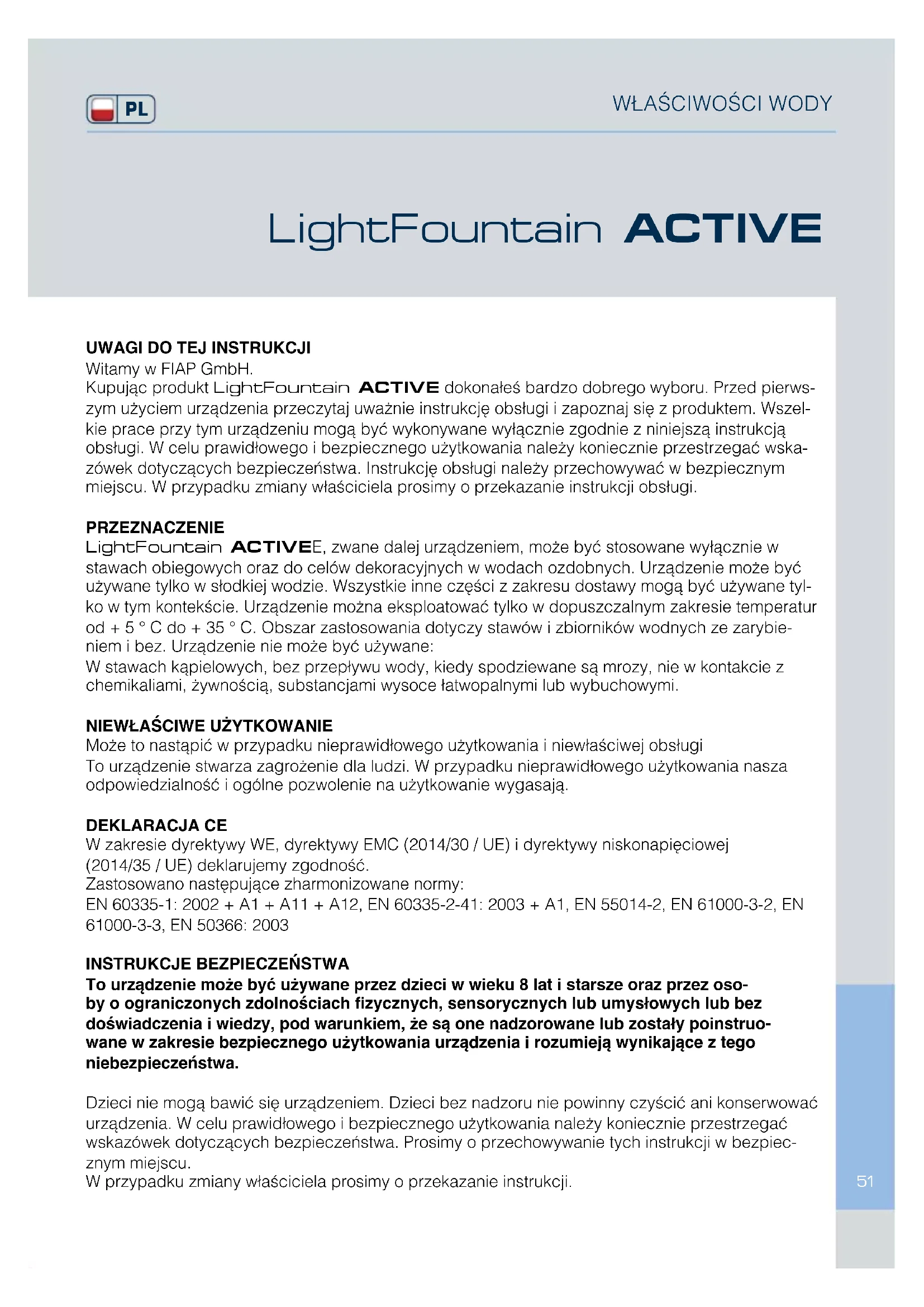 Kupując produkt LightFountain ACTIVE dokonałeś bardzo dobrego wyboru. Przed pierwszym użyciem urządzenia przeczytaj uważnie instrukcję obsługi i zapoznaj się z produktem. Wszelkie prace przy tym urządzeniu mogą być wykonywane wyłącznie zgodnie z niniejszą instrukcją obsługi. W celu prawidłowego i bezpiecznego użytkowania należy koniecznie przestrzegać wskazówek dotyczących bezpieczeństwa. Instrukcję obsługi należy przechowywać w bezpiecznym miejscu. W przypadku zmiany właściciela prosimy o przekazanie instrukcji obsługi.