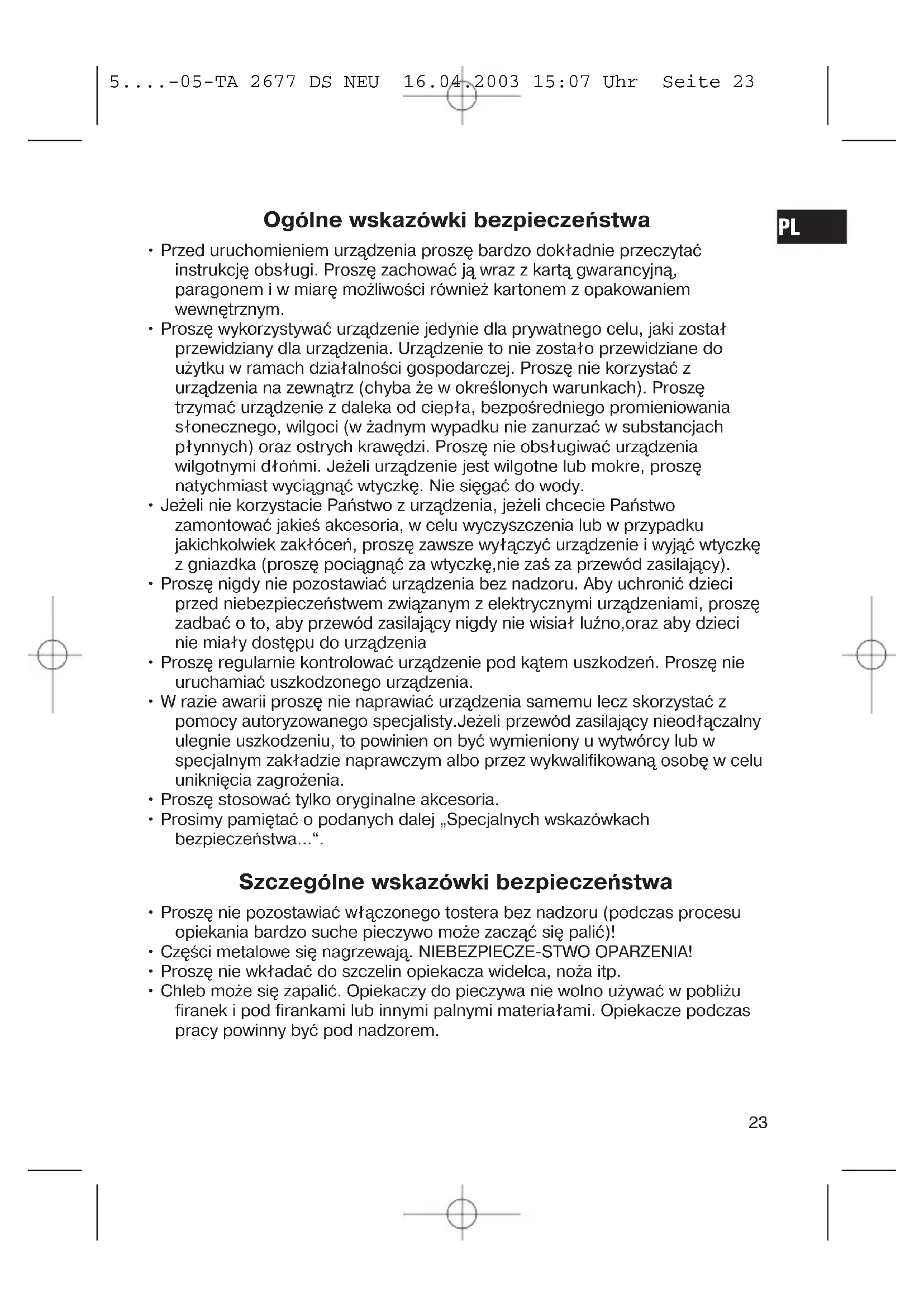 5....-05-TA 2677 DS NEU 16.04.2003 15:07 Uhr Seite 23Przed pierwszym użyciem Aby usunąć warstwę ochronną spirali grzewczej należy ok. trzech razy urucho- mić urządzenie bez pieczywa. W tym celu proszę ustawić najwyższy stopień opiekania. Odczuwalny podczas tego procesu delikatny zapach spalenizny jest rzeczą normalną. Proszę pamiętać o odpowiedniej wentylacji. Obsługa
