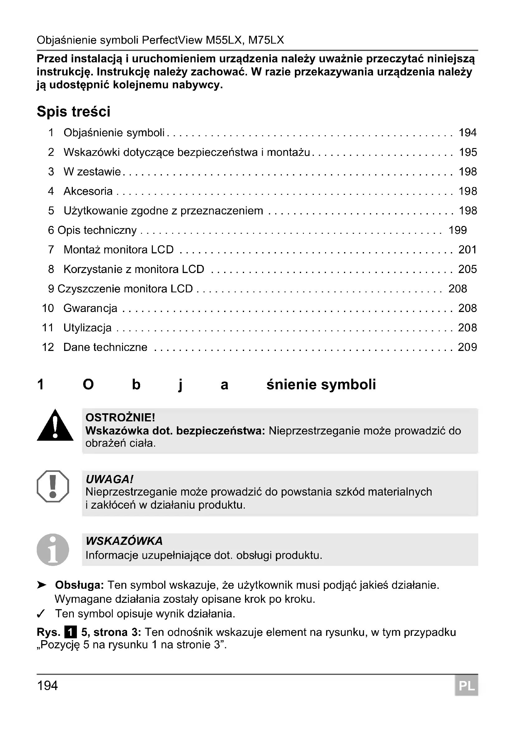 ➤ Obsługa: Ten symbol wskazuje, że użytkownik musi podjąć jakieś działanie. Wymagane działania zostały opisane krok po kroku. ✓ Ten symbol opisuje wynik działania. Rys. 1 5, strona 3: Ten odnośnik wskazuje element na rysunku, w tym przypadku „Pozycję 5 na rysunku 1 na stronie 3”. OSTROŻNIE! Wskazówka dot. bezpieczeństwa: Nieprzestrzeganie może prowadzić do obrażeń ciała. UWAGA! Nieprzestrzeganie może prowadzić do powstania szkód materialnych izakłóceń w działaniu produktu. WSKAZÓWKA Informacje uzupełniające dot. obsługi produktu.PerfectView M55LX, M75LX Wskazówki dotyczące bezpieczeństwa i montażu