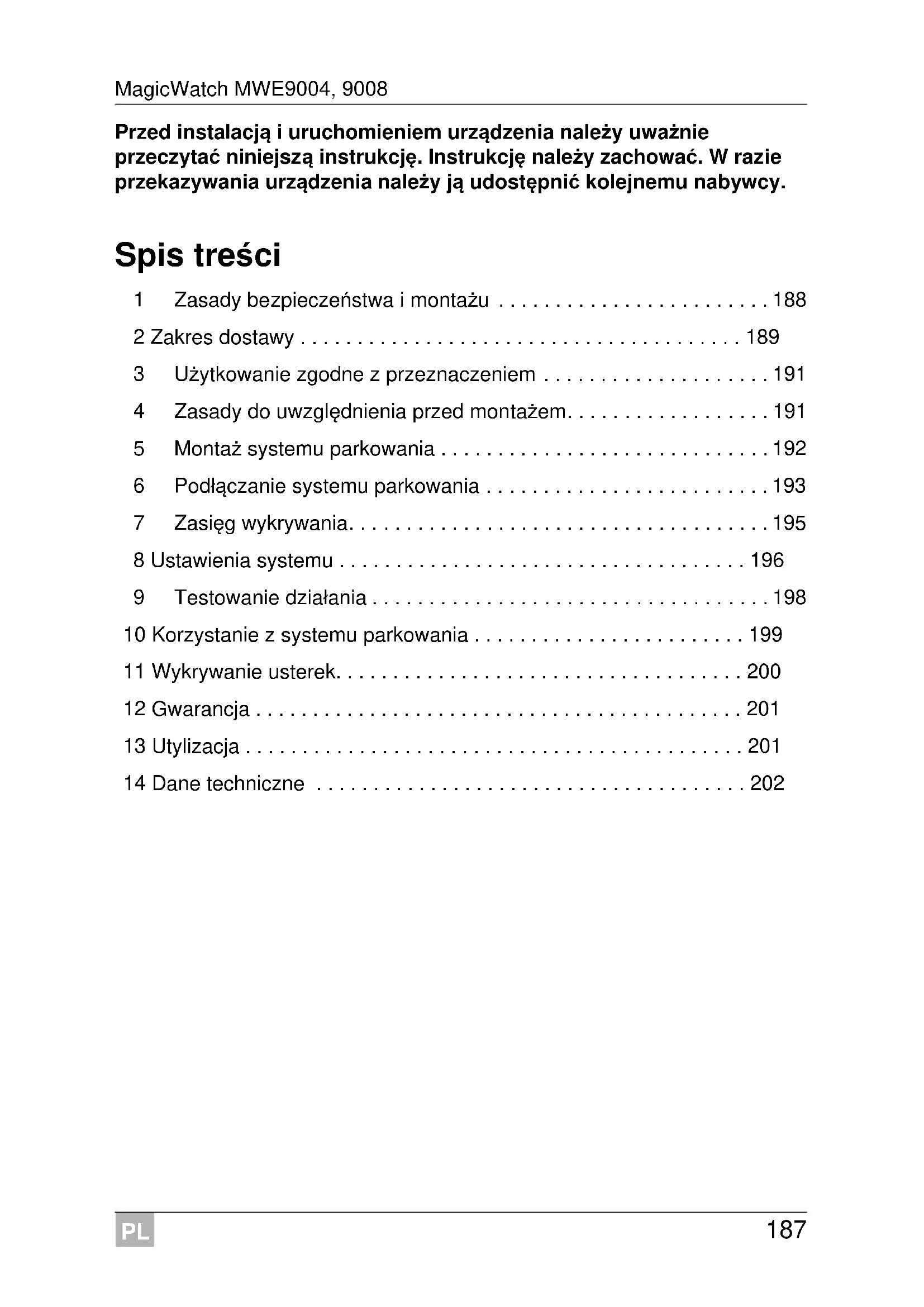 - 14 Dane techniczne PL Zasady bezpieczeństwa i montażu MagicWatch MWE9004, 9008 p. 202