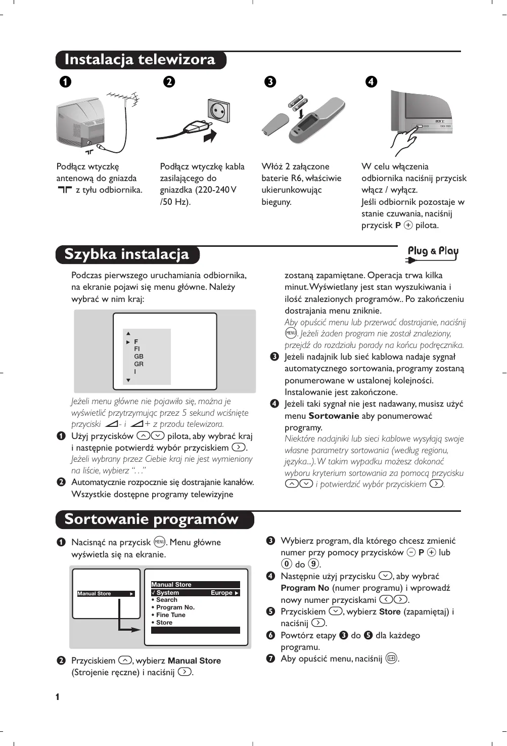 Jeżeli menu główne nie pojawiło się, można je wyświetlić przytrzymując przez 5 sekund wciśnięte przyciski ”- i ”+ z przodu telewizora. & Użyj przycisków îÏ pilota, aby wybrać kraj i następnie potwierdź wybór przyciskiem ¬. Jeżeli wybrany przez Ciebie kraj nie jest wymieniony na liście, wybierz “. . .” é Automatycznie rozpocznie się dostrajanie kanałów. Wszystkie dostępne programy telewizyjne zostaną zapamiętane. Operacja trwa kilka minut.Wyświetlany jest stan wyszukiwania i ilość znalezionych programów.. Po zakończeniu dostrajania menu zniknie. Aby opuścić menu lub przerwać dostrajanie, naciśnij H. Jeżeli żaden program nie został znaleziony, przejdź do rozdziału porady na końcu podręcznika. “ Jeżeli nadajnik lub sieć kablowa nadaje sygnał automatycznego sortowania, programy zostaną ponumerowane w ustalonej kolejności. Instalowanie jest zakończone. ‘ Jeżeli taki sygnał nie jest nadawany, musisz użyć menu Sortowanie aby ponumerować programy. Niektóre nadajniki lub sieci kablowe wysyłają swoje własne parametry sortowania (według regionu, języka...).W takim wypadku możesz dokonać wyboru kryterium sortowania za pomocą przycisku îÏ i potwierdzić wybór przyciskiem ¬. Sortowanie programów & Nacisnąć na przycisk H. Menu główne wyświetla się na ekranie. Manual Store