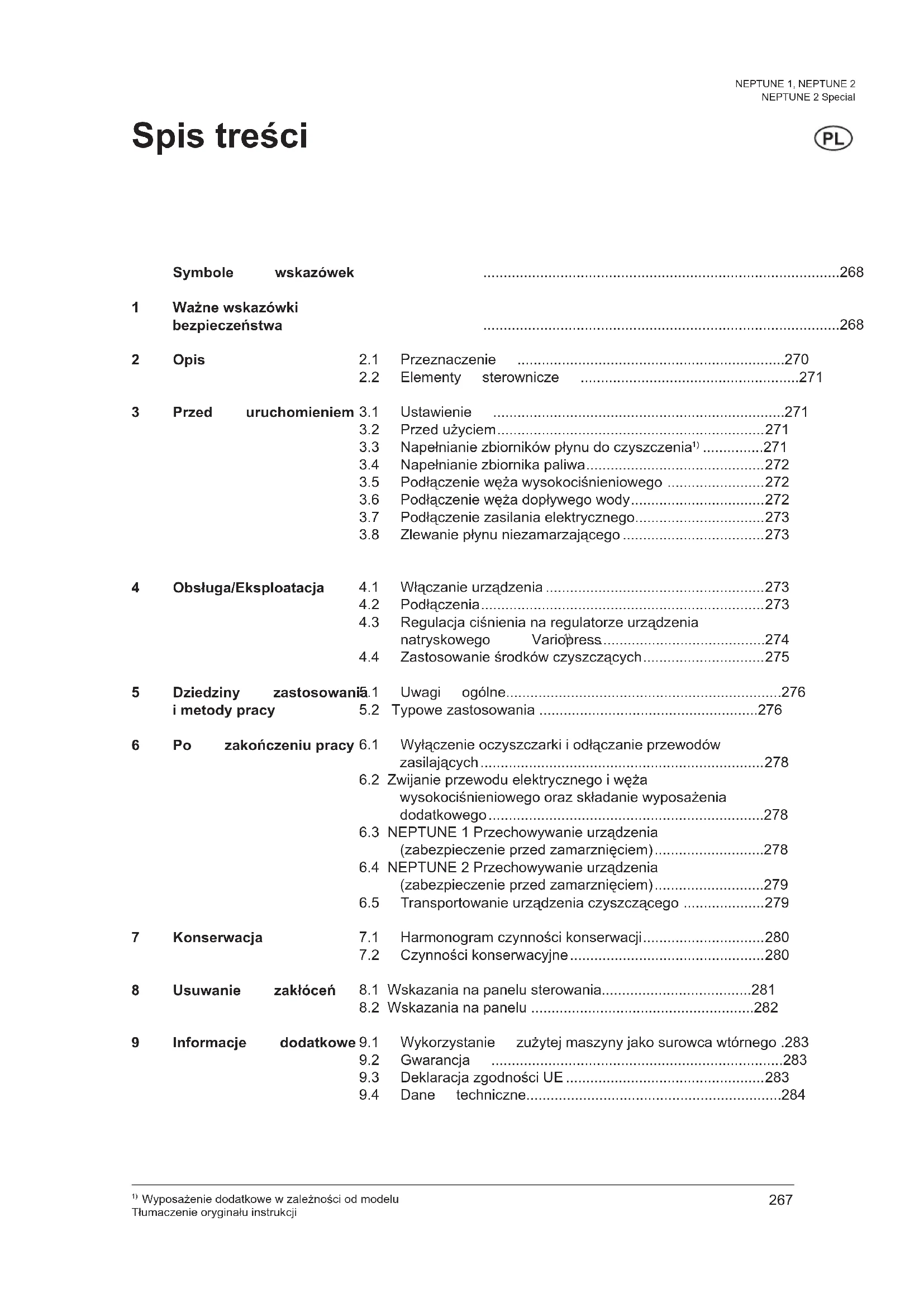 Wyposażenie dodatkowe w zależności od modelu Tłumaczenie oryginału instrukcji NEPTUNE 1, NEPTUNE 2 NEPTUNE 2 Special 1 Ważne wskazówki bezpieczeństwa Symbole wskazówek Tym symbolem zagrożenia ozna- czone są w niniej- szym podręczniku wskazówki, których ignorowanie może spowodować zagrożenie dla ludzi. Dla Twojego bezpieczeństwa Urządzenie - mogą obsługiwać wyłącznie osoby, które zostały przeszko- lone w jego obsłudze i którym zlecono wyraźnie wykonywanie tej pracy - może być użytkowane tylko pod nadzorem - nie może być obsługiwane przez dzieci - Nie może być używane przez osoby niepełnosprawne fi zycz- nie lub umysłowo UWAGA! Urządzenie do czyszczenia ciśnie- niowego może być niebezpieczne w przypadku niewłaściwego wy- korzystania. Nie wolno kierować strumienia na ludzi, zwierzęta, urządzenia znajdujące się pod na- pięciem lub na samo urządzenie. Należy stosować odzież ochron- ną, ochronniki słuchu i okulary ochronne. Nie należy użytkować urządzenia, jeśli w otoczeniu roboczym prze- bywają inne osoby bez odzieży ochronnej. Nie kierować lancy w stronę żywych zwierząt. Strumienia nie należy kierować na siebie lub inne osoby z zamiarem oczyszczenia odzieży lub butów. W czasie eksploatacji urządzenia na wyposażeniu strumieniowym występują siły odrzutu, a w przy- padku wykorzystania kątowej lancy strumieniowej do natryskiwania dodatkowo jeszcze momenty ob- rotowe, przez co konieczne jest trzymanie wyposażenia strumie- niowego oburącz. Uwagi ogólne Użytkowanie urządzenia do czysz- czenia ciśnieniowego jest regulo- wane obowiązującymi przepisami krajowymi. Poza wskazówkami zamieszczo- nymi w niniejszej instrukcji obsługi oraz przepisami dotyczącymi zapobiegania nieszczęśliwym wy- padkom (bhp) obowiązującymi w kraju użytkownika, należy także przestrzegać uznanych zasad technicznych bezpiecznego i pra- widłowego uż ytkowania urzą- dzeń. Zabrania się wykonywania prac w sposób zagrażający bezpieczeń- stwu. Nie blokować spustu w pozycji otwartej. Transport Aby zapewnić bezpieczny trans- port w samochodach i na samo- chodach, zaleca się zamocowanie urządzenia taśmami i zablokowa- nie hamulcem. Jeśli zajdzie konieczność transpor- tu urządzenia i jego wyposażenia w temperaturach bliskich lub niż- szych niż 0 °C, Płyn niezamarza- jący powinien być wcześniej wlany do pompy i bojlera w rozdziale 6. Przed uruchomieniem Jeżeli urządzenie trójfazowe zo- stanie dostarczone bez wtyczki, to należy zlecić uprawnionemu elek- trykowi zainstalowanie na urządze- niu prawidłowej wtyczki trójfazowej z wtykiem ochronnym. Przed każdym uruchomieniem należy skontrolować przewód zasilający i najważniejsze części urządzenia, takie jak wąż wyso- kociśnieniowy i pistolet natrysko- wy. Zabrania się uruchamiania urządzenia, jeżeli części te są uszkodzone. Urządzenie ustawić w taki sposób, aby wtyczka przewodu zasilające- go była łatwo dostępna. Przewód zasilający należy kon- trolować regularnie na obecność uszkodzeń oraz oznak starzenia się materiału. Uzytkowanie urza- dzenia do czyszczenia cisnienio- wego jest dopuszczalne wylacznie pod warunkiem nienagannego stanu przewodu zasilajacego (niebezpieczeństwo porażenia prą- dem w przypadku uszkodzonego przewodu!) W przypadku uszkodzenia prze- wodu zasilającego należy go wymienić u producenta lub w serwisie technicznym producenta albo przez osobę posiadającą odpowiednie uprawnienia, aby zapobiec zagrożeniom. To oznacza po- rady lub wska- zówki, które ułatwiają pracę i zapewniają większe bezpieczeń- stwo pracy. Przed uruchomieniem urządzenia do czysz- czenia ciśnieniowego należy także koniecz- nie przeczytać dołą- czoną instrukcję obsługi; instrukcję tę należy przechować w dostęp- nym miejscu do ewentualnego późniejszego wykorzystania. Ten symbol towarzy- szy wskazówkom, których ignorowanie może spowodować uszkodzenie lub nie- prawidłową pracę urządzenia.269