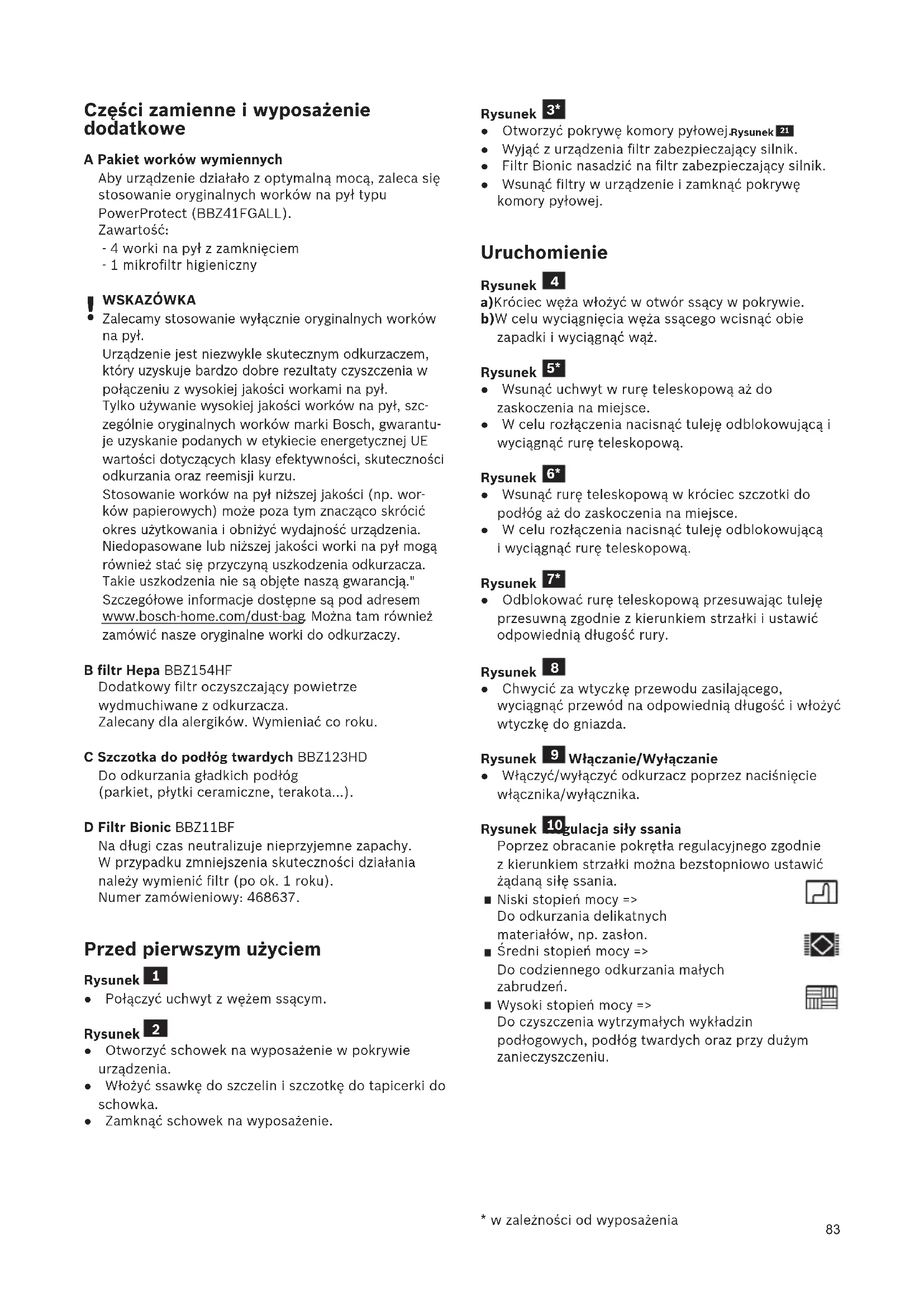 WSKAZÓWKA Zalecamy stosowanie wyłącznie oryginalnych worków na pył. Urządzenie jest niezwykle skutecznym odkurzaczem, który uzyskuje bardzo dobre rezultaty czyszczenia w połączeniu z wysokiej jakości workami na pył. Tylko używanie wysokiej jakości worków na pył, szc- zególnie oryginalnych worków marki Bosch, gwarantu- je uzyskanie podanych w etykiecie energetycznej UE wartości dotyczących klasy efektywności, skuteczności odkurzania oraz reemisji kurzu. Stosowanie worków na pył niższej jakości (np. wor- ków papierowych) może poza tym znacząco skrócić okres użytkowania i obniżyć wydajność urządzenia. Niedopasowane lub niższej jakości worki na pył mogą również stać się przyczyną uszkodzenia odkurzacza. Takie uszkodzenia nie są objęte naszą gwarancją." Szczegółowe informacje dostępne są pod adresem www.bosch-home.com/dust-bag . Można tam również zamówić nasze oryginalne worki do odkurzaczy. B filtr Hepa BBZ154HF Dodatkowy filtr oczyszczający powietrze wydmuchiwane z odkurzacza. Zalecany dla alergików. Wymieniać co roku. C Szczotka do podłóg twardych BBZ123HD Do odkurzania gładkich podłóg (parkiet, płytki ceramiczne, terakota...). D Filtr Bionic BBZ11BF Na długi czas neutralizuje nieprzyjemne zapachy. W przypadku zmniejszenia skuteczności działania należy wymienić filtr (po ok. 1 roku). Numer zamówieniowy: 468637. Przed pierwszym użyciem Rysunek ● Połączyć uchwyt z wężem ssącym. Rysunek ● Otworzyć schowek na wyposażenie w pokrywie urządzenia. ● Włożyć ssawkę do szczelin i szczotkę do tapicerki do schowka. ● Zamknąć schowek na wyposażenie.