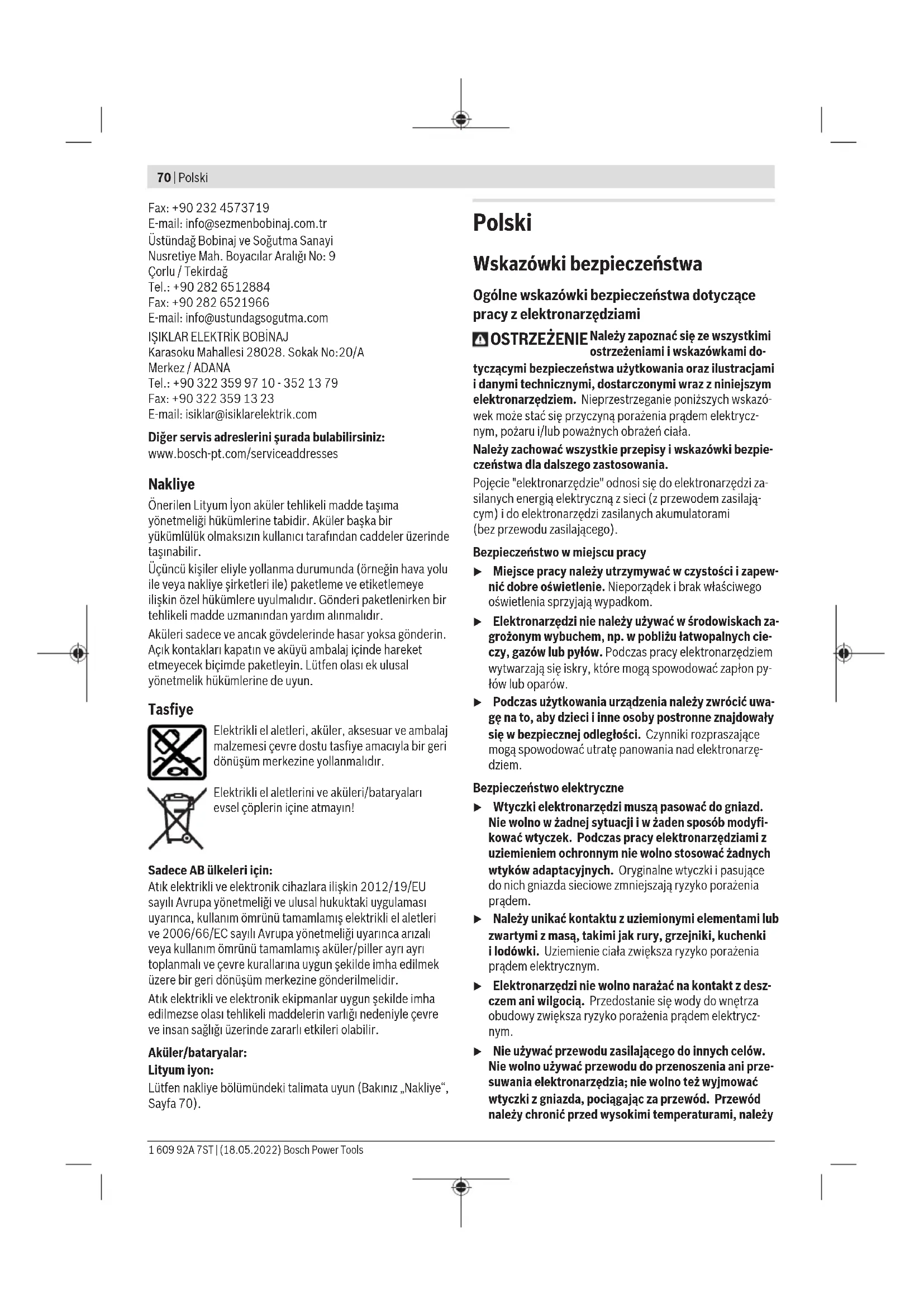Karasoku Mahallesi 28028. Sokak No:20/A Merkez / ADANA Tel.: +903223599710 -3521379 Fax: +903223591323 E-mail: isiklar@isiklarelektrik.com Diğer servis adreslerini şurada bulabilirsiniz: www.bosch-pt.com/serviceaddresses Nakliye Önerilen Lityum İyon aküler tehlikeli madde taşıma yönetmeliği hükümlerine tabidir. Aküler başka bir yükümlülük olmaksızın kullanıcı tarafından caddeler üzerinde taşınabilir. Üçüncü kişiler eliyle yollanma durumunda (örneğin hava yolu ile veya nakliye şirketleri ile) paketleme ve etiketlemeye ilişkin özel hükümlere uyulmalıdır. Gönderi paketlenirken bir tehlikeli madde uzmanından yardım alınmalıdır. Aküleri sadece ve ancak gövdelerinde hasar yoksa gönderin. Açık kontakları kapatın ve aküyü ambalaj içinde hareket etmeyecek biçimde paketleyin. Lütfen olası ek ulusal yönetmelik hükümlerine de uyun. Tasfiye Elektrikli el aletleri, aküler, aksesuar ve ambalaj malzemesi çevre dostu tasfiye amacıyla bir geri dönüşüm merkezine yollanmalıdır. Elektrikli el aletlerini ve aküleri/bataryaları evsel çöplerin içine atmayın! Sadece AB ülkeleri için: Atık elektrikli ve elektronik cihazlara ilişkin 2012/19/EU sayılı Avrupa yönetmeliği ve ulusal hukuktaki uygulaması uyarınca, kullanım ömrünü tamamlamış elektrikli el aletleri ve 2006/66/EC sayılı Avrupa yönetmeliği uyarınca arızalı veya kullanım ömrünü tamamlamış aküler/piller ayrı ayrı toplanmalı ve çevre kurallarına uygun şekilde imha edilmek üzere bir geri dönüşüm merkezine gönderilmelidir. Atık elektrikli ve elektronik ekipmanlar uygun şekilde imha edilmezse olası tehlikeli maddelerin varlığı nedeniyle çevre ve insan sağlığı üzerinde zararlı etkileri olabilir. Aküler/bataryalar: Lityum iyon: Lütfen nakliye bölümündeki talimata uyun (Bakınız „Nakliye“, Sayfa70). Polski Wskazówki bezpieczeństwa Ogólne wskazówki bezpieczeństwa dotyczące pracy z elektronarzędziami OSTRZEŻENIE Należy zapoznać się ze wszystkimi ostrzeżeniami i wskazówkami do- tyczącymi bezpieczeństwa użytkowania oraz ilustracjami i danymi technicznymi, dostarczonymi wraz z niniejszym elektronarzędziem. Nieprzestrzeganie poniższych wskazó- wek może stać się przyczyną porażenia prądem elektrycz- nym, pożaru i/lub poważnych obrażeń ciała. Należy zachować wszystkie przepisy i wskazówki bezpie- czeństwa dla dalszego zastosowania. Pojęcie "elektronarzędzie" odnosi się do elektronarzędzi za- silanych energią elektryczną z sieci (z przewodem zasilają- cym) i do elektronarzędzi zasilanych akumulatorami (bezprzewodu zasilającego). Bezpieczeństwo w miejscu pracy u Miejsce pracy należy utrzymywać w czystości i zapew- nić dobre oświetlenie. Nieporządek i brak właściwego oświetlenia sprzyjają wypadkom. u Elektronarzędzi nie należy używać w środowiskach za- grożonym wybuchem, np. w pobliżu łatwopalnych cie- czy, gazów lub pyłów. Podczas pracy elektronarzędziem wytwarzają się iskry, które mogą spowodować zapłon py- łów lub oparów. u Podczas użytkowania urządzenia należy zwrócić uwa- gę na to, aby dzieci i inne osoby postronne znajdowały się w bezpiecznej odległości. Czynniki rozpraszające mogą spowodować utratę panowania nad elektronarzę- dziem. Bezpieczeństwo elektryczne u Wtyczki elektronarzędzi muszą pasować do gniazd. Nie wolno w żadnej sytuacji i w żaden sposób modyfi- kować wtyczek. Podczas pracy elektronarzędziami z uziemieniem ochronnym nie wolno stosować żadnych wtyków adaptacyjnych. Oryginalne wtyczki i pasujące do nich gniazda sieciowe zmniejszają ryzyko porażenia prądem. u Należy unikać kontaktu z uziemionymi elementami lub zwartymi z masą, takimi jak rury, grzejniki, kuchenki ilodówki. Uziemienie ciała zwiększa ryzyko porażenia prądem elektrycznym. u Elektronarzędzi nie wolno narażać na kontakt z desz- czem ani wilgocią. Przedostanie się wody do wnętrza obudowy zwiększa ryzyko porażenia prądem elektrycz- nym. u Nie używać przewodu zasilającego do innych celów. Nie wolno używać przewodu do przenoszenia ani prze- suwania elektronarzędzia; nie wolno też wyjmować wtyczki z gniazda, pociągając za przewód. Przewód należy chronić przed wysokimi temperaturami, należy 1 609 92A 7ST | (18.05.2022) Bosch Power ToolsPolski | 71 go trzymać zdala od oleju, ostrych krawędzi i rucho- mych części urządzenia. Uszkodzone lub splątane prze- wody zwiększają ryzyko porażenia prądem elektrycznym. u Używając elektronarzędzia na świeżym powietrzu, na- leży upewnić się, że przedłużacz jest przeznaczony do pracy na zewnątrz. Użycie przedłużacza przeznaczone- go do pracy na zewnątrz zmniejsza ryzyko porażenia prą- dem elektrycznym. u Jeżeli nie ma innej możliwości, niż użycie elektrona- rzędzia w wilgotnym otoczeniu, należy podłączyć je do źródła zasilania wyposażonego w wyłącznik ochronny różnicowoprądowy. Zastosowanie wyłącznika ochron- nego różnicowoprądowego zmniejsza ryzyko porażenia prądem elektrycznym. Bezpieczeństwo osób u Podczas pracy z elektronarzędziem należy zachować czujność, każdą czynność wykonywać ostrożnie i z rozwagą. Nie przystępować do pracy elektronarzę- dziem w stanie zmęczenia lub będąc pod wpływem narkotyków, alkoholu lub leków. Chwila nieuwagi pod- czas pracy może grozić bardzo poważnymi obrażeniami ciała. u Stosować środki ochrony osobistej. Należy zawsze nosić okulary ochronne. Środki ochrony osobistej, np. maska przeciwpyłowa, antypoślizgowe obuwie, kask ochronny czy ochraniacze na uszy, w określonych warun- kach pracy obniżają ryzyko obrażeń ciała. u Należy unikać niezamierzonego uruchomienia narzę- dzia. Przed podłączeniem elektronarzędzia do źródła zasilania i/lub podłączeniem akumulatora, podniesie- niem albo transportem urządzenia, należy upewnić się, że włącznik elektronarzęd