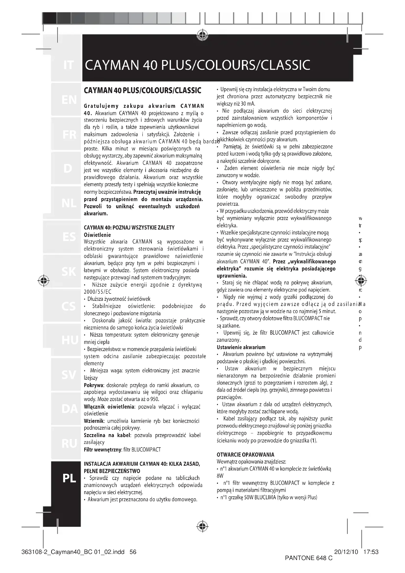 - Akwarium CAYMAN 40 Projektowano z mysla o stworzeniu bezpiecznych i zdrowych warunków zycia dla ryb i roslin, a dazu zapewniazenia uzytkownikowi maksimum zadowolenia i satysfakcj. Załozenia i poźniejsza obługa akwarium CAYMAN 40 będaj proste. Kilkai minut w mieącu poswieconych na obługe wystarczy, aby zapewnic akwarium maksymalny efektywność. Akwarium CAYMAN 40 zaopatrzone jest we wzystkie elementy i akcesoria niedzobedne do prawidlowego dzialania. Akwarium oraz wzystkie elementy przyszły testy i spelnejia wzystkie konieczne normy bezpieczność. Przechytaj uwazcie instrukcję przystapieniem do montazu urzadzenia. Pozwoli to unikné ewentualnych uszkodzenia akwarium.