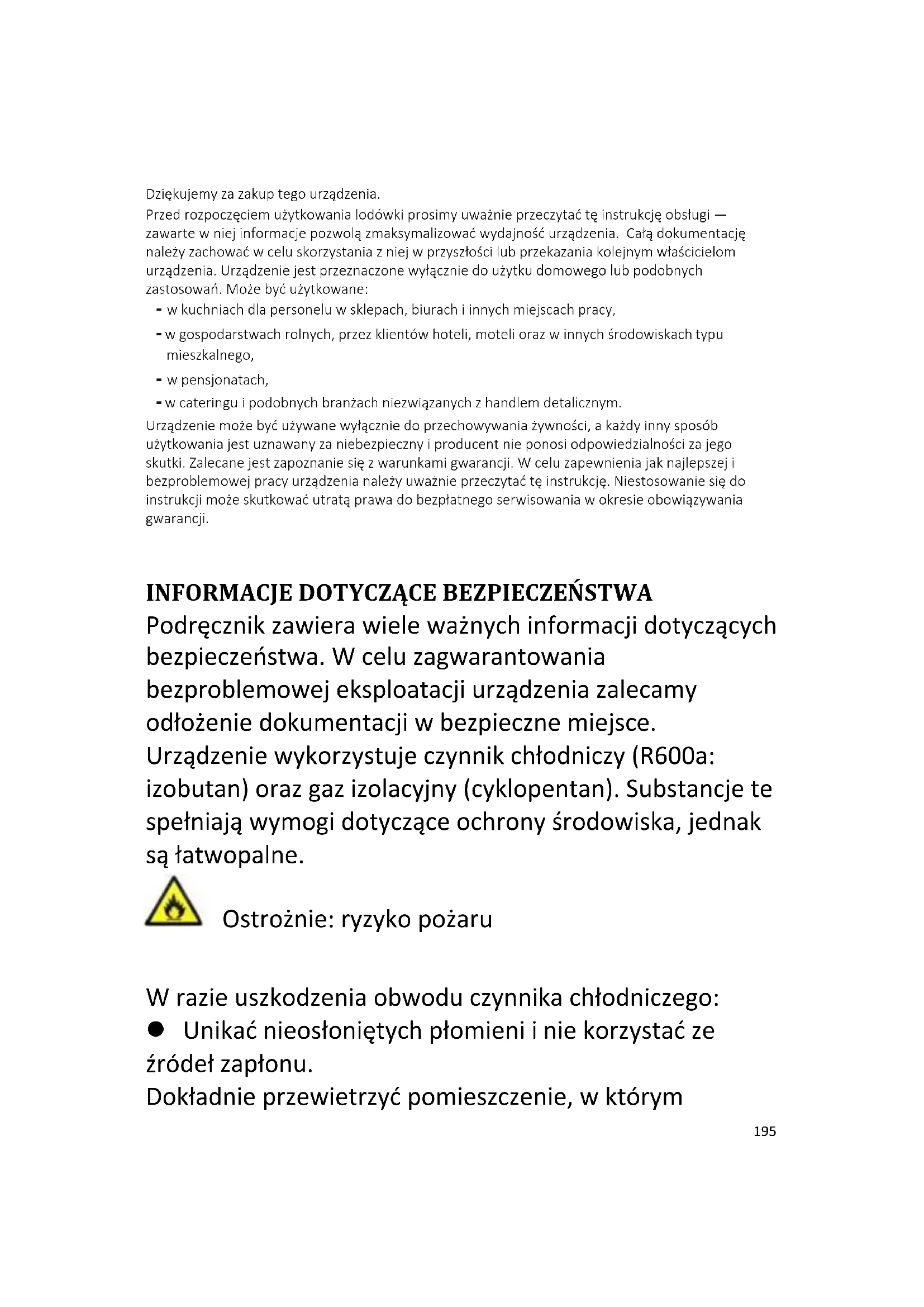 Podręcznik zawiera wiele ważnych informacji dotyczących bezpieczeństwa. W celu zagwarantowania bezproblemowej eksploatacji urządzenia zalecamy odłożenie dokumentacji w bezpieczne miejsce. Urządzenie wykorzystuje czynnik chłodniczy (R600a: izobutan) oraz gaz izolacyjny (cyklopentan). Substancje te spełniają wymogi dotyczące ochrony środowiska, jednak są łatwopalne. Ostrożnie: ryzyko pożaru W razie uszkodzenia obwodu czynnika chłodniczego: Unikać nieosłoniętych płomieni i nie korzystać ze źródeł zapłonu. Dokładnie przewietrzyć pomieszczenie, w którym196