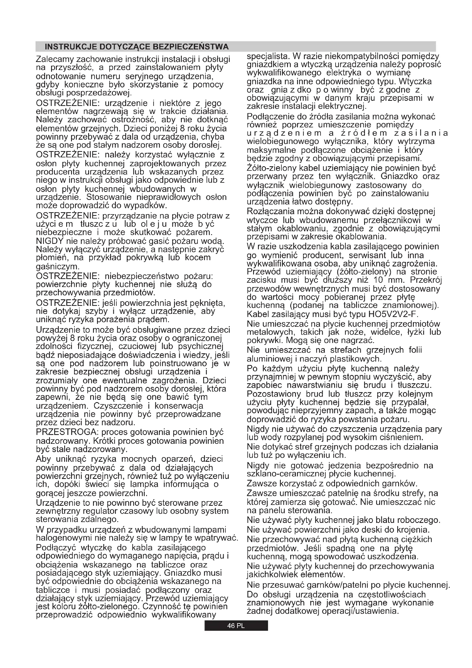 W razie uszkodzenia kablazasilajacego powinien go wymienic producent, serwisant lub inna wykwalifikowana osoba,aby uniknac zagrozenia. Przewod uziemiajacy (zolto-zielony) na stronie zacisku musi byc dluzszy niz 10 mm.Przekr o przewodow wewnetrznych musi byc dostosowany do wartosci mocy pobieranej przyez plyte kuchenna (podanej na tablicze znamionowej). Kabelzasilajacy musi byc typu HO5V2V2-F.