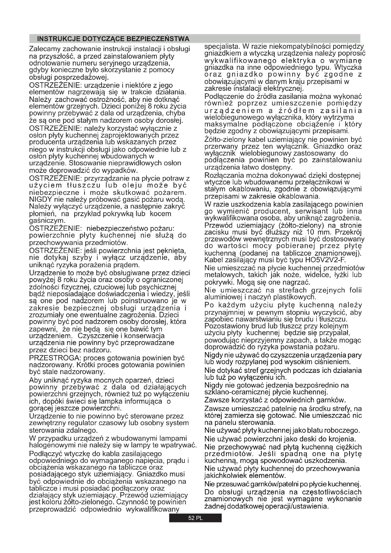 52 PL Rozłączania można dokonywać dzięki dostępnej wtyczce lub wbudowanemu przełącznikowi w stałym okablowaniu, zgodnie z obowiązującymi przepisami w zakresie okablowania. Po każdym użyciu płytę kuchenną należy przynajmniej w pewnym stopniu wyczyścić, aby zapobiec nawarstwianiu się brudu i tłuszczu. Pozostawiony brud lub tłuszcz przy kolejnym użyciu płyty kuchennej będzie się przypalał, powodując nieprzyjemny zapach, a także mogąc doprowadzić do ryzyka powstania pożaru. Nie używać powierzchni jako deski do krojenia. specjalista. W razie niekompatybilności pomiędzy gniazdkiem a wtyczką urządzenia należy poprosić wykwalifikowanego elektryka o wymianę gniazdka na inne odpowiedniego typu. Wtyczka oraz g n i a z dko powin n y b y ć zgodne z obowiązującymi w danym kraju przepisami w zakresie instalacji elektrycznej. W razie uszkodzenia kabla zasilającego powinien go wymienić producent, serwisant lub inna wykwalifikowana osoba, aby uniknąć zagrożenia. Przewód uziemiający (żółto-zielony) na stronie zacisku musi być dłuższy niż 10 mm. Przekrój przewodów wewnętrznych musi być dostosowany do wartości mocy pobieranej przez płytę kuchenną (podanej na tabliczce znamionowej). Kabel zasilający musi być typu HO5V2V2-F. Nie umieszczać na strefach grzejnych folii aluminiowej i naczyń plastikowych. Nigdy nie gotować jedzenia bezpośrednio na szklano-ceramicznej płycie kuchennej. Podłączenie do źródła zasilania można wykonać również poprzez umieszczenie pomiędzy u r z ą d z e n i e m a ź r ó d ł e m z a s i l a n i a wielobiegunowego wyłącznika, który wytrzyma maksymalne podłączone obciążenie i który będzie zgodny z obowiązującymi przepisami. Żółto-zielony kabel uziemiający nie powinien być przerwany przez ten wyłącznik. Gniazdko oraz wyłącznik wielobiegunowy zastosowany do podłączenia powinien być po zainstalowaniu urządzenia łatwo dostępny. Nie umieszczać na płycie kuchennej przedmiotów metalowych, takich jak noże, widelce, łyżki lub pokrywki. Mogą się one nagrzać. Nigdy nie używać do czyszczenia urządzenia pary lub wody rozpylanej pod wysokim ciśnieniem. Nie dotykać stref grzejnych podczas ich działania lub tuż po wyłączeniu ich. Zawsze korzystać z odpowiednich garnków. Zawsze umieszczać patelnię na środku strefy, na której zamierza się gotować. Nie umieszczać nic na panelu sterowania. Nie używać płyty kuchennej jako blatu roboczego. Nie przesuwać garnków/patelni po płycie kuchennej. Do obsług#urządzen#a na częstotl#wośc#ach znam#onowych n#e jest wymagane wykonan#e żadnej dodatkowej operacj#/ustaw#en#a. Nie używać płyty kuchennej do przechowywania jakichkolwiek elementów. Nie przechowywać nad płytą kuchenną ciężkich przedmiotów. Jeśli spadną one na płytę kuchenną, mogą spowodować uszkodzenia.W przypadku instalacji okapu k u c h e n n e g o n a d p ł y t ą kuchenną należy zapoznać się z w y m o g a m i w z a k r e s i e instalacji okapu kuchennego, jednak zazwyczaj odległość pomiędzy płytą kuchenną i okapem nie powinna być mniejsza niż 700 mm. Należy pozostawić odległość wynoszącą przynajmniej 55 mm pomiędzy płytą kuchenną i ścianką tylną oraz przynajmniej 1 5 0 m m p o m i ęd z y p ł y t ą kuchenną i pionowym meblem l u b śc i a n a m i n a s t r o n i e boczn e j . J e śli n a d p ły t ą kuchenną instalowany jest mebel, minimalna wymagana odległość to 700 mm. KOD PRODUKTU Tabliczka znamionowa (znajduje się pod dolną obudową płyty kuchennej)