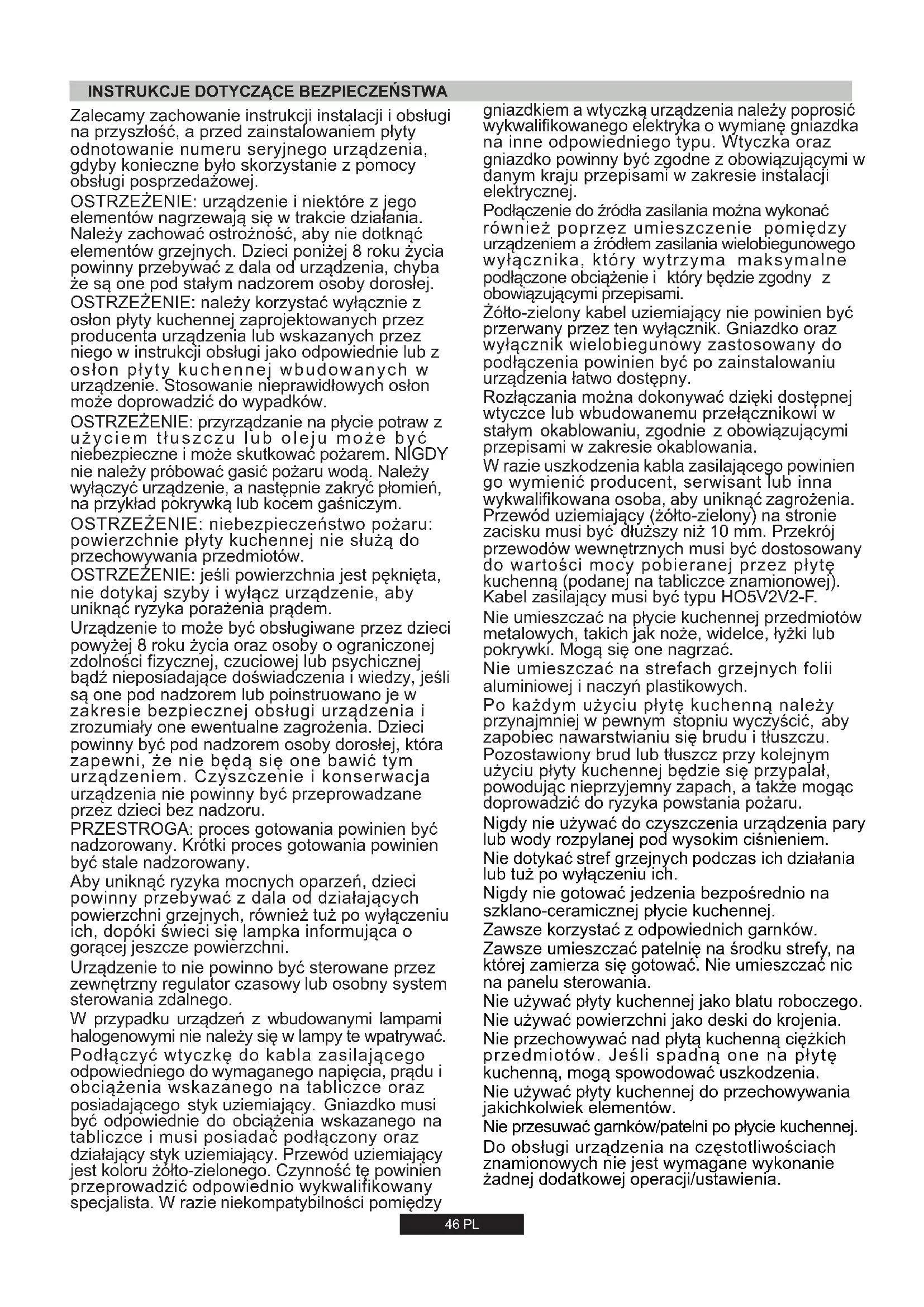 Ha megjelenik a hiba, kapcsolja ki, majd vissza a főzőlap áramellátását. Ha továbbra is fennáll a hiba, hívja az eladást követő szolgáltatást. Ha normál működés közben hirtelen jelenik meg a hiba, hívja az eladást követő szolgáltatást. Érintővezérlés szoftverhibája. Várjon, amíg lehűl. A főzőlap működése automatikusan helyreáll, ha a hőmérséklet eléri a normál értéket. Az érintővezérlés területe túl meleg, és kikapcsolta az összes főzőzónát. Várjon, amíg lehűl. Ha a hőmérséklet eléri a környezeti értéket, de a hibaüzenet továbbra is fennáll, hívja az eladást követő szolgáltatást. Várjon, amíg lehűl. Ha a hőmérséklet eléri a környezeti értéket, de a hibaüzenet továbbra is fennáll, hívja az eladást követő szolgáltatást. Meghibásodhatott az érintővezérlés hőmérséklet érzékelője. Ellenőrizze, hogy a főzőlap megfelelően van-e beszerelve. Ellenőrizze, hogy a gombok megfelelően hozzáérnek az üvegfelülethez. Bármelyik gomb túlérzékeny. Ennél a hibánál az érintővezérlés önellenőrzést hajt végre. A hiba eltűnik, ha az önellenőrzés végrehajtása kész. Ha továbbra is fennáll a hiba, hívja az eladást követő szolgáltatást. Biztonsági érintővezérlés hiba Ennél a hibánál a szoftver önellenőrzést hajt végre. A hiba eltűnik, ha az önellenőrzés végrehajtása kész. Ha továbbra is fennáll a hiba, hívja az eladást követő szolgáltatást. Biztonsági érintővezérlés hiba Ennél a hibánál a szoftver önellenőrzést hajt végre. A hiba eltűnik, ha az önellenőrzés végrehajtása kész. Ha továbbra is fennáll a hiba, hívja az eladást követő szolgáltatást. Biztonsági érintővezérlés hiba Valamelyik relé meghajtó meghibásodott. Szüntesse meg a főzőlap áramellátásást, majd egy perc elteltével kapcsolja vissza. Ha továbbra is fennáll a hiba, hívja az eladást követő szolgáltatást. Relé biztonsági hiba Hiba Intézkedés Főzőlap kijelző Meghibásodhatott az érintővezérlés hőmérséklet érzékelőjeZalecamy zachowanie instrukcji instalacji i obsługi na przyszłość, a przed zainstalowaniem płyty odnotowanie numeru seryjnego urządzenia, gdyby konieczne było skorzystanie z pomocy obsługi posprzedażowej. OSTRZEŻENIE: urządzenie i niektóre z jego elementów nagrzewają się w trakcie działania. Należy zachować ostrożność, aby nie dotknąć elementów grzejnych. Dzieci poniżej 8 roku życia powinny przebywać z dala od urządzenia, chyba że są one pod stałym nadzorem osoby dorosłej. OSTRZEŻENIE: należy korzystać wyłącznie z osłon płyty kuchennej zaprojektowanych przez producenta urządzenia lub wskazanych przez niego w instrukcji obsługi jako odpowiednie lub z osłon płyty kuchennej wbudowanych w urządzenie. Stosowanie nieprawidłowych osłon może doprowadzić do wypadków. OSTRZEŻENIE: przyrządzanie na płycie potraw z użyciem tłuszczu lub oleju może być niebezpieczne i może skutkować pożarem. NIGDY nie należy próbować gasić pożaru wodą. Należy wyłączyć urządzenie, a następnie zakryć płomień, na przykład pokrywką lub kocem gaśniczym. OSTRZEŻENIE: niebezpieczeństwo pożaru: powierzchnie płyty kuchennej nie służą do przechowywania przedmiotów. OSTRZEŻENIE: jeśli powierzchnia jest pęknięta, nie dotykaj szyby i wyłącz urządzenie, aby uniknąć ryzyka porażenia prądem. Urządzenie to może być obsługiwane przez dzieci powyżej 8 roku życia oraz osoby o ograniczonej zdolności fizycznej, czuciowej lub psychicznej bądź nieposiadające doświadczenia i wiedzy, jeśli są one pod nadzorem lub poinstruowano je w zakresie bezpiecznej obsługi urządzenia i zrozumiały one ewentualne zagrożenia. Dzieci powinny być pod nadzorem osoby dorosłej, która zapewni, że nie będą się one bawić tym urządzeniem. Czyszczenie i konserwacja urządzenia nie powinny być przeprowadzane przez dzieci bez nadzoru. PRZESTROGA: proces gotowania powinien być nadzorowany. Krótki proces gotowania powinien być stale nadzorowany. Aby uniknąć ryzyka mocnych oparzeń, dzieci powinny przebywać z dala od działających powierzchni grzejnych, również tuż po wyłączeniu ich, dopóki świeci się lampka informująca o gorącej jeszcze powierzchni. Urządzenie to nie powinno być sterowane przez zewnętrzny regulator czasowy lub osobny system sterowania zdalnego. W przypadku urządzeń z wbudowanymi lampami halogenowymi nie należy się w lampy te wpatrywać. Podłączyć wtyczkę do kabla zasilającego odpowiedniego do wymaganego napięcia, prądu i obciążenia wskazanego na tabliczce oraz posiadającego styk uziemiający. Gniazdko musi być odpowiednie do obciążenia wskazanego na tabliczce i musi posiadać podłączony oraz działający styk uziemiający. Przewód uziemiający jest koloru żółto-zielonego. Czynność tę powinien przeprowadzić odpowiednio wykwalifikowany specjalista. W razie niekompatybilności pomiędzy