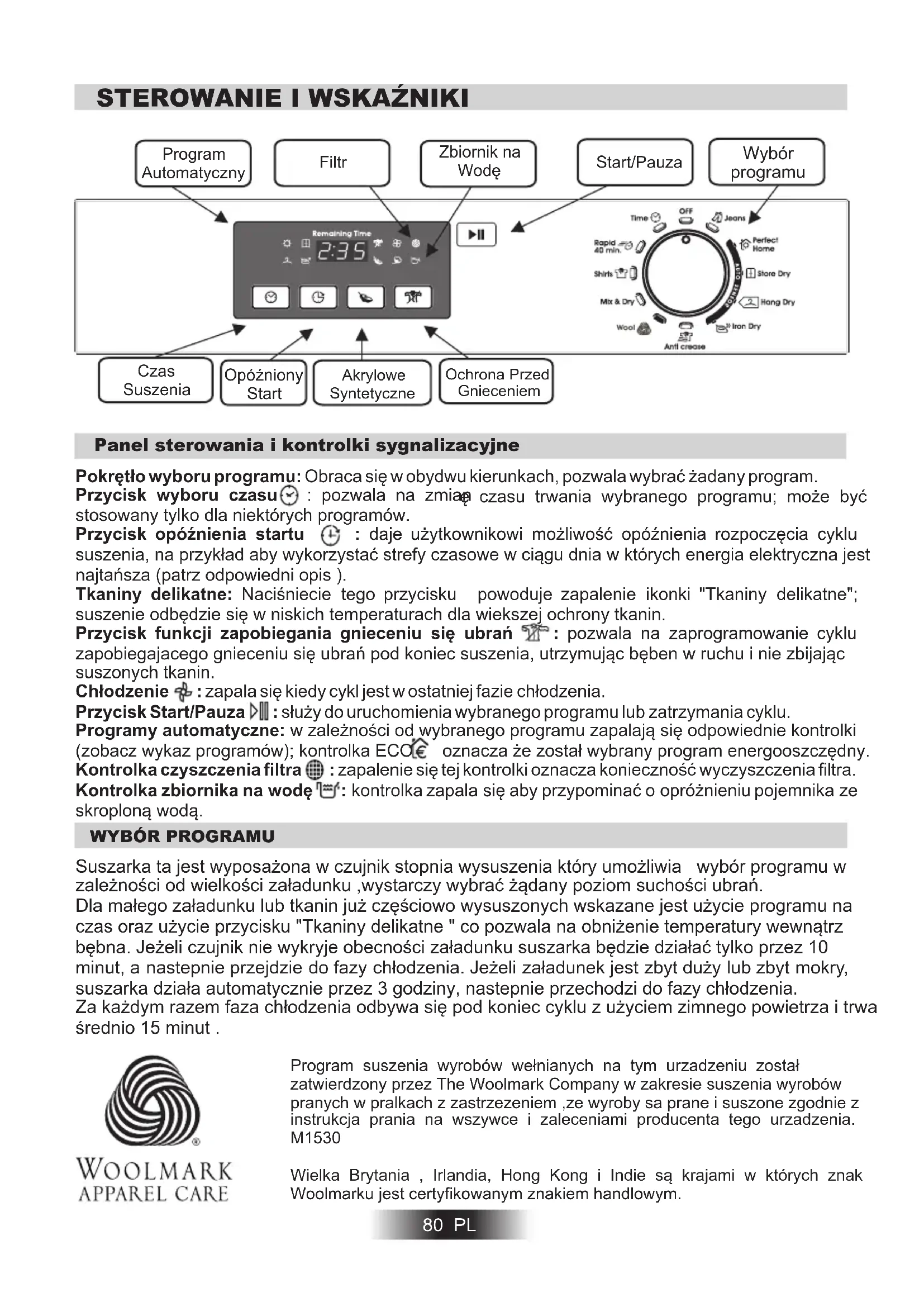 Panel sterowania i kontrolki sygnalizacyjne 80 PL Start/Pauza Filtr Program Automatyczny Wybór programu Pokrętło wyboru programu: Obraca się w obydwu kierunkach, pozwala wybrać żadany program. Przycisk wyboru czasu : pozwala na zmian stosowany tylko dla niektórych programów. Przycisk opóźnienia startu : daje użytkownikowi możliwość opóźnienia rozpoczęcia cyklu suszenia, na przykład aby wykorzystać strefy czasowe w ciągu dnia w których energia elektryczna jest najtańsza (patrz odpowiedni opis ). Tkaniny delikatne: Naciśniecie tego przycisku powoduje zapalenie ikonki "Tkaniny delikatne"; suszenie odbędzie się w niskich temperaturach dla wiekszej ochrony tkanin. Przycisk funkcji zapobiegania gnieceniu się ubrań : pozwala na zaprogramowanie cyklu zapobiegajacego gnieceniu się ubrań pod koniec suszenia, utrzymując bęben w ruchu i nie zbijając suszonych tkanin. Chłodzenie : zapala się kiedy cykl jest w ostatniej fazie chłodzenia. Przycisk Start/Pauza : służy do uruchomienia wybranego programu lub zatrzymania cyklu. Programy automatyczne: w zależności od wybranego programu zapalają się odpowiednie kontrolki (zobacz wykaz programów); kontrolka ECO oznacza że został wybrany program energooszczędny. Kontrolka czyszczenia filtra : zapalenie się tej kontrolki oznacza konieczność wyczyszczenia filtra. Kontrolka zbiornika na wodę : kontrolka zapala się aby przypominać o opróżnieniu pojemnika ze skroploną wodą. ę czasu trwania wybranego programu; może być Zbiornik na Wodę Czas Suszenia Akrylowe Syntetyczne Ochrona Przed Gnieceniem Opóźniony Start Program suszenia wyrobów wełnianych na tym urzadzeniu został zatwierdzony przez The Woolmark Company w zakresie suszenia wyrobów pranych w pralkach z zastrzezeniem ,ze wyroby sa prane i suszone zgodnie z instrukcja prania na wszywce i zaleceniami producenta tego urzadzenia. Wielka Brytania , Irlandia, Hong Kong i Indie są krajami w których znak Woolmarku jest certyfikowanym znakiem handlowym.