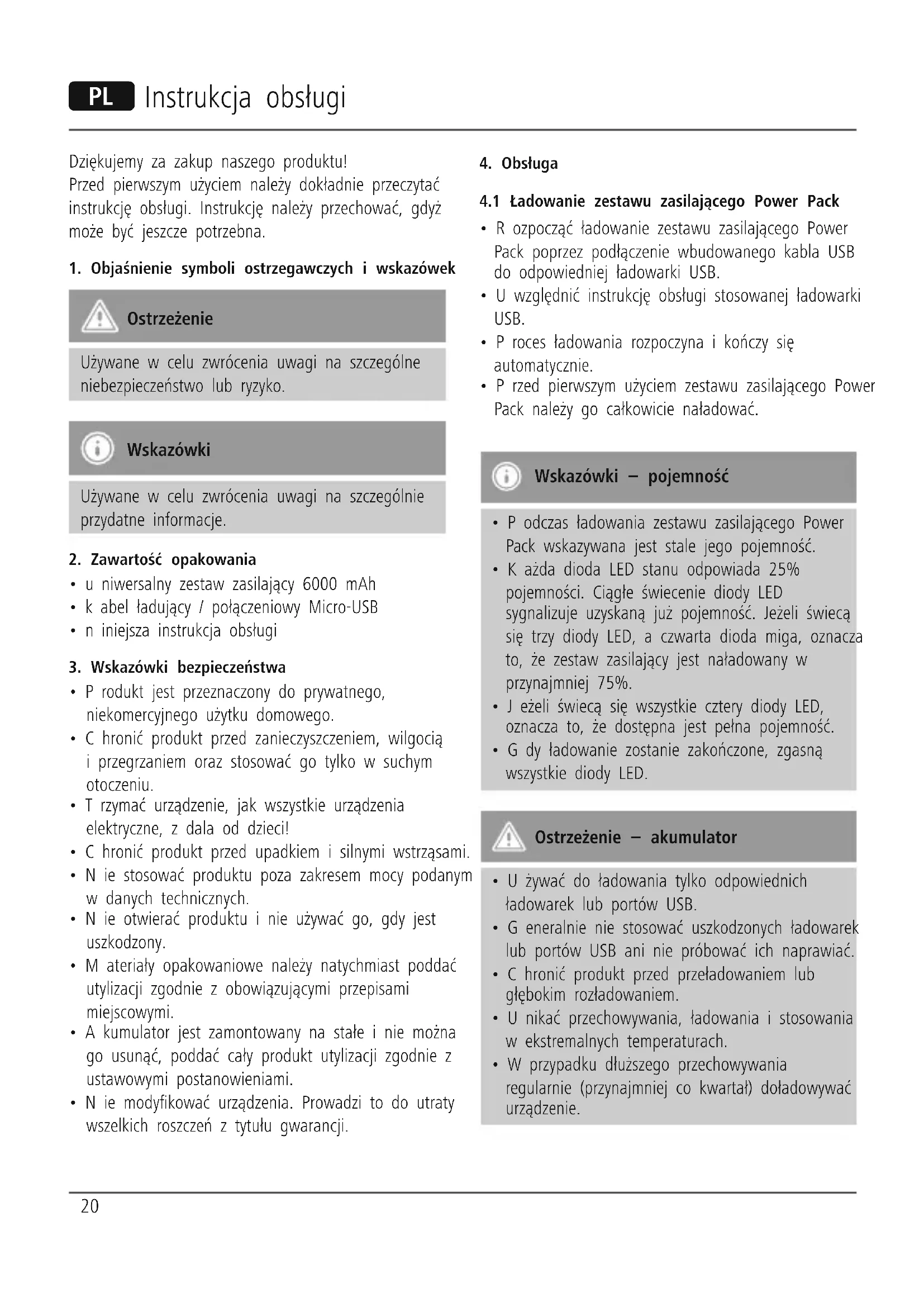 - Przed pierwszym użyciem zestawu zasilającego Power Pack należy go całkowicie naładować. Wskazówki – pojemność