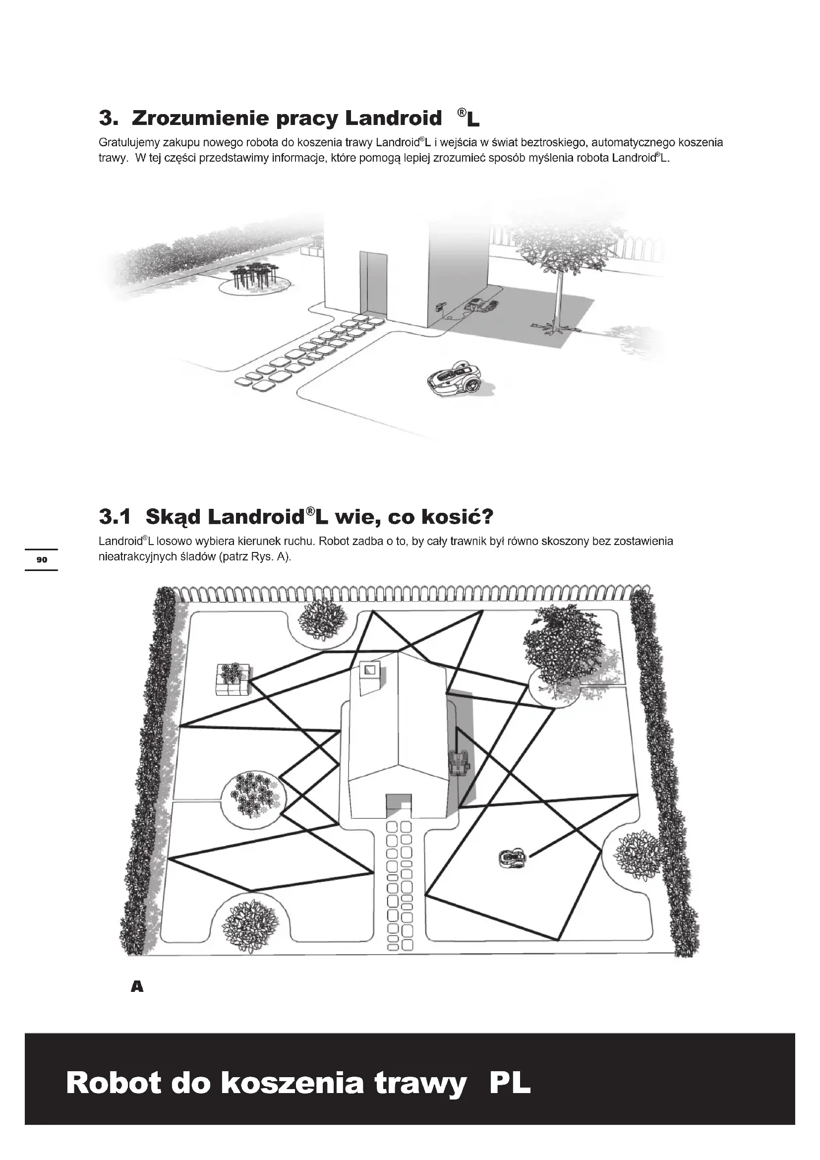 Llosowowybierakierunekruchu.Robotzadbaoto,bycałytrawnikbyłrównoskoszonybezzostawienia nieatrakcyjnychśladów(patrzRys.A). ARobot do koszenia trawy PL