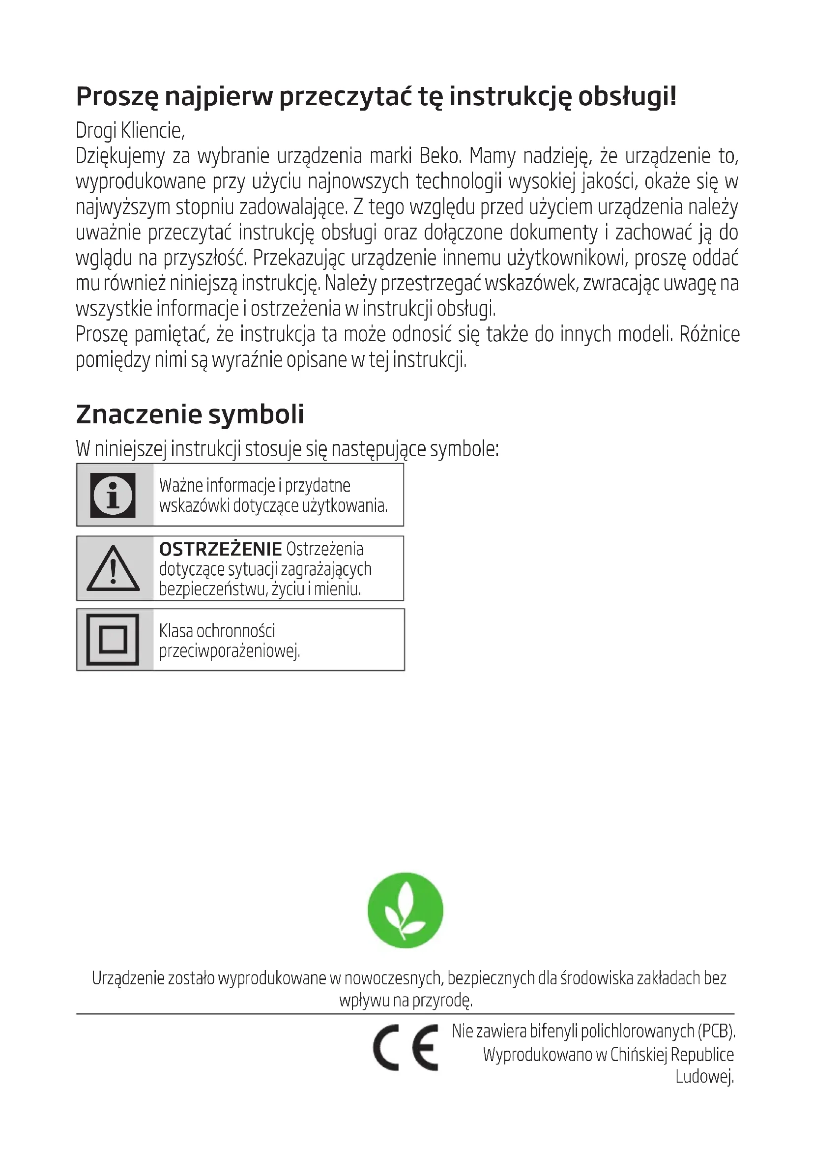 - Pokud spotřebič spadne, může přestat fungovat nebo se může vyskytnout trvalé poškození. 4 Čištění a péčeProszę najpierw przeczytać tę instrukcję obsługi! Drogi Kliencie, Dziękujemy za wybranie urządzenia marki Beko. Mamy nadzieję, że urządzenie to, wyprodukowane przy użyciu najnowszych technologii wysokiej jakości, okaże się w najwyższym stopniu zadowalające. Z tego względu przed użyciem urządzenia należy uważnie przeczytać instrukcję obsługi oraz dołączone dokumenty i zachować ją do wglądu na przyszłość. Przekazując urządzenie innemu użytkownikowi, proszę oddać mu również niniejszą instrukcję. Należy przestrzegać wskazówek, zwracając uwagę na wszystkie informacje i ostrzeżenia w instrukcji obsługi. Proszę pamiętać, że instrukcja ta może odnosić się także do innych modeli. Różnice pomiędzy nimi są wyraźnie opisane w tej instrukcji. Znaczenie symboli W niniejszej instrukcji stosuje się następujące symbole: