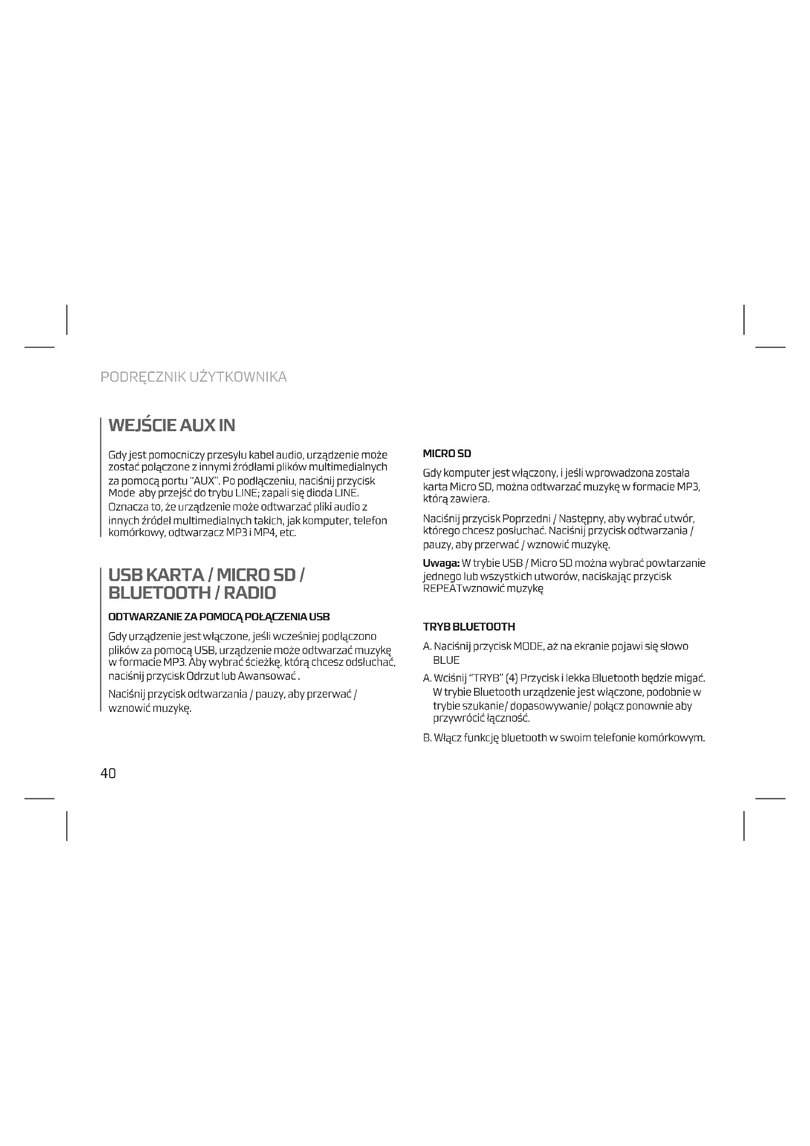 Gdy urządzenie jest włączone, jeśli wcześniej podłączono plików za pomocą USB, urządzenie może odtwarzać muzykę w formacie MP3. Aby wybrać ścieżkę, którą chcesz odsłuchać, naciśnij przycisk Odrzut lub Awansować . Naciśnij przycisk odtwarzania / pauzy, aby przerwać / wznowić muzykę. MICRO SD Gdy komputer jest włączony, i jeśli wprowadzona została karta Micro SD, można odtwarzać muzykę w formacie MP3, którą zawiera. Naciśnij przycisk Poprzedni / Następny, aby wybrać utwór, którego chcesz posłuchać. Naciśnij przycisk odtwarzania / pauzy, aby przerwać / wznowić muzykę. Uwaga: W trybie USB / Micro SD można wybrać powtarzanie jednego lub wszystkich utworów, naciskając przycisk REPEATwznowić muzykę TRYB BLUETOOTH A. Naciśnij przycisk MODE, aż na ekranie pojawi się słowo BLUE A. Wciśnij “TRYB” (4) Przycisk i lekka Bluetooth będzie migać. W trybie Bluetooth urządzenie jest włączone, podobnie w trybie szukanie/ dopasowywanie/ połącz ponownie aby przywrócić łączność. B. Włącz funkcję bluetooth w swoim telefonie komórkowym.
