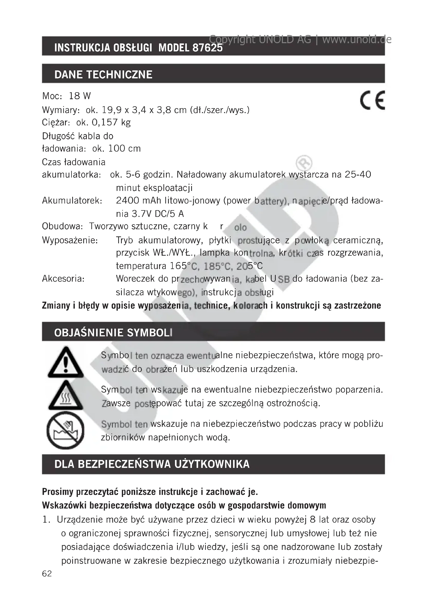 Symbol ten oznacza ewentualne niebezpieczeństwa, które mogą pro- wadzić do obrażeń lub uszkodzenia urządzenia. Symbol ten wskazuje na ewentualne niebezpieczeństwo poparzenia. Zawsze postępować tutaj ze szczególną ostrożnością. Symbol ten wskazuje na niebezpieczeństwo podczas pracy w pobliżu zbiorników napełnionych wodą. Moc: 18 W Wymiary: ok. 19,9 x 3,4 x 3,8 cm (dł./szer./wys.) Ciężar: ok. 0,157 kg Długość kabla do ładowania: ok. 100 cm Czas ładowania akumulatorka: ok. 5-6 godzin. Naładowany akumulatorek wystarcza na 25-40 minut eksploatacji Akumulatorek: 2400 mAh litowo-jonowy (power battery), napięcie/prąd ładowa- nia 3.7V DC/5 A Obudowa: Tworzywo sztuczne, czarny kolor Wyposażenie: Tryb akumulatorowy, płytki prostujące z powłoką ceramiczną, przycisk WŁ./WYŁ., lampka kontrolna, krótki czas rozgrzewania, temperatura 165°C, 185°C, 205°C Akcesoria: Woreczek do przechowywania, kabel USB do ładowania (bez za- silacza wtykowego), instrukcja obsługi Zmiany i błędy w opisie wyposażenia, technice, kolorach i konstrukcji są zastrzeżone