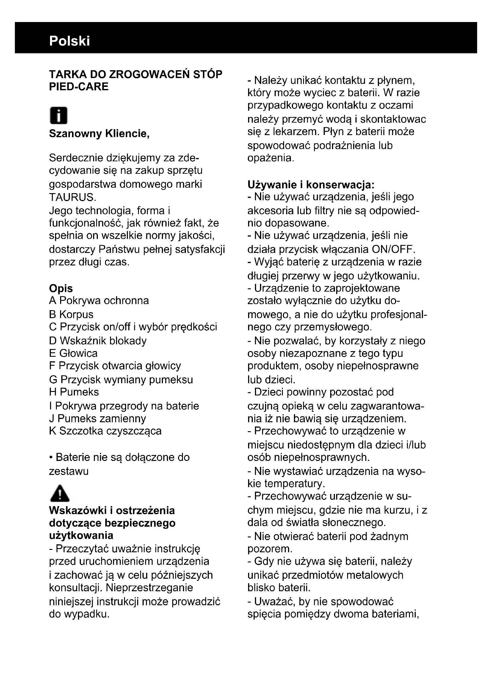 PIED-CARE Szanowny Kliencie, Serdecznie dziękujemy za zde- cydowanie się na zakup sprzętu gospodarstwa domowego marki TAURUS. Jego technologia, forma i funkcjonalność, jak również fakt, że spełnia on wszelkie normy jakości, dostarczy Państwu pełnej satysfakcji przez długi czas. Opis A Pokrywa ochronna B Korpus C Przycisk on/off i wybór prędkości D Wskaźnik blokady E Głowica F Przycisk otwarcia głowicy G Przycisk wymiany pumeksu H Pumeks I Pokrywa przegrody na baterie J Pumeks zamienny K Szczotka czyszcząca