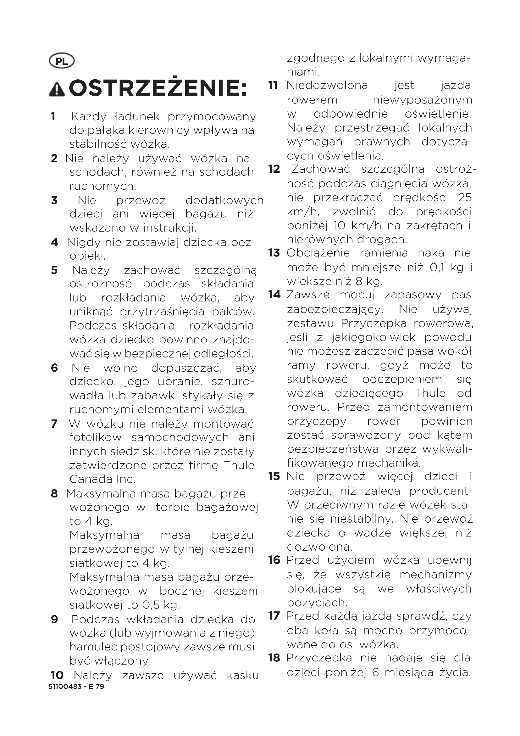 OSTRZEŻENIE: 1 Każdy ładunek przymocowany do pałąka kierownicy wpływa na stabilność wózka. 2 Nie należy używać wózka na schodach, również na schodach ruchomych. 3 Nie przewoź dodatkowych dzieci ani więcej bagażu niż wskazano w instrukcji. 4 Nigdy nie zostawiaj dziecka bez opieki. 5 Należy zachować szczególną ostrożność podczas składania lub rozkładania wózka, aby uniknąć przytrzaśnięcia palców. Podczas składania i rozkładania wózka dziecko powinno znajdo- wać się w bezpiecznej odległości. 6 Nie wolno dopuszczać, aby dziecko, jego ubranie, sznuro- wadła lub zabawki stykały się z ruchomymi elementami wózka. 7 W wózku nie należy montować fotelików samochodowych ani innych siedzisk, które nie zostały zatwierdzone przez firmę Thule Canada Inc. 8 Maksymalna masa bagażu prze- wożonego w torbie bagażowej to 4kg. Maksymalna masa bagażu przewożonego wtylnej kieszeni siatkowej to 4kg. Maksymalna masa bagażu prze- wożonego w bocznej kieszeni siatkowej to 0,5kg. 9 Podczas wkładania dziecka do wózka (lub wyjmowania z niego) hamulec postojowy zawsze musi być włączony. 10 Należy zawsze używać kasku zgodnego zlokalnymi wymaga- niami. 11 Niedozwolona jest jazda rowerem niewyposażonym w odpowiednie oświetlenie. Należy przestrzegać lokalnych wymagań prawnych dotyczą- cych oświetlenia. 12 Zachować szczególną ostroż- ność podczas ciągnięcia wózka, nie przekraczać prędkości 25 km/h, zwolnić do prędkości poniżej 10 km/h na zakrętach i nierównych drogach. 13 Obciążenie ramienia haka nie może być mniejsze niż 0,1 kg i większe niż 8kg. 14 Zawsze mocuj zapasowy pas zabezpieczający. Nie używaj zestawu Przyczepka rowerowa, jeśli z jakiegokolwiek powodu nie możesz zaczepić pasa wokół ramy roweru, gdyż może to skutkować odczepieniem się wózka dziecięcego Thule od roweru. Przed zamontowaniem przyczepy rower powinien zostać sprawdzony pod kątem bezpieczeństwa przez wykwali- fikowanego mechanika. 15 Nie przewoź więcej dzieci i bagażu, niż zaleca producent. W przeciwnym razie wózek sta- nie się niestabilny. Nie przewoź dziecka o wadze większej niż dozwolona. 16 Przed użyciem wózka upewnij się, że wszystkie mechanizmy blokujące są we właściwych pozycjach. 17 Przed każdą jazdą sprawdź, czy oba koła są mocno przymoco- wane do osi wózka. 18 Przyczepka nie nadaje się dla dzieci poniżej 6 miesiąca życia.51100483 - E80 W przypadku dzieci poniżej 6 miesiąca życia należy zasto- sować odpowiednie akcesorium Thule.