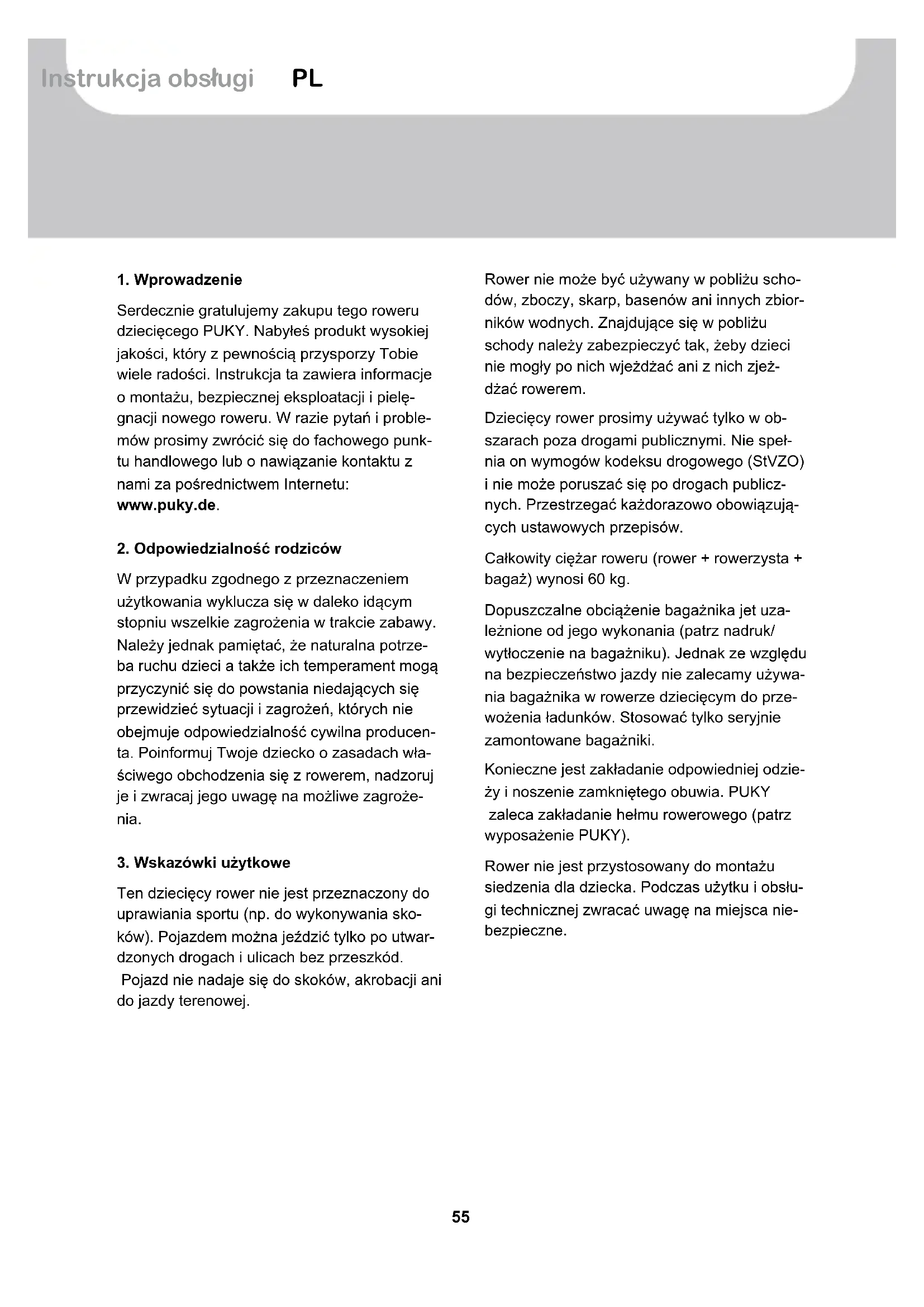 Serdecznie gratulujemy zakupu unto rowerudziecięcego PUKY. Nabyles produkt wysokiejJakosci,ktoryz pewnoscią przysporzy Tobiewiele radosci.Instrukcja ta zawiera informacja o montazu, bezpiecznej eksploataci i pielegnacji nowego roweru.W razie pytan i problemow prosimy zworocic sie do fachowego punktu handlowego lub o nawiązanie kontaku znami za posrechnictwem Internetu: www.puky.de.