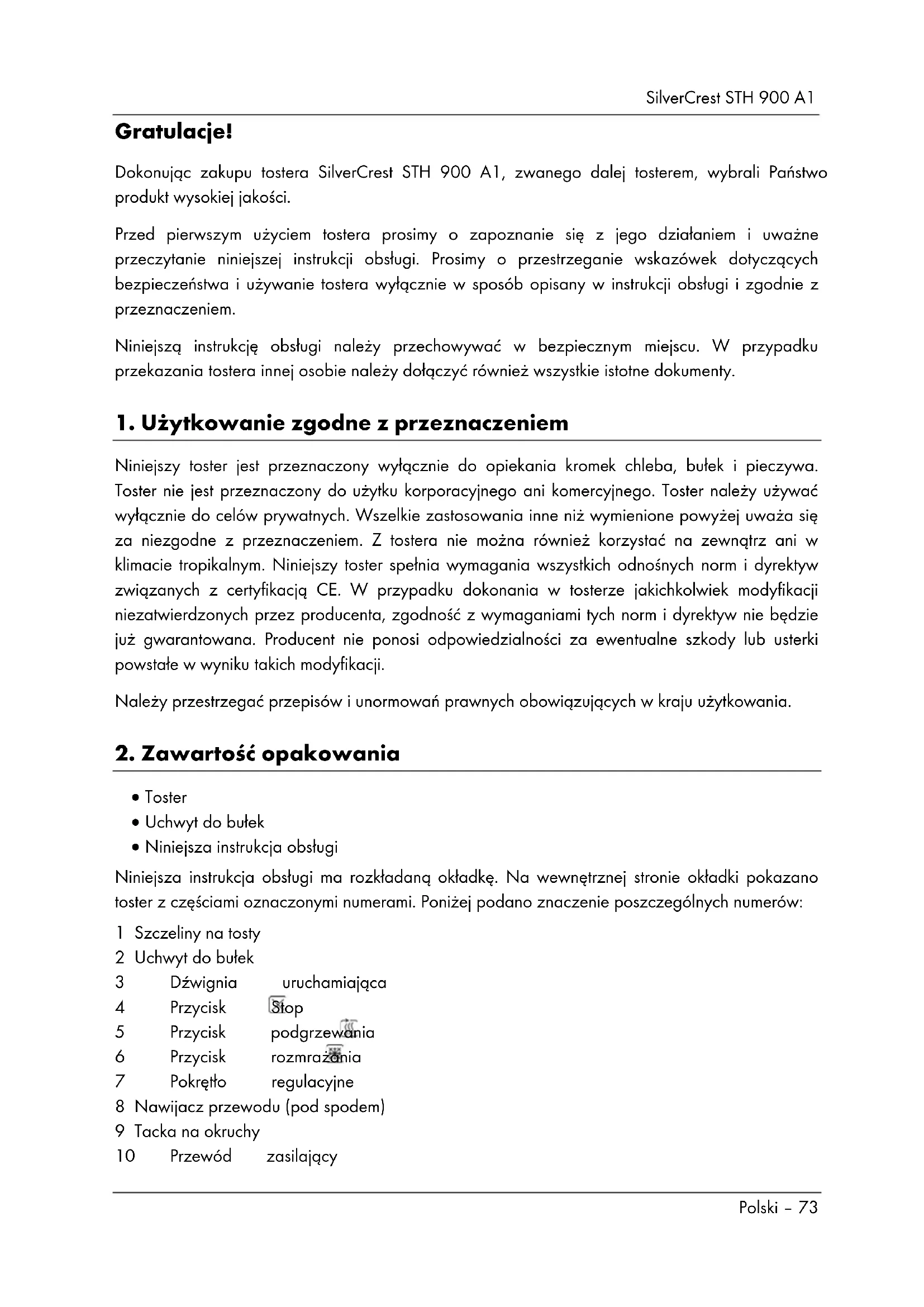 - Niniejsza instrukcja obsługi Niniejsza instrukcja obsługi ma rozkładaną okładkę. Na wewnętrznej stronie okładki pokazano toster z częściami oznaczonymi numerami. Poniżej podano znaczenie poszczególnych numerów: 1 Szczeliny na tosty 2 Uchwyt do bułek 3 Dźwignia uruchamiająca 4 Przycisk Stop 5 Przycisk podgrzewania 6 Przycisk rozmrażania 7 Pokrętło regulacyjne 8 Nawijacz przewodu (pod spodem) 9 Tacka na okruchy 10 Przewód zasilającySilverCrest STH 900 A1 74 – Polski