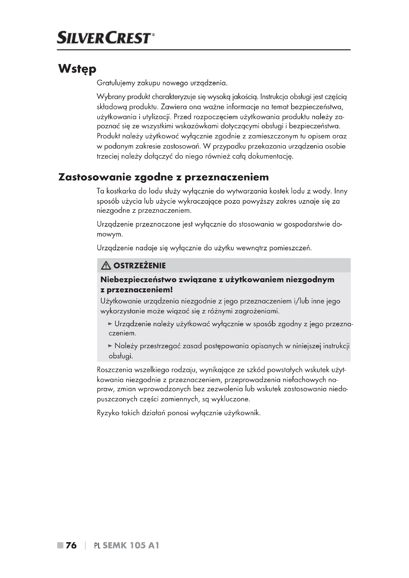 77 ■ SEMK 105 A1 Zakres dostawy Urządzenie dostarczane jest standardowo znastępującymi elementami: ● Kostkarka do lodu ● Koszyk na kostki lodu ● Łopatka do lodu ● Instrukcja obsługi WSKAZÓWKA ► Sprawdź kompletność dostawy oraz czy nie ma widocznych uszkodzeń. ► Wprzypadku niekompletnej dostawy, bądź wystąpienia uszkodzeń wskutek wadliwego opakowania lub transportu należy skontaktować się zinfolinią serwisową (patrz rozdział Serwis). Wskazówki bezpieczeństwa