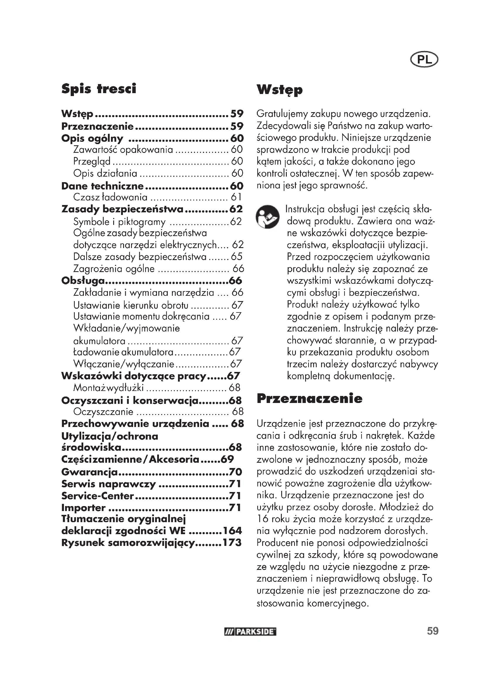 - Wstęp Gratulujemy zakupu nowego urządzenia. Zdecydowali się Państwo na zakup warto- ściowego produktu. Niniejsze urządzenie sprawdzono w trakcie produkcji pod kątem jakości, a także dokonano jego kontroli ostatecznej. W ten sposób zapew- niona jest jego sprawność. Instrukcja obsługi jest częścią skła- dową produktu. Zawiera ona waż- ne wskazówki dotyczące bezpie- czeństwa, eksploatacjii utylizacji. Przed rozpoczęciem użytkowania produktu należy się zapoznać ze wszystkimi wskazówkami dotyczą- cymi obsługi i bezpieczeństwa. Produkt należy użytkować tylko zgodnie z opisem i podanym prze- znaczeniem. Instrukcję należy prze- chowywać starannie, a w przypad- ku przekazania produktu osobom trzecim należy dostarczyć nabywcy kompletną dokumentację. Przeznaczenie Urządzenie jest przeznaczone do przykrę- cania i odkręcania śrub i nakrętek. Każde inne zastosowanie, które nie zostało do- zwolone w jednoznaczny sposób, może prowadzić do uszkodzeń urządzeniai sta- nowić poważne zagrożenie dla użytkow- nika. Urządzenie przeznaczone jest do użytku przez osoby dorosłe. Młodzież do 16 roku życia może korzystać z urządze- nia wyłącznie pod nadzorem dorosłych. Producent nie ponosi odpowiedzialności cywilnej za szkody, które są powodowane ze względu na użycie niezgodne z prze- znaczeniem i nieprawidłową obsługę. To urządzenie nie jest przeznaczone do za- stosowania komercyjnego. Tłumaczenie oryginalnej deklaracji zgodności WE p. 164