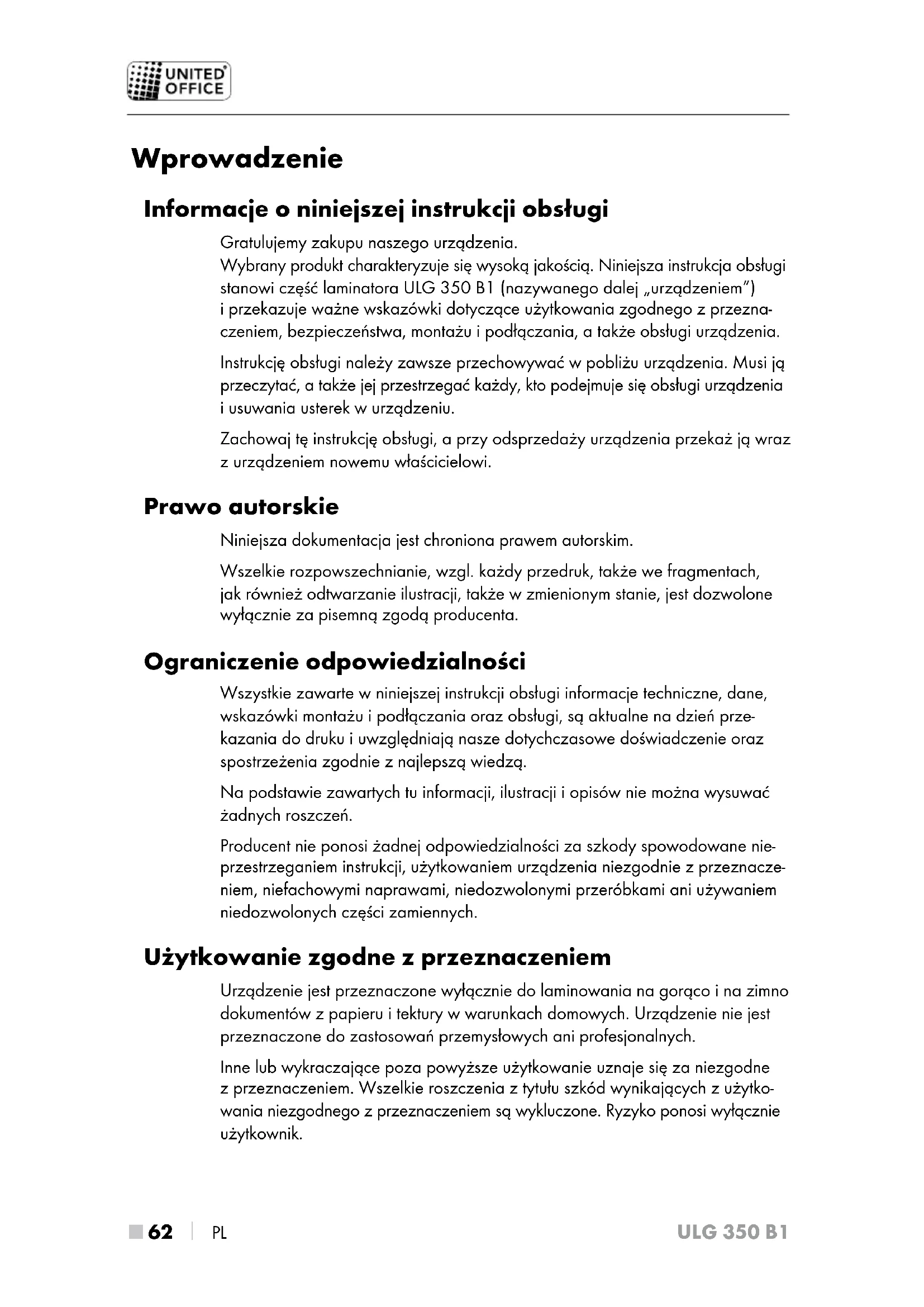 PL ULG 350 B1 Wprowadzenie Informacje o niniejszej instrukcji obsługi Gratulujemy zakupu naszego urządzenia. Wybrany produkt charakteryzuje się wysoką jakością. Niniejsza instrukcja obsługi stanowi część laminatora ULG 350 B1 (nazywanego dalej „urządzeniem”) i przekazuje ważne wskazówki dotyczące użytkowania zgodnego z przezna- czeniem, bezpieczeństwa, montażu i podłączania, a także obsługi urządzenia. Instrukcję obsługi należy zawsze przechowywać w pobliżu urządzenia. Musi ją przeczytać, a także jej przestrzegać każdy, kto podejmuje się obsługi urządzenia i usuwania usterek w urządzeniu. Zachowaj tę instrukcję obsługi, a przy odsprzedaży urządzenia przekaż ją wraz z urządzeniem nowemu właścicielowi. Prawo autorskie Niniejsza dokumentacja jest chroniona prawem autorskim. Wszelkie rozpowszechnianie, wzgl. każdy przedruk, także we fragmentach, jak również odtwarzanie ilustracji, także w zmienionym stanie, jest dozwolone wyłącznie za pisemną zgodą producenta. Ograniczenie odpowiedzialności Wszystkie zawarte w niniejszej instrukcji obsługi informacje techniczne, dane, wskazówki montażu i podłączania oraz obsługi, są aktualne na dzień prze- kazania do druku i uwzględniają nasze dotychczasowe doświadczenie oraz spostrzeżenia zgodnie z najlepszą wiedzą. Na podstawie zawartych tu informacji, ilustracji i opisów nie można wysuwać żadnych roszczeń. Producent nie ponosi żadnej odpowiedzialności za szkody spowodowane nie- przestrzeganiem instrukcji, użytkowaniem urządzenia niezgodnie z przeznacze- niem, niefachowymi naprawami, niedozwolonymi przeróbkami ani używaniem niedozwolonych części zamiennych. Użytkowanie zgodne z przeznaczeniem Urządzenie jest przeznaczone wyłącznie do laminowania na gorąco i na zimno dokumentów z papieru i tektury w warunkach domowych. Urządzenie nie jest przeznaczone do zastosowań przemysłowych ani profesjonalnych. Inne lub wykraczające poza powyższe użytkowanie uznaje się za niezgodne z przeznaczeniem. Wszelkie roszczenia z tytułu szkód wynikających z użytko- wania niezgodnego z przeznaczeniem są wykluczone. Ryzyko ponosi wyłącznie użytkownik.PL