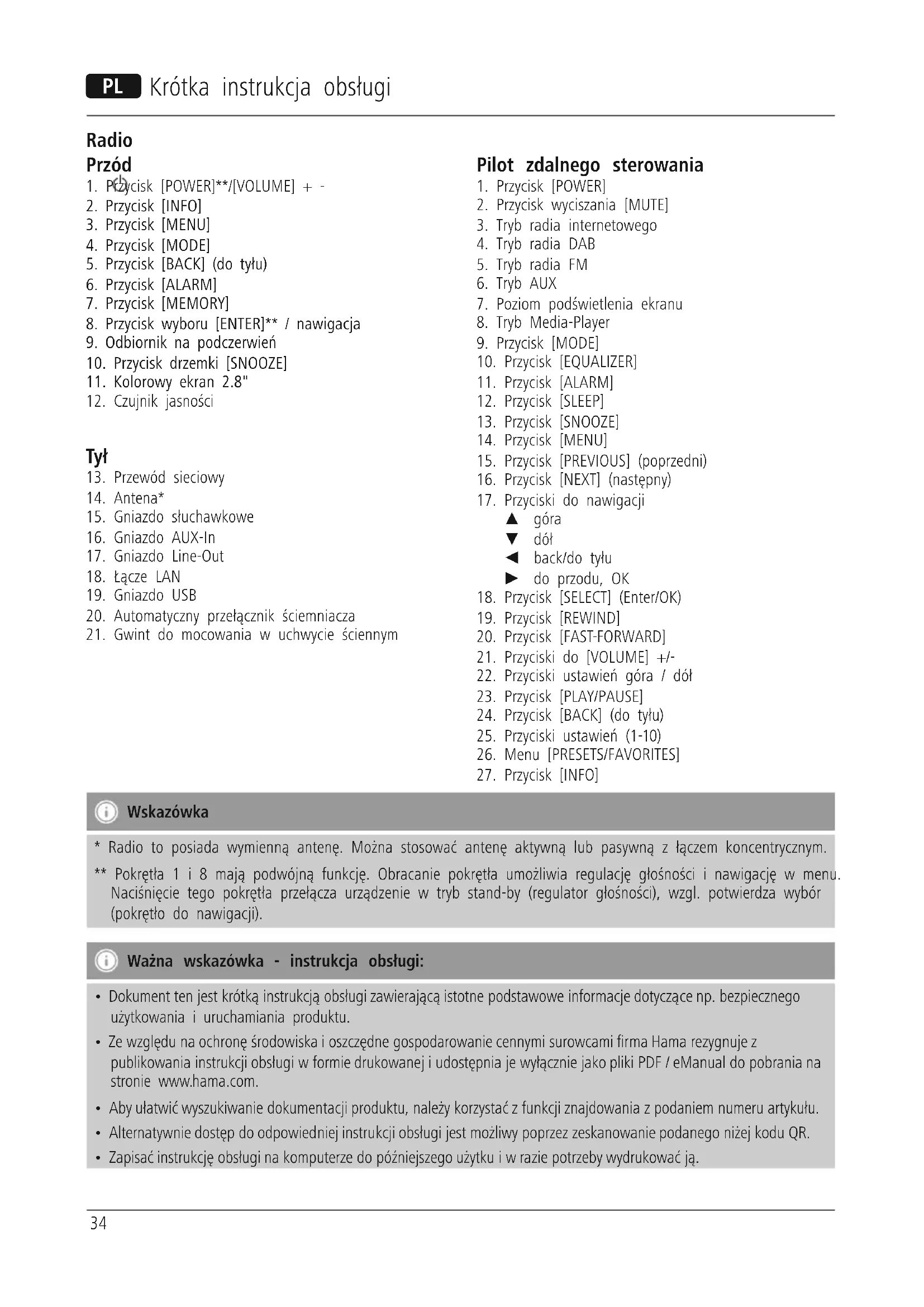 - Ze względu na ochronę środowiska i oszczędne gospodarowanie cennymi surowcami rma Hama rezygnuje z publikowania instrukcji obsługi w formie drukowanej i udostępnia je wyłącznie jako pliki PDF / eManual do pobrania na stronie www.hama.com.