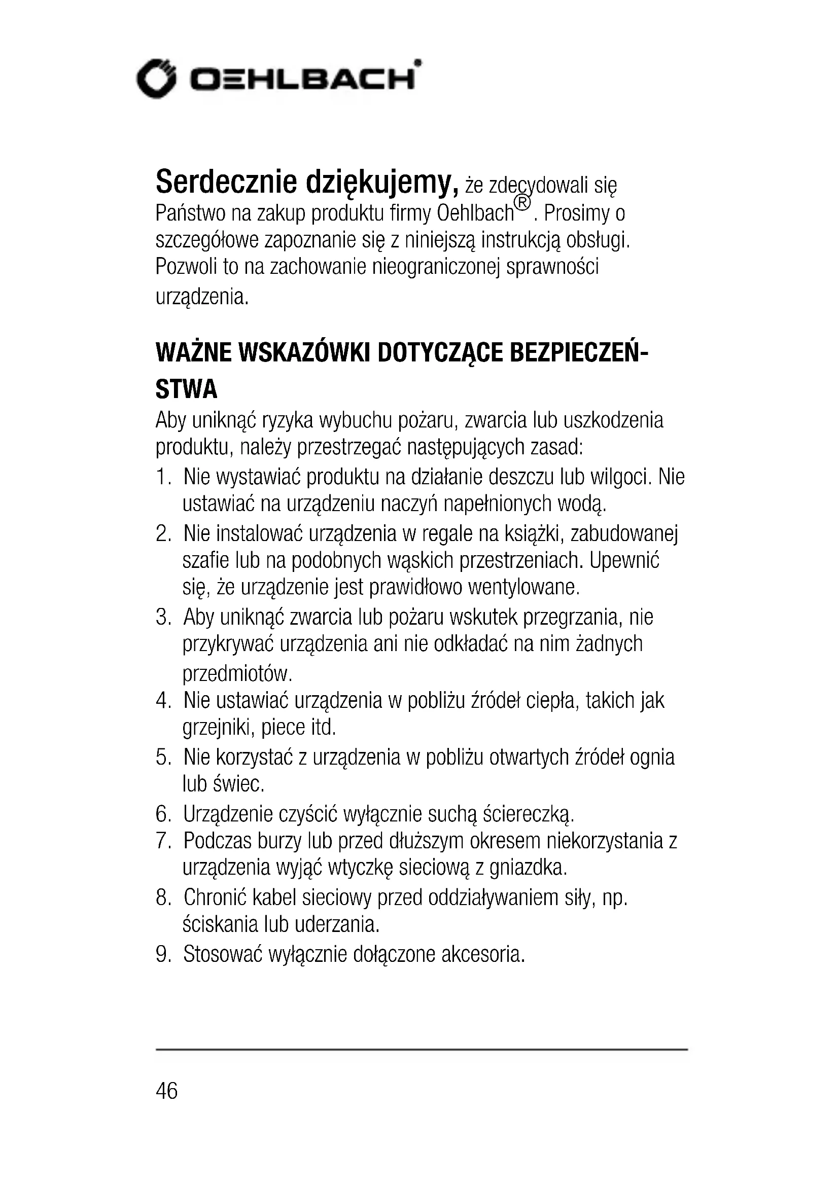 - El reembolso que se pague a terceros por la reparación de daños, sin nuestro previo consentimiento46 Serdecznie dziękujemy, że zdecydowali się Państwo na zakup produktu firmy Oehlbach