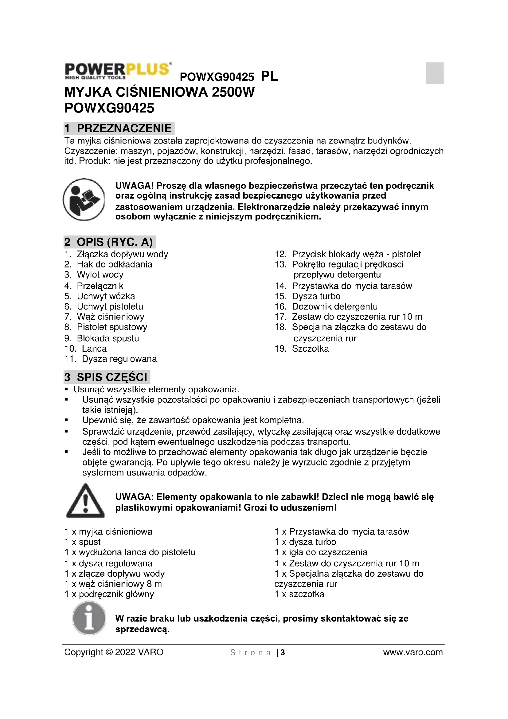 - Jeśli to możliwe to przechować elementy opakowania tak długo jak urządzenie będzie objęte gwarancją. Po upływie tego okresu należy je wyrzucić zgodnie z przyjętym systemem usuwania odpadów. UWAGA: Elementy opakowania to nie zabawki! Dzieci nie mogą bawić się plastikowymi opakowaniami! Grozi to uduszeniem! 1 x myjka ciśnieniowa 1 x spust 1 x wydłużona lanca do pistoletu 1 x dysza regulowana 1 x złącze dopływu wody 1 x wąż ciśnieniowy 8 m 1 x podręcznik główny 1 x Przystawka do mycia tarasów 1 x dysza turbo 1 x igła do czyszczenia 1 x Zestaw do czyszczenia rur 10 m 1 x Specjalna złączka do zestawu do czyszczenia rur 1 x szczotka W razie braku lub uszkodzenia części, prosimy skontaktować się ze sprzedawcą.POWXG90425 PL Copyright © 2022 VARO S t r o n a | 4 www.varo.com 4 OZNACZENIA W niniejszej instrukcji i/lub na urządzeniu użyto następujących symboli: