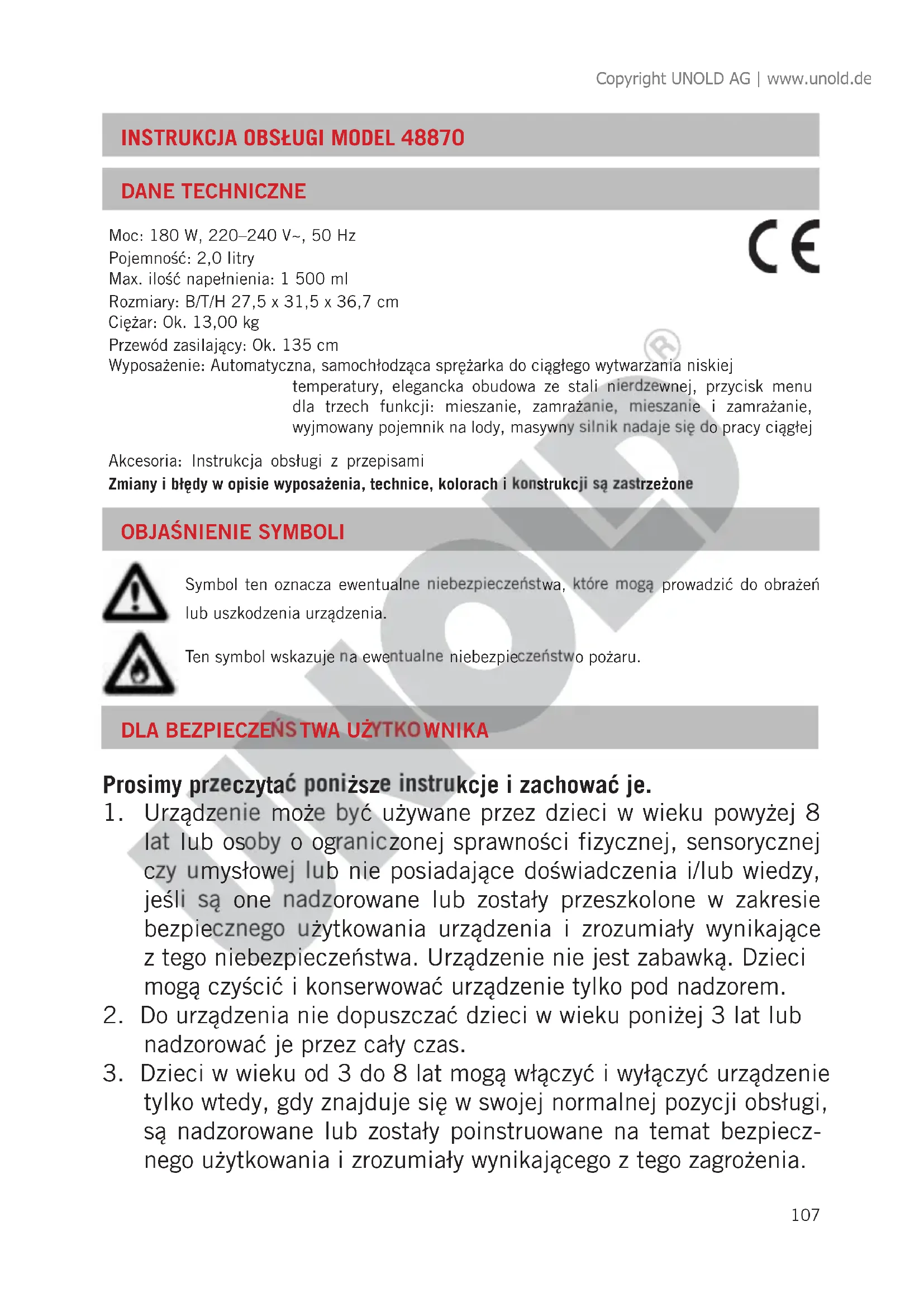 Symbol ten oznacza ewentualne niebezpieczeństwa, które mogą prowadzić do obrażeń lub uszkodzenia urządzenia. Ten symbol wskazuje na ewentualne niebezpieczeństwo pożaru. Copyright UNOLD AG | www.unold.de108 Dzieci w wieku od 3 do 8 lat nie mogą urządzenia podłączać, obsługiwać, czyścić ani konserwować.