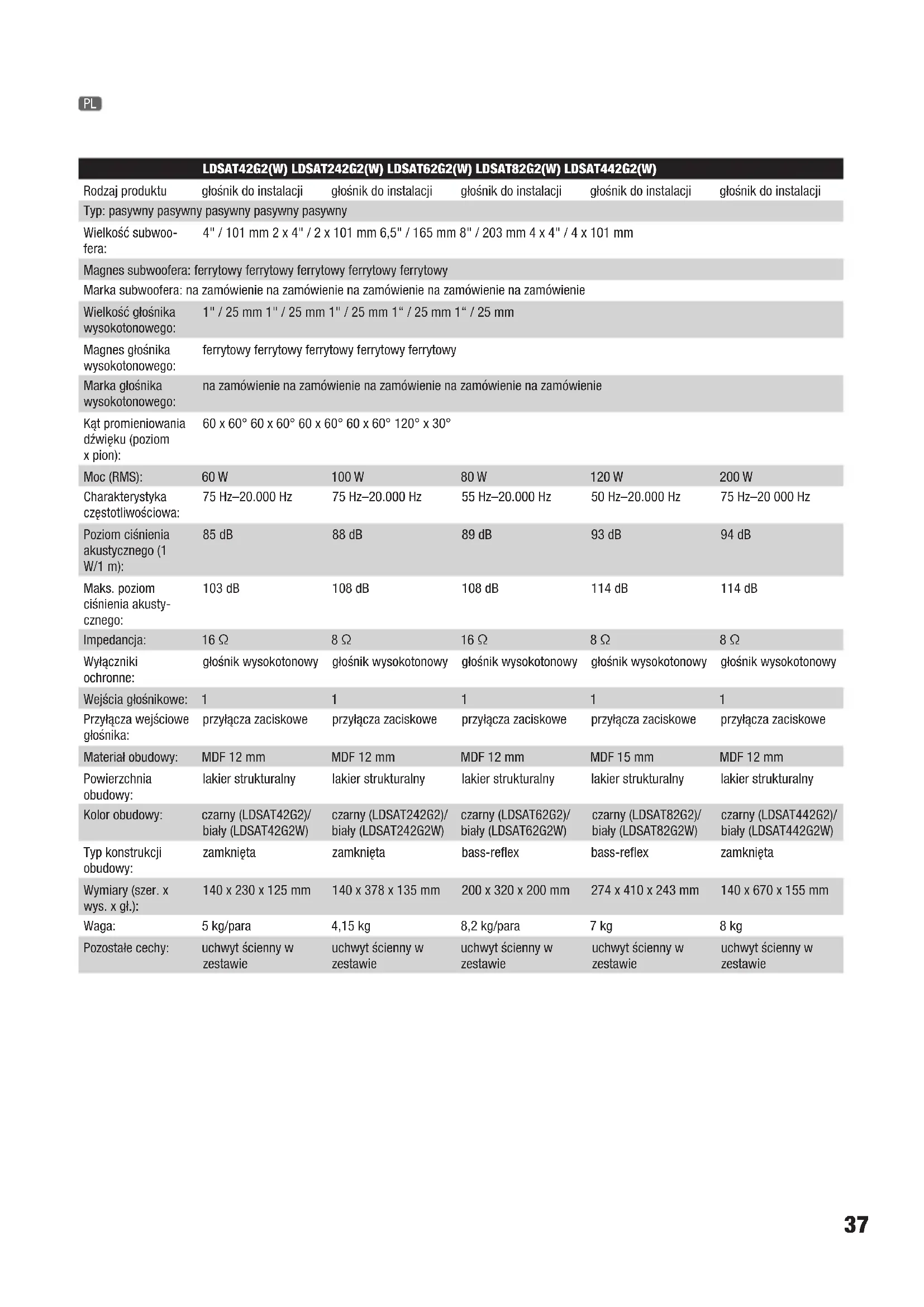 PL WSKAZOWKA: kazdy zestaw glosnikowy seri i SATG2 zawiera uchyty scienne do montazu nasciennego. Zestaw glosnikowy LDSAT242G2(W) zawiera dodatkowo oprocz uchyty do montazu pionowego takze uchyto do montazu poziomego.