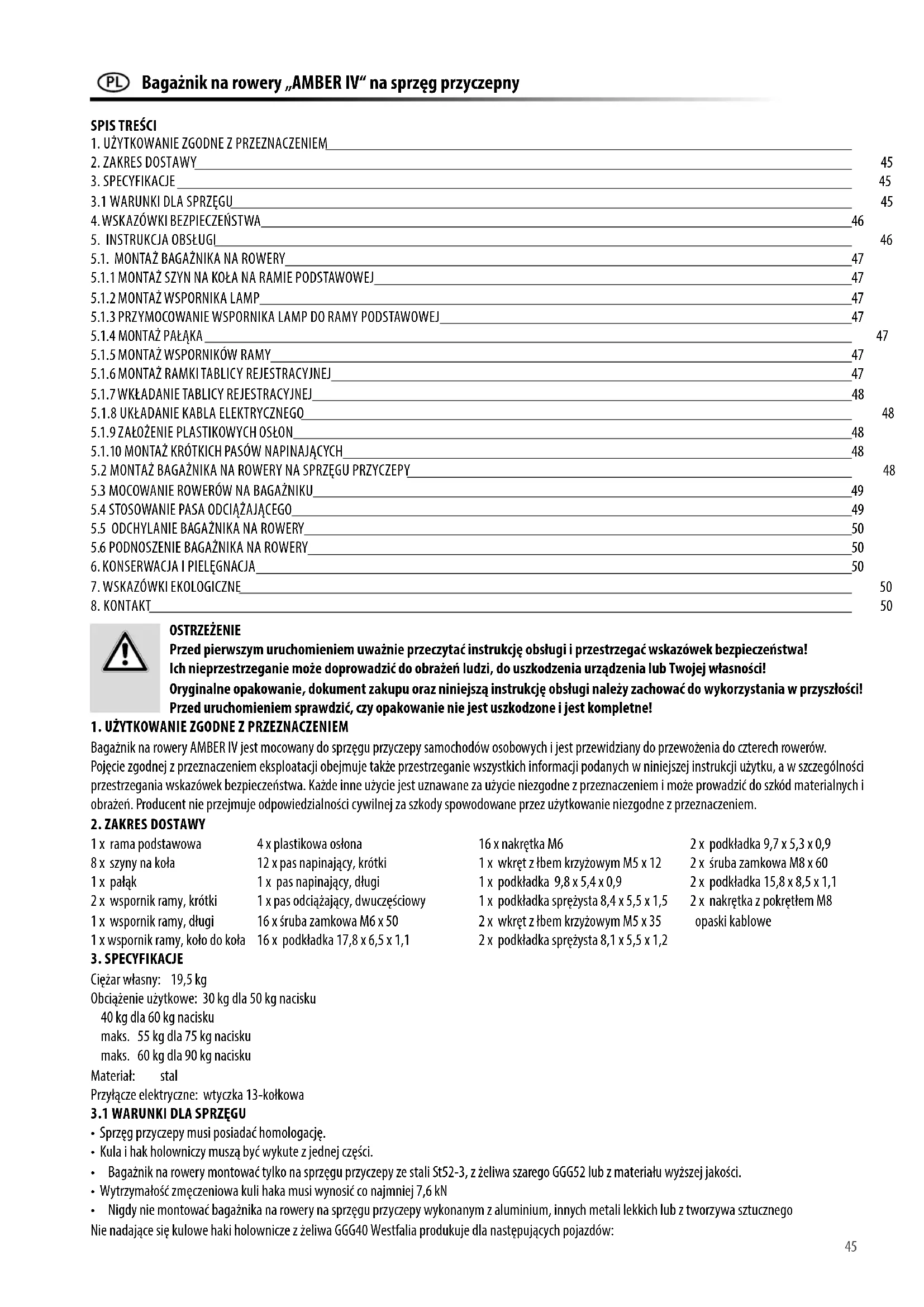 - Bagażnik na rowery montować tylko na sprzęgu przyczepy ze stali St52-3, z żeliwa szarego GGG52 lub z materiału wyższej jakości.
