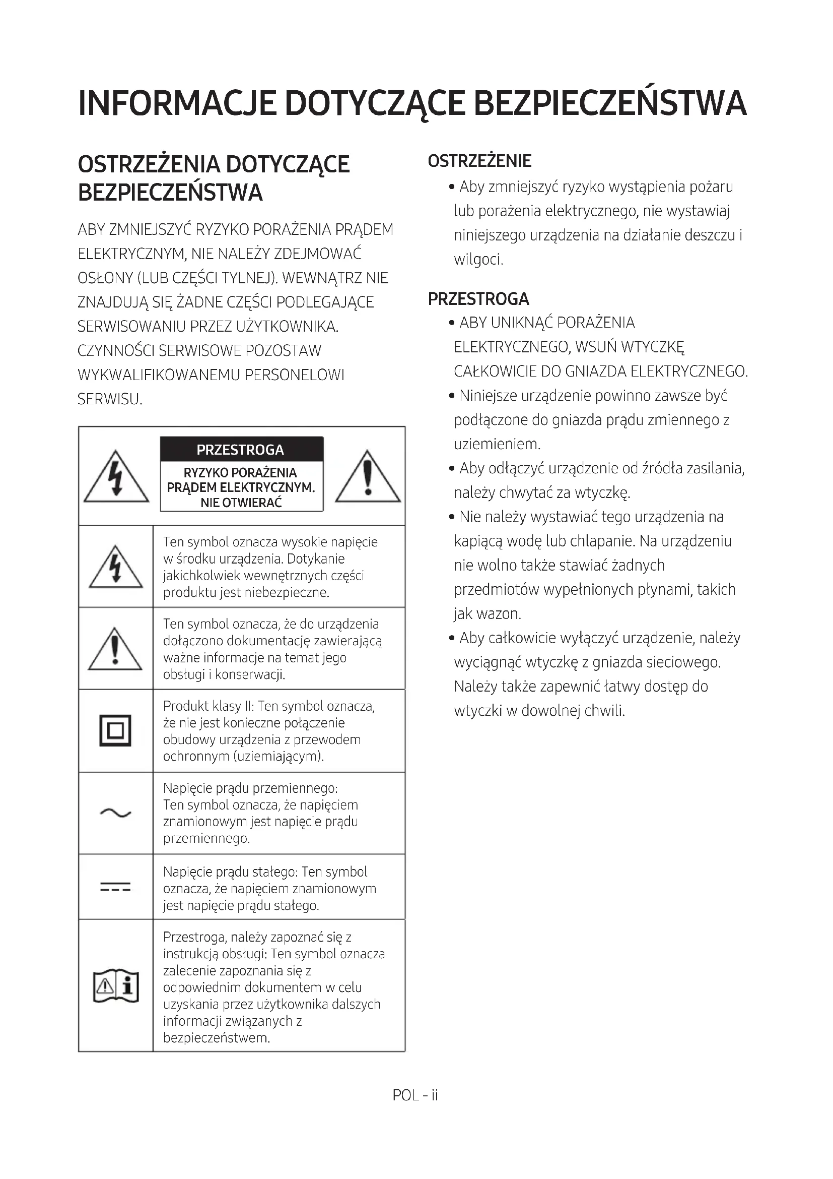 - Aby całkowicie wyłączyć urządzenie, należy wyciągnąć wtyczkę z gniazda sieciowego. Należy także zapewnić łatwy dostęp do wtyczki w dowolnej chwili.POL - iii