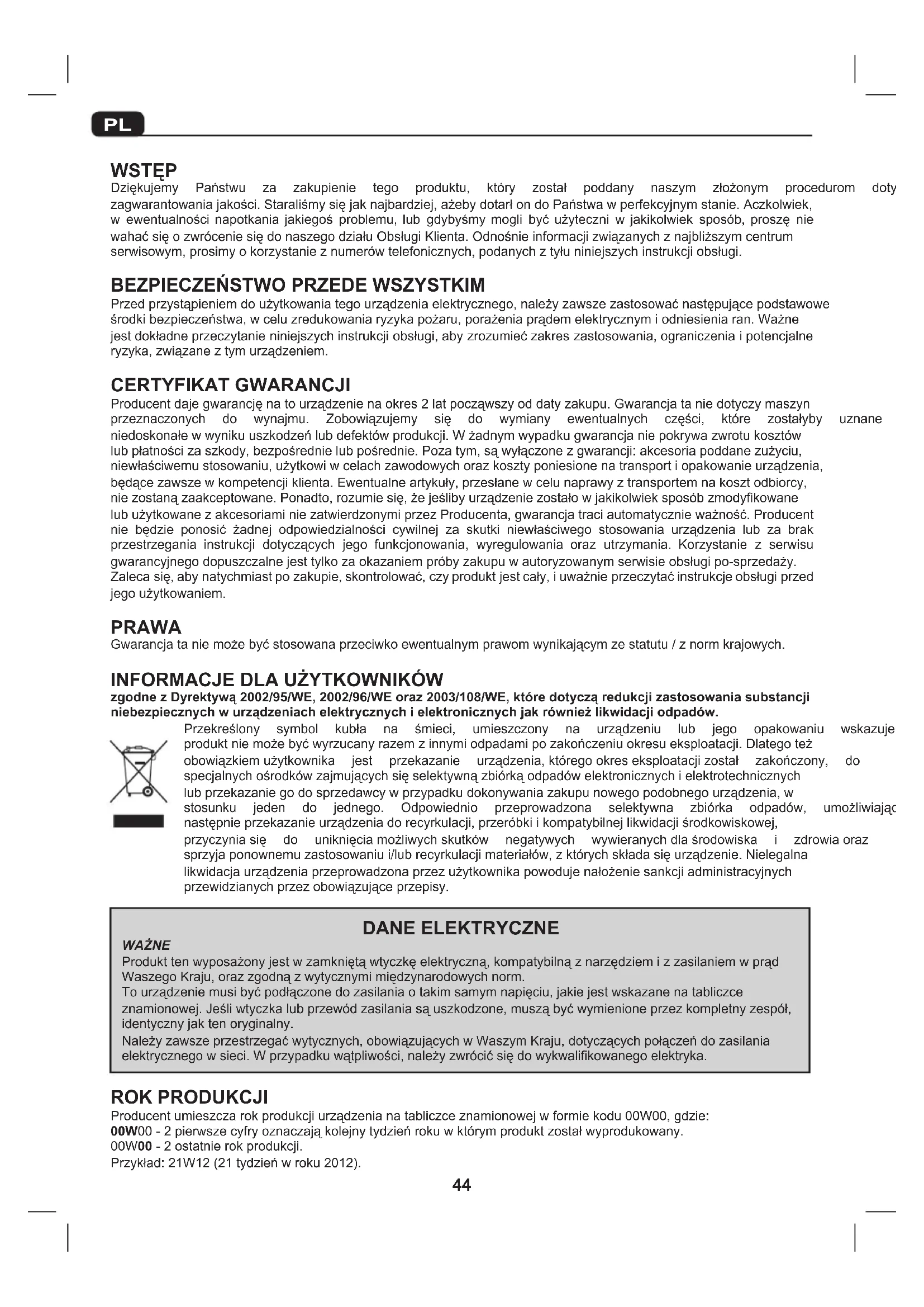 zgodne z Dyrektywą 2002/95/WE, 2002/96/WE oraz 2003/108/WE, które dotyczą redukcji zastosowania substancji niebezpiecznych w urządzeniach elektrycznych i elektronicznych jak również likwidacji odpadów. Przekreślony symbol kubła na śmieci, umieszczony na urządzeniu lub jego opakowaniu wskazuje, że produktniemożebyćwyrzucanyrazemzinnymiodpadamipozakończeniuokresueksploatacji.Dlategoteż obowiązkiemużytkownika jest przekazanie urządzenia,któregookreseksploatacjizostał zakończony, do specjalnychośrodkówzajmującychsięselektywnązbiórkąodpadówelektronicznychielektrotechnicznych lubprzekazaniegodosprzedawcywprzypadkudokonywaniazakupunowegopodobnegourządzenia,w stosunku jeden do jednego. Odpowiednio przeprowadzona selektywna zbiórka odpadów, umożliwiająca następnieprzekazanieurządzeniadorecyrkulacji,przeróbkiikompatybilnejlikwidacjiśrodkowiskowej, przyczyniasię do uniknięciamożliwychskutków negatywych wywieranychdlaśrodowiska i zdrowiaoraz sprzyjaponownemuzastosowaniui/lubrecyrkulacjimateriałów,zktórychskładasięurządzenie.Nielegalna likwidacjaurządzeniaprzeprowadzonaprzezużytkownikapowodujenałożeniesankcjiadministracyjnych przewidzianychprzezobowiązująceprzepisy. DANE ELEKTRYCZNE WAŻNE Produkttenwyposażonyjestwzamkniętąwtyczkęelektryczną,kompatybilnąznarzędziemizzasilaniemwprąd WaszegoKraju,orazzgodnązwytycznymimiędzynarodowychnorm. Tourządzeniemusibyćpodłączonedozasilaniaotakimsamymnapięciu,jakiejestwskazanenatabliczce znamionowej.Jeśliwtyczkalubprzewódzasilaniasąuszkodzone,musząbyćwymienioneprzezkompletnyzespół, identyczny jak ten oryginalny. Należyzawszeprzestrzegaćwytycznych,obowiązującychwWaszymKraju,dotyczącychpołączeńdozasilania elektrycznegowsieci.Wprzypadkuwątpliwości,należyzwrócićsiędowykwalifikowanegoelektryka. ROK PRODUKCJI Producentumieszczarokprodukcjiurządzenianatabliczceznamionowejwformiekodu00W00,gdzie: 00W00-2pierwszecyfryoznaczająkolejnytydzieńrokuwktórymproduktzostałwyprodukowany. 00W00-2ostatnierokprodukcji. Przykład:21W12(21tydzieńwroku2012).45