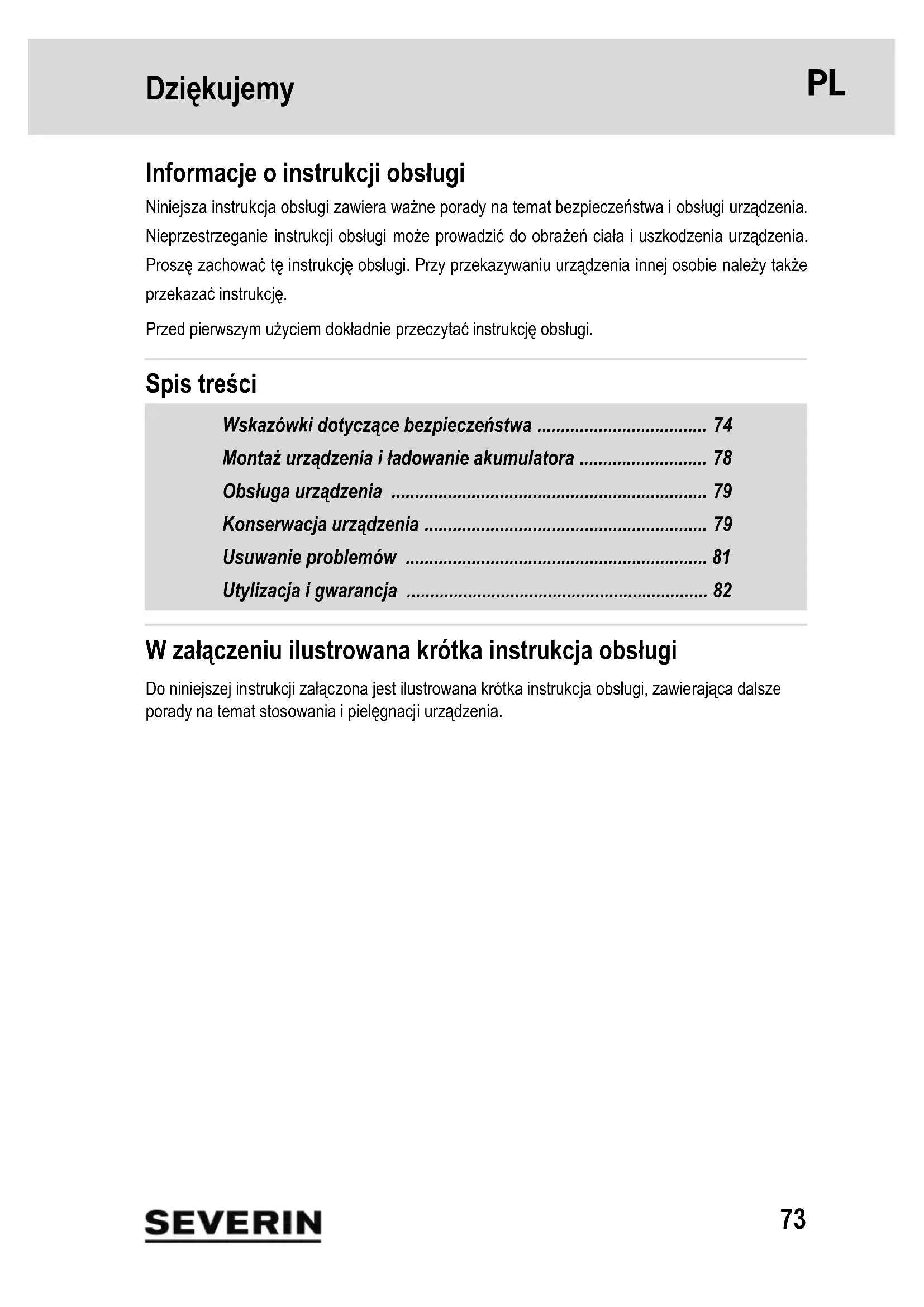 - Separat skrotning av batteriet och apparaten Apparater och batterier som har försetts med den här symbolen måste sopsorteras separerade från hushållssopor! Sådana apparater och batterier innehåller värdeful- la ämnen som kan återanvändas. En korrekt utförd sopsortering skyddar miljön och dina medmänniskors hälsa. Lämna apparaten och det uttagna batteriet separat för skrotning på en återvinningsstation. Garanti Den lagstadgade garantin från säljaren och eventuella säljgarantier berörs inte av de efterföljande garantivillkoren. Kontakta vår kundtjänst per telefon eller e-post, om en reparation skulle krävas. Kontaktupp- gifterna hittar du i bilagan i den här bruksanvisningen. Kontakta annars återförsäljaren direkt i ett garantifall. Dessutom lämnar SEVERIN en tillverkargaranti på två år från inköpsdatumet. Under den tidsperioden åtgärder vi kostnadsfritt alla fel som bevisligen beror på material- eller tillverk- ningsfel och som påverkar funktionen negativt i avsevärd omfattning. Övriga anspråk utesluts. Garantin gäller inte för: Skador som härleds från ignorering av bruksanvisningen, felaktig använd- ning eller normalt slitage, inte heller för ömtåliga delar såsom glas, plast och lysdioder. Från garantin undantas även uppladdningsbara och andra batterier som blivit defekta eller vars drifttid förkortats till följd av onormalt slitage eller felaktig hantering. Garantin upphör att gälla vid ingrepp som gjorts av annan än en av SEVERIN auktoriserad verkstad.73 Dziękujemy 1Dziękujemy Informacje o instrukcji obsługi Niniejsza instrukcja obsługi zawiera ważne porady na temat bezpieczeństwa i obsługi urządzenia. Nieprzestrzeganie instrukcji obsługi może prowadzić do obrażeń ciała i uszkodzenia urządzenia. Proszę zachować tę instrukcję obsługi. Przy przekazywaniu urządzenia innej osobie należy także przekazać instrukcję. Przed pierwszym użyciem dokładnie przeczytać instrukcję obsługi. Spis treści Wskazówki dotyczące bezpieczeństwa p. 74