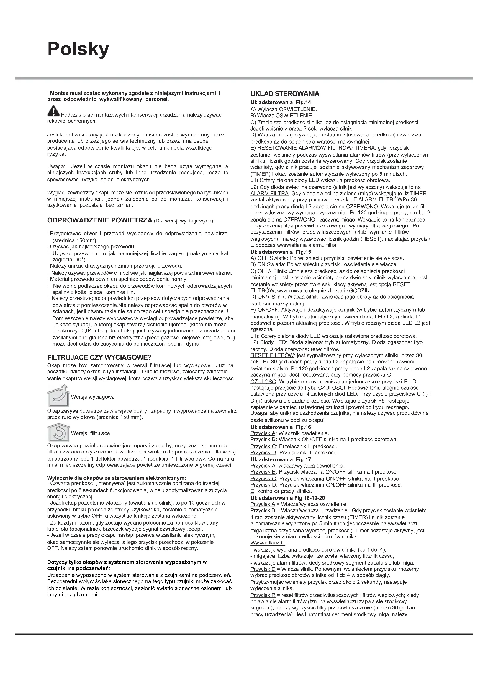Podczas prac montazowych i konserwacji urzadzenia nalezy uzywac rekawic ochronnych. Jesli kabel zasilajacy jest uszkodzony, musi on zostac wymieniony przez producenta lub przez jego serwis techniczny lub przez inna osobe posiadajaca odpowiednie kwalifikacje, w celu unikniecia wszelkiego ryzyka. Uwaga: Jezeli w czasie montazu okapu nie beda uzyte wymagane w niniejszych instrukcjach sruby lub inne urzadzenia mocujace, moze to spowodowac ryzyko spiec elektrycznych. Wyglad zewnetrzny okapu moze sie róznic od przedstawionego na rysunkach w niniejszej instrukcji, jednak zalecenia co do montazu, konserwacji i uzytkowania pozostaja bez zmian. ODPROWADZENIE POWIETRZA (Dla wersji wyciagowych) ! Przygotowac otwór i przewód wyciagowy do odprowadzania powietrza (srednica 150mm). ! Uzywac jak najkrótszego przewodu ! Uzywac przewodu o jak najmniejszej liczbie zagiec (maksymalny kat zagiecia: 90°). ! Nalezy unikac drastycznych zmian przekroju przewodu. ! Nalezy uzywac przewodów o mozliwie jak najgladszej powierzchni wewnetrznej. ! Material przewodu powinien spelniac odpowiednie normy. ! Nie wolno podlaczac okapu do przewodów kominowych odprowadzajacych spaliny z kotla, pieca, kominka i in. ! Nalezy przestrzegac odpowiednich przepisów dotyczacych odprowadzania powietrza z pomieszczenia.Nie nalezy odprowadzac spalin do otworów w scianach, jesli otwory takie nie sa do tego celu specjalnie przeznaczone. ! Pomieszczenie nalezy wyposazyc w wyciagi odprowadzajace powietrze, aby uniknac sytuacji, w której okap stworzy cisnienie ujemne (które nie moze przekroczyc 0,04 mbar). Jezeli okap jest uzywany jednoczesnie z urzadzeniami zasilanymi energia inna niz elektryczna (piece gazowe, olejowe, weglowe, itd.) moze dochodzic do zasysania do pomieszczen spalin i dymu. FILTRUJACE CZY WYCIAGOWE? Okap moze byc zamontowany w wersji filtrujacej lub wyciagowej. Juz na poczatku nalezy okreslic typ instalacji. O ile to mozliwe, zalecamy zainstalo- wanie okapu w wersji wyciagowej, która pozwala uzyskac wieksza skutecznosc. Wersja wyciagowa Okap zasysa powietrze zawierajace opary i zapachy i wyprowadza na zewnatrz przez rure wylotowa (srednica 150 mm). Wersja filtrujaca Okap zasysa powietrze zawierajace opary i zapachy, oczyszcza za pomoca filtra i zwraca oczyszczone powietrze z powrotem do pomieszczenia. Dla wersji tej potrzebny jest: 1 deflektor powietrza, 1 redukcja, 1 filtr weglowy. Górna rura musi miec szczeliny odprowadzajace powietrze umieszczone w górnej czesci. Wylacznie dla okapów ze sterowaniem elektronicznym: - Czwarta predkosc (intensywna) jest automatycznie obnizana do trzeciej predkosci po 5 sekundach funkcjonowania, w celu zoptymalizowania zuzycia energii elektrycznej. - Jezeli okap pozostanie wlaczony (swiatla i/lub silnik), to po 10 godzinach w przypadku braku polecen ze strony uzytkownika, zostanie automatycznie ustawiony w trybie OFF, a wszystkie funkcje zostana wylaczone. - Za kazdym razem, gdy zostaje wydane polecenie za pomoca klawiatury lub pilota (opcjonalnie), brzeczyk wydaje sygnal dzwiekowy „beep”. - Jezeli w czasie pracy okapu nastapi przerwa w zasilaniu elektrycznym, okap samoczynnie sie wylacza, a jego przycisk przechodzi w polozenie OFF. Nalezy zatem ponownie uruchomic silnik w sposób reczny. Dotyczy tylko okapów z systemem sterowania wyposażonym w czujniki na podczerwień: Urządzenie wyposażono w system sterowania z czujnikami na podczerwień. Bezpośredni wpływ światła słonecznego na tego typu czujniki może zakłócać ich działanie. W razie konieczności, zasłonić światło słoneczne osłonami lub innymi urządzeniami. UKLAD STEROWANIA Ukladsterowania Fig.14 A) Wylacza OSWIETLENIE. B) Wlacza OSWIETLENIE. C) Zmniejsza predkosc siln ika, az do osiagniecia minimalnej predkosci. Jezeli wcisniety przez 2 sek. wylacza silnik. D) Wlacza silnik (przywolujac ostatnio stosowana predkosc) i zwieksza predkosc az do osiagniecia wartosci maksymalnej. E) RESETOWANIE ALARMÓW FILTRÓW/ TIMERA: gdy przycisk zostanie wcisniety podczas wyswietlania alarmów filtrów (przy wylaczonym silniku) licznik godzin zostanie wyzerowany. Gdy przycisk zostanie wcisniety, gdy silnik pracuje, zostanie aktywowany mechanizm zegarowy (TIMER) i okap zostanie automatycznie wylaczony po 5 minutach. L1) Cztery zielone diody LED wskazuja predkosc obrotowa. L2) Gdy dioda swieci na czerwono (silnik jest wylaczony) wskazuje to na ALARM FILTRA. Gdy dioda swieci na zielono (miga) wskazuje to, iz TIMER zostal aktywowany przy pomocy przycisku E.ALARM FILTRÓWPo 30 godzinach pracy dioda L2 zapala sie na CZERWONO. Wskazuje to, ze filtr przeciwtluszczowy wymaga czyszczenia. Po 120 godzinach pracy, dioda L2 zapala sie na CZERWONO i zaczyna migac. Wskazuje to na koniecznosc oczyszczenia filtra przeciwtluszczowego i wymiary filtra weglowego. Po oczyszczeniu filtrów przeciwtluszczowych (i/lub wymianie filtrów weglowych), nalezy wyzerowac licznik godzin (RESET), naciskajac przycisk E podczas wyswietlania alarmu filtra. Ukladsterowania Fig.15 A) OFF Swiatla: Po wcisnieciu przycisku oswietlenie sie wylacza. B) ON Swiatla: Po wcisnieciu przycisku oswietlenie sie wlacza. C) OFF/- Silnik: Zmniejsza predkosc, az do osiagniecia predkosci minimalnej. Jesli zostanie wcisniety przez dwie sek. silnik wylacza sie. Jesli zostanie wcisniety przez dwie sek. kiedy aktywna jest opcja RESET FILTRÓW, wyzerowaniu ulegnie zliczanie GODZIN. D) ON/+ Silnik: Wlacza silnik i zwieksza jego obroty az do osiagniecia wartosci maksymalnej. E) ON/OFF: Aktywuje i dezaktywuje czujnik (w trybie automatycznym lub manualnym). W trybie automatycznym swieci dioda LED L2, a dioda L1 podswietla poziom aktualnej predkosci. W trybie recznym dioda LED L2 jest zgaszona. L1): Cztery zielone diody LED wskazuja ustawiona predkosc obrotowa. L2) Diody LED: Dioda zielona: tryb automatyczny. Dioda zgaszona: tryb reczny. Dioda czerwona: reset filtrów. RESET FILTRÓW: jest sygnalizowany przy wylaczonym silniku przez 30 sek.: Po 30 godzinach pracy dioda L2 zapala si