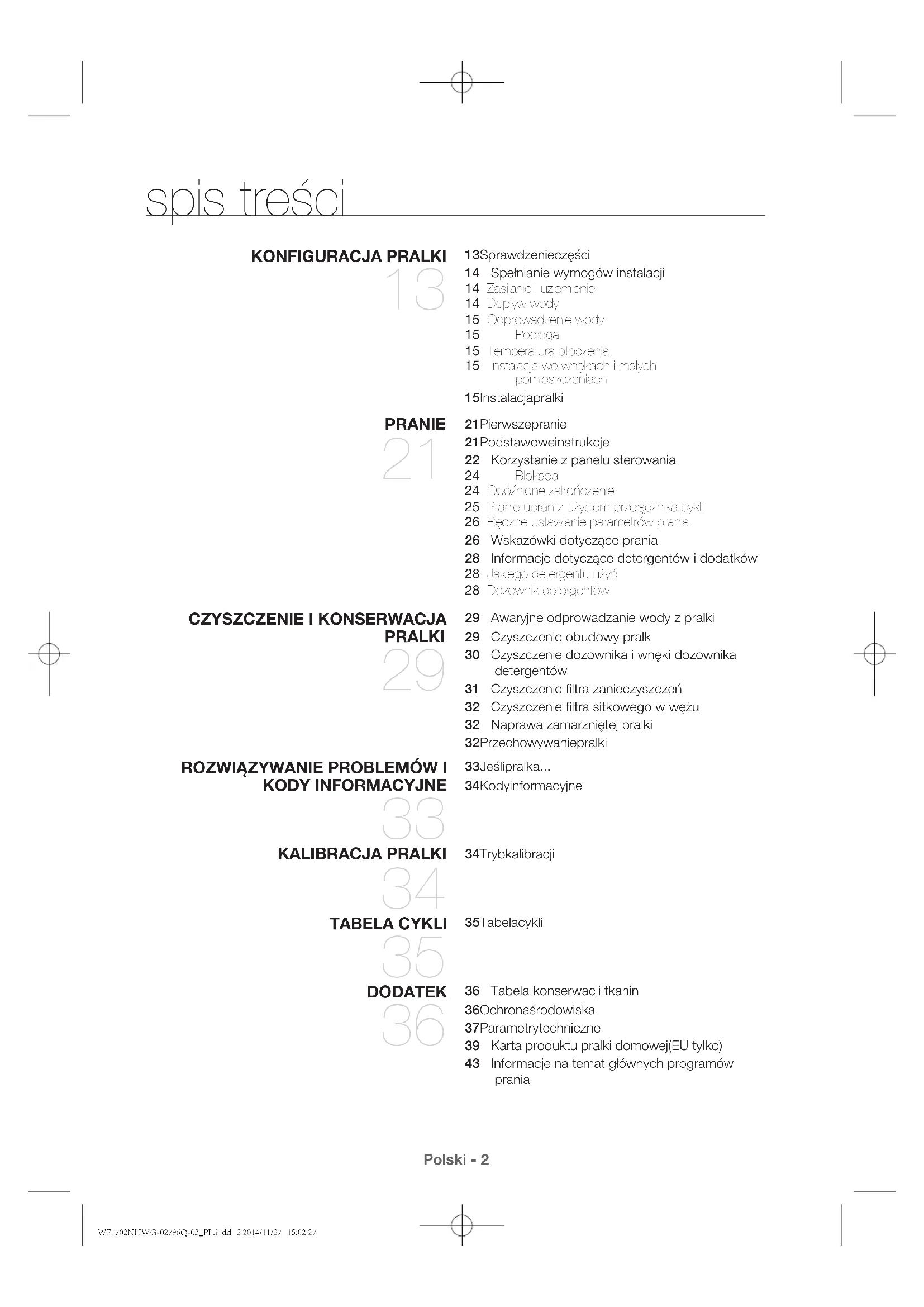 36 Tabela konserwacji tkanin 36 Ochrona środowiska 37 Parametry techniczne 39 Karta produktu pralki domowej(EU tylko) 43 Informacje na temat głównych programów prania WF1702NHWG-02796Q-03_PL.indd 2 2014/11/27 15:02:27Polski - 3 zasady bezpieczeństwa Gratulujemy zakupu nowej pralki Samsung ActivFresh™. Niniejsza instrukcja zawiera ważne informacje dotyczące instalacji, użytkowania i konserwacji tego urządzenia. Przeczytanie niniejszej instrukcji pozwoli w pełni wykorzystać zalety i funkcje pralki. CO TRZEBA WIEDZIEĆ O INSTRUKCJACH BEZPIECZEŃSTWA Zapoznaj się dokładnie z niniejszą instrukcją. Pozwoli to na bezpieczną i wydajną obsługę wielu funkcji Twojego nowego urządzenia. Przechowuj na przyszłość instrukcję w bezpiecznym miejscu w pobliżu urządzenia. Używaj urządzenia tylko zgodnie z jego zamierzonym przeznaczeniem opisanym w niniejszej instrukcji obsługi. Ostrzeżenia i ważne instrukcje dotyczące bezpieczeństwa umieszczone w tej instrukcji nie obejmują wszystkich warunków i sytuacji, z którymi może zetknąć się użytkownik. Podczas instalacji, konserwacji i obsługi pralki należy zachować szczególną ostrożność i zdrowy rozsądek. Ponieważ przedstawiona instrukcja obsługi dotyczy różnych modeli, funkcje Twojej pralki mogą się nieznacznie różnić od tych opisanych w niniejszej instrukcji. Dodatkowo, nie wszystkie znaki ostrzegawcze mogą mieć zastosowanie. W przypadku jakichkolwiek pytań lub uwag, skontaktuj się z najbliższym centrum serwisowym lub uzyskaj pomoc i informacje online na stronie www.samsung.com.