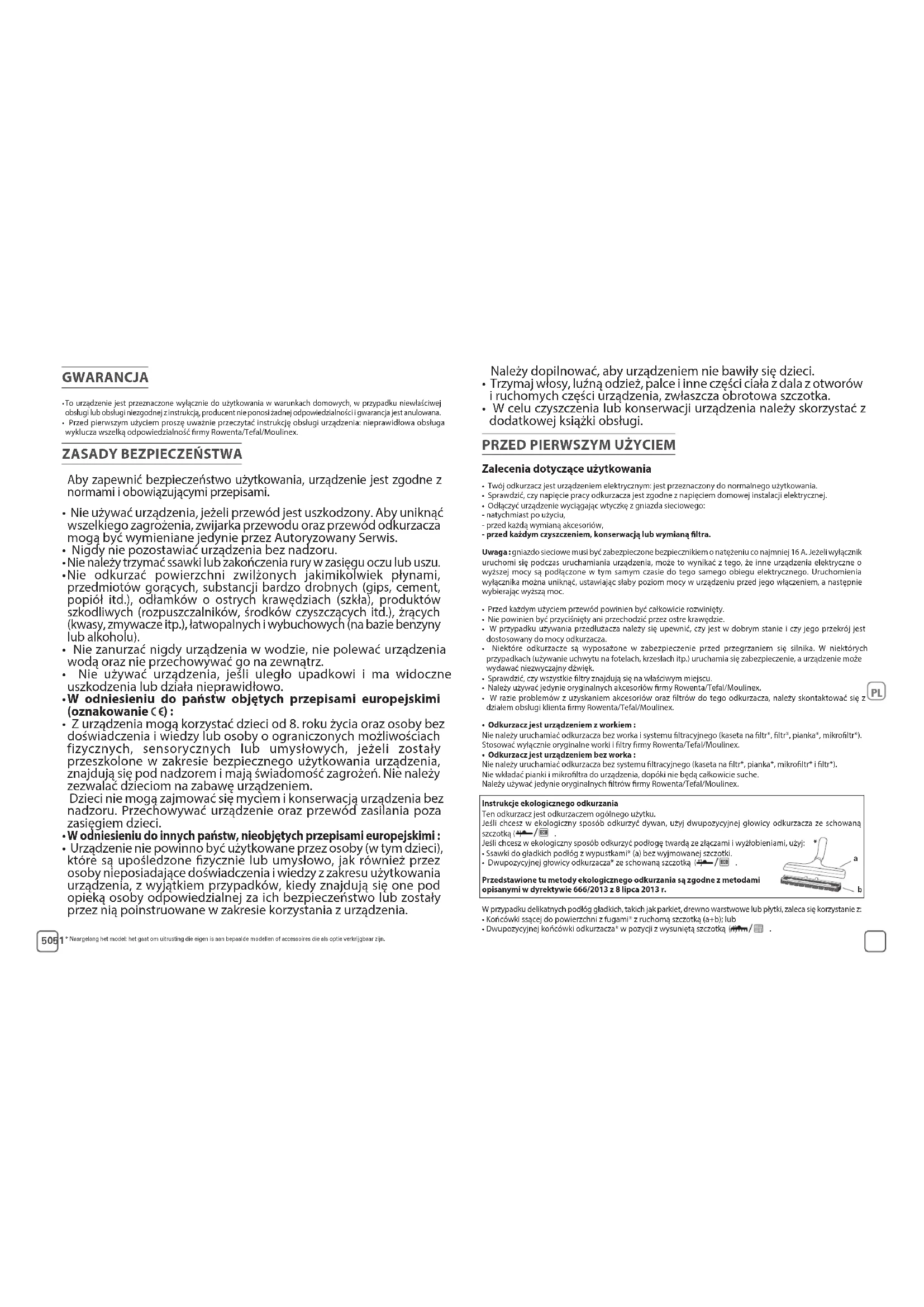 - Twój odkurzacz jest urządzeniem elektrycznym: jest przeznaczony do normalnego użytkowania.• Sprawdzić, czy napięcie pracy odkurzacza jest zgodne z napięciem domowej instalacji elektrycznej.• Odłączyć urządzenie wyciągając wtyczkę z gniazda sieciowego:- natychmiast po użyciu,- przed każdą wymianą akcesoriów,- przed każdym czyszczeniem, konserwacją lub wymianą ltra. Uwaga : gniazdo sieciowe musi być zabezpieczone bezpiecznikiem o natężeniu co najmniej 16 A. Jeżeli wyłącznik uruchomi się podczas uruchamiania urządzenia, może to wynikać z tego, że inne urządzenia elektryczne o wyższej mocy są podłączone w tym samym czasie do tego samego obiegu elektrycznego. Uruchomienia wyłącznika można uniknąć, ustawiając słaby poziom mocy w urządzeniu przed jego włączeniem, a następnie wybierając wyższą moc.• Przed każdym użyciem przewód powinien być całkowicie rozwinięty.• Nie powinien być przyciśnięty ani przechodzić przez ostre krawędzie.• W przypadku używania przedłużacza należy się upewnić, czy jest w dobrym stanie i czy jego przekrój jest dostosowany do mocy odkurzacza.• Niektóre odkurzacze są wyposażone w zabezpieczenie przed przegrzaniem się silnika. W niektórych przypadkach (używanie uchwytu na fotelach, krzesłach itp.) uruchamia się zabezpieczenie, a urządzenie może wydawać niezwyczajny dźwięk. • Sprawdzić, czy wszystkie ltry znajdują się na właściwym miejscu. • Należy używać jedynie oryginalnych akcesoriów rmy Rowenta/Tefal/Moulinex. • W razie problemów z uzyskaniem akcesoriów oraz ltrów do tego odkurzacza, należy skontaktować się z działem obsługi klienta rmy Rowenta/Tefal/Moulinex. • Odkurzacz jest urządzeniem z workiem : Nie należy uruchamiać odkurzacza bez worka i systemu ltracyjnego (kaseta na ltr*, ltr*, pianka*, mikroltr*).Stosować wyłącznie oryginalne worki i ltry rmy Rowenta/Tefal/Moulinex. • Odkurzacz jest urządzeniem bez worka :Nie należy uruchamiać odkurzacza bez systemu ltracyjnego (kaseta na ltr*, pianka*, mikroltr* i ltr*).Nie wkładać pianki i mikroltra do urządzenia, dopóki nie będą całkowicie suche.Należy używać jedynie oryginalnych ltrów rmy Rowenta/Tefal/Moulinex. Instrukcje ekologicznego odkurzania Ten odkurzacz jest odkurzaczem ogólnego użytku. Jeśli chcesz w ekologiczny sposób odkurzyć dywan, użyj dwupozycyjnej głowicy odkurzacza ze schowaną szczotką ( *) Jeśli chcesz w ekologiczny sposób odkurzyć podłogę twardą ze złączami i wyżłobieniami, użyj: • Ssawki do gładkich podłóg z wypustkami* (a) bez wyjmowanej szczotki.• Dwupozycyjnej głowicy odkurzacza* ze schowaną szczotką ( *) Przedstawione tu metody ekologicznego odkurzania są zgodne z metodamiopisanymi w dyrektywie 666/2013 z 8 lipca 2013 r.W przypadku delikatnych podłóg gładkich, takich jak parkiet, drewno warstwowe lub płytki, zaleca się korzystanie z:• Końcówki ssącej do powierzchni z fugami* z ruchomą szczotką (a+b); lub • Dwupozycyjnej końcówki odkurzacza* w pozycji z wysuniętą szczotką ( *)