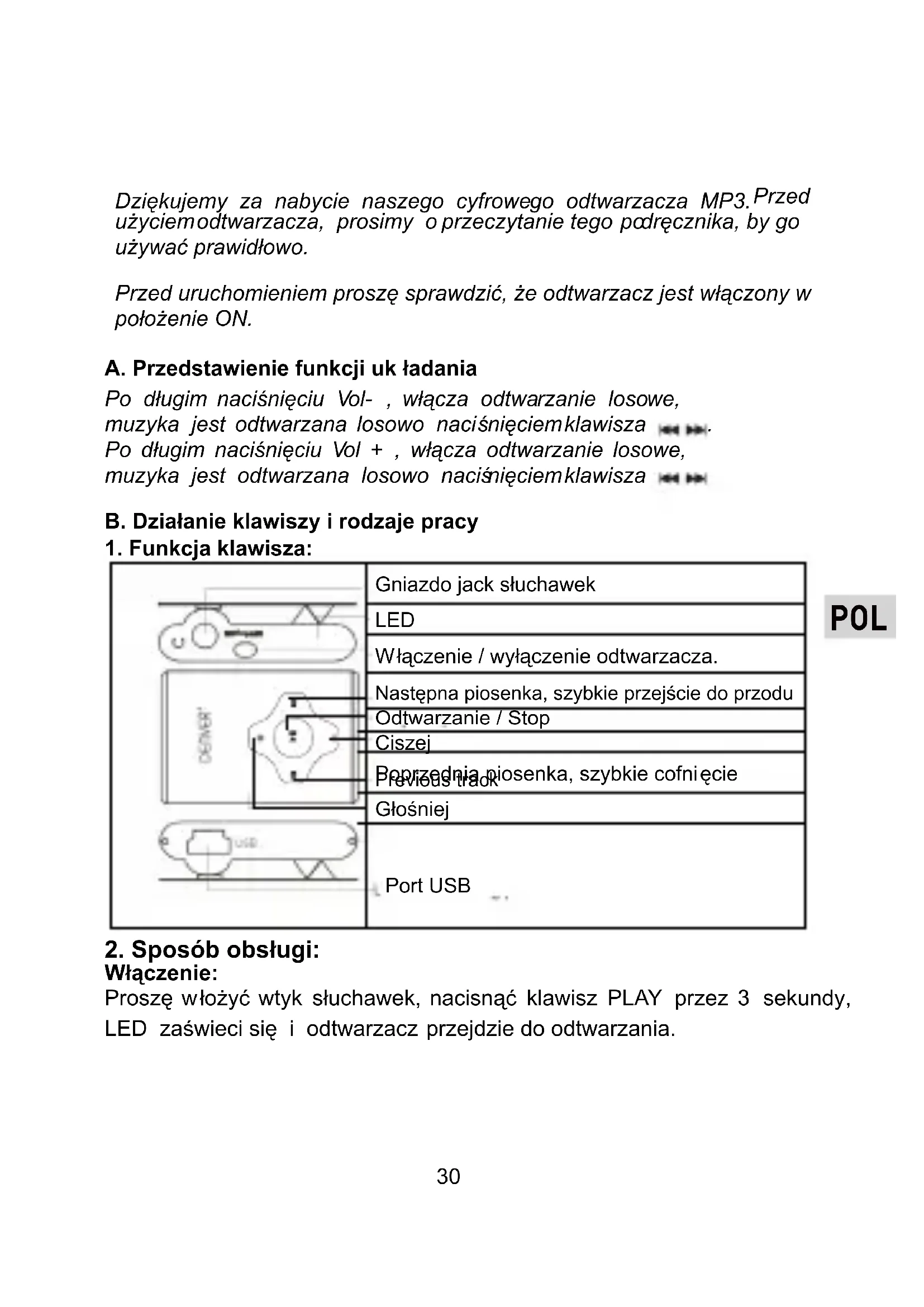 Proszę włożyć wtyk słuchawek, nacisnąć klawisz PLAY przez 3 sekundy, LED zaświeci się i odtwarzacz przejdzie do odtwarzania.