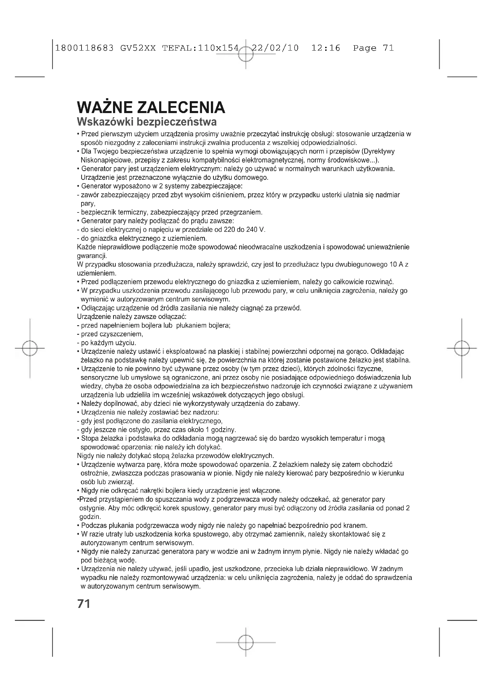 - Urządzenia nie należy używać, jeśli upadło, jest uszkodzone, przecieka lub działa nieprawidłowo. W żadnym wypadku nie należy rozmontowywać urządzenia: w celu uniknięcia zagrożenia, należy je oddać do sprawdzenia w autoryzowanym centrum serwisowym. 1800118683 GV52XX TEFAL:110x154 22/02/10 12:16 Page 7172
